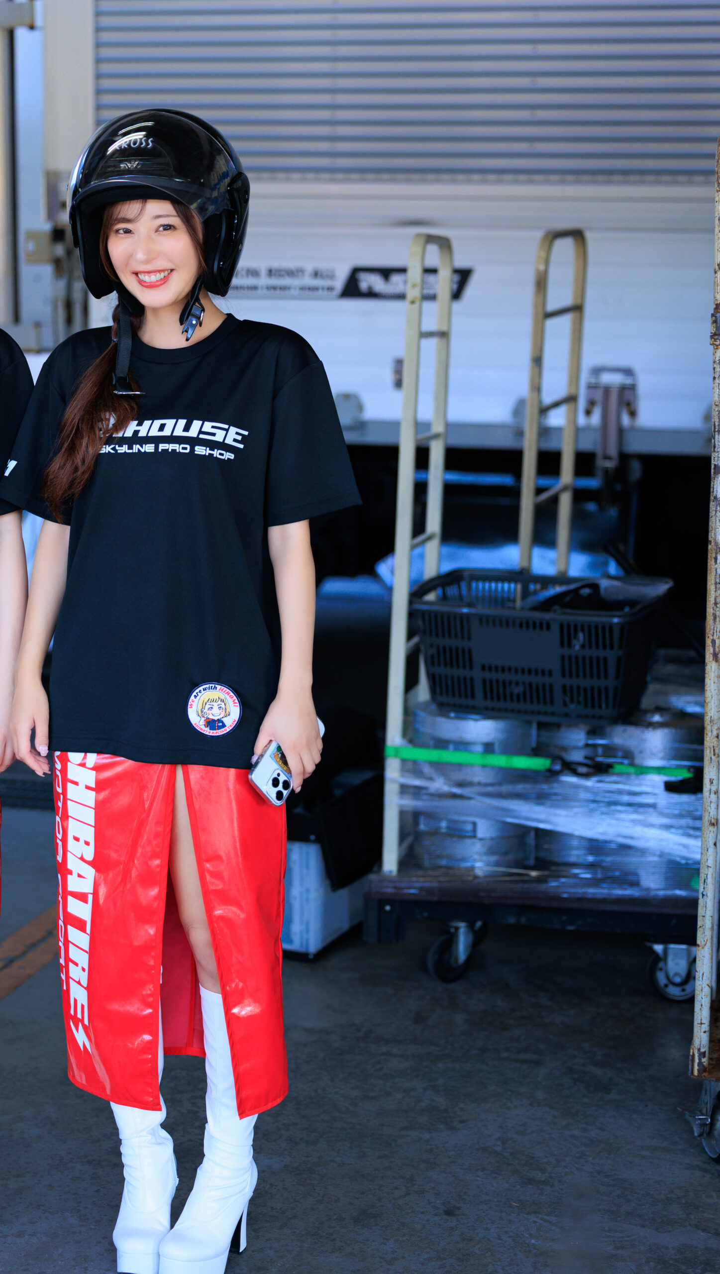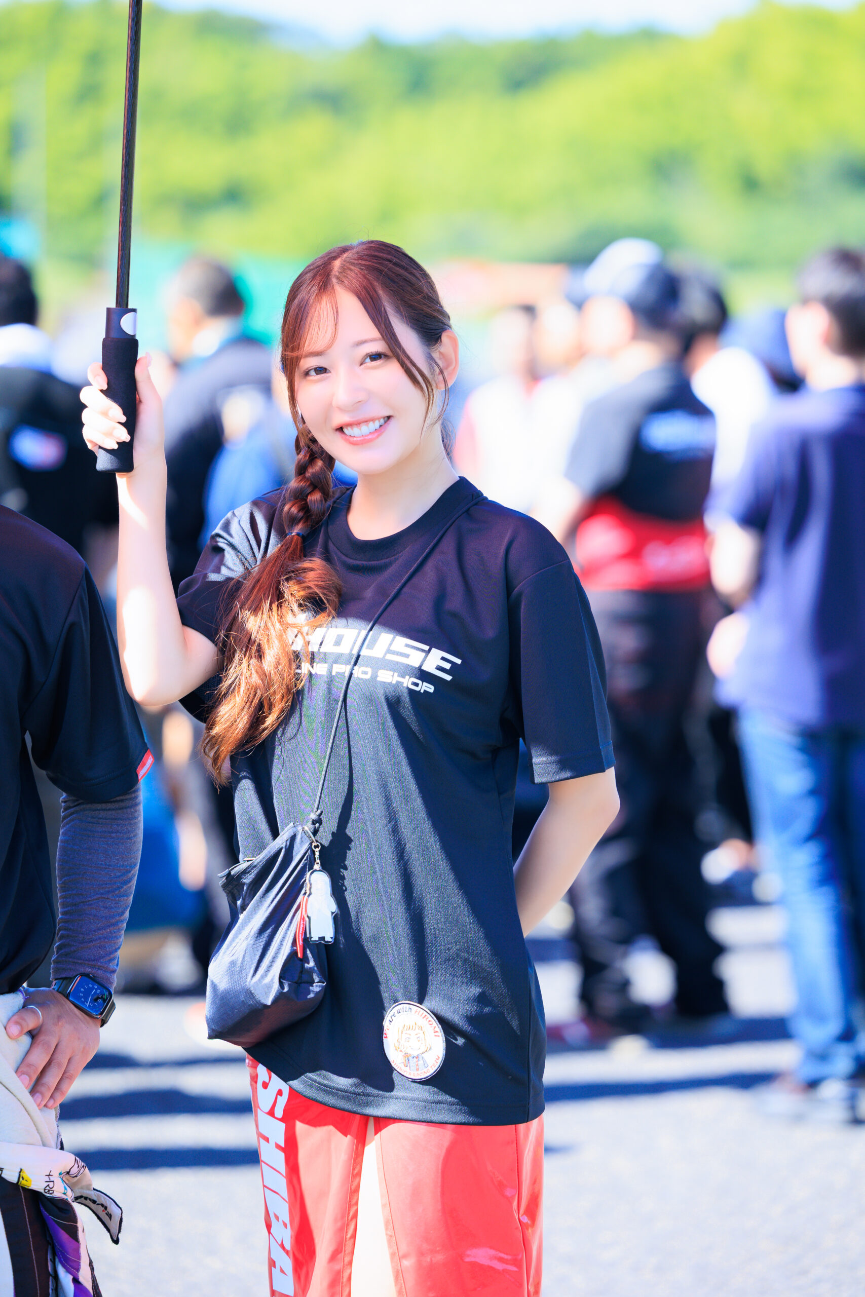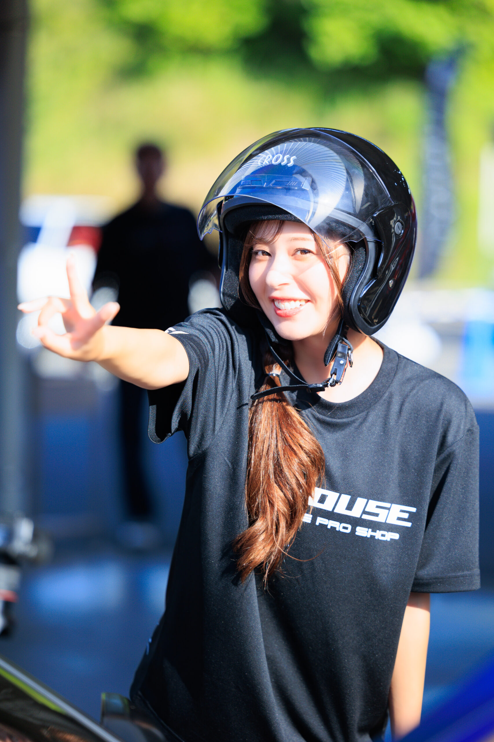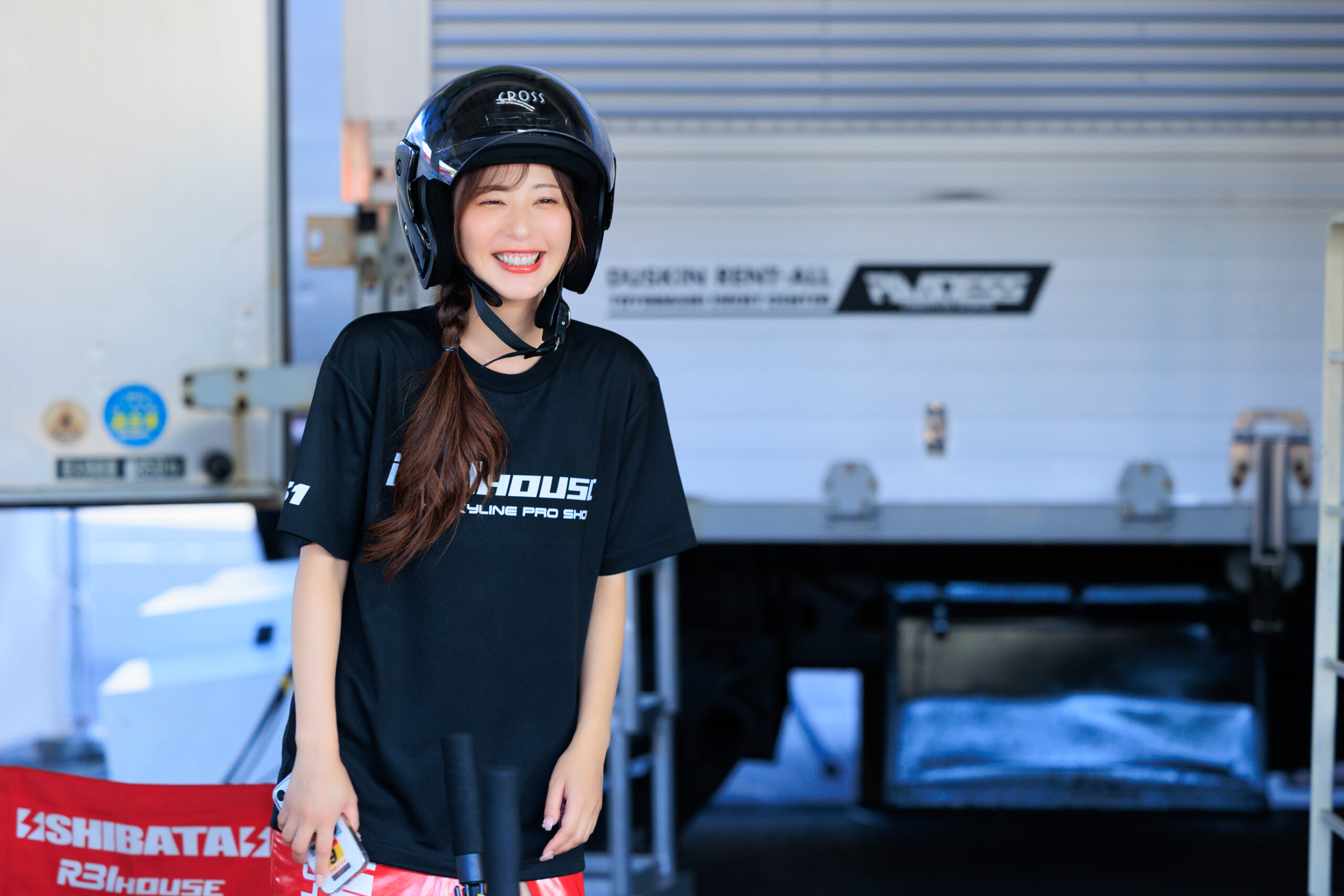 サーキットの熱気と、ももさんの穏やかな笑顔が絶妙なコントラストでした。