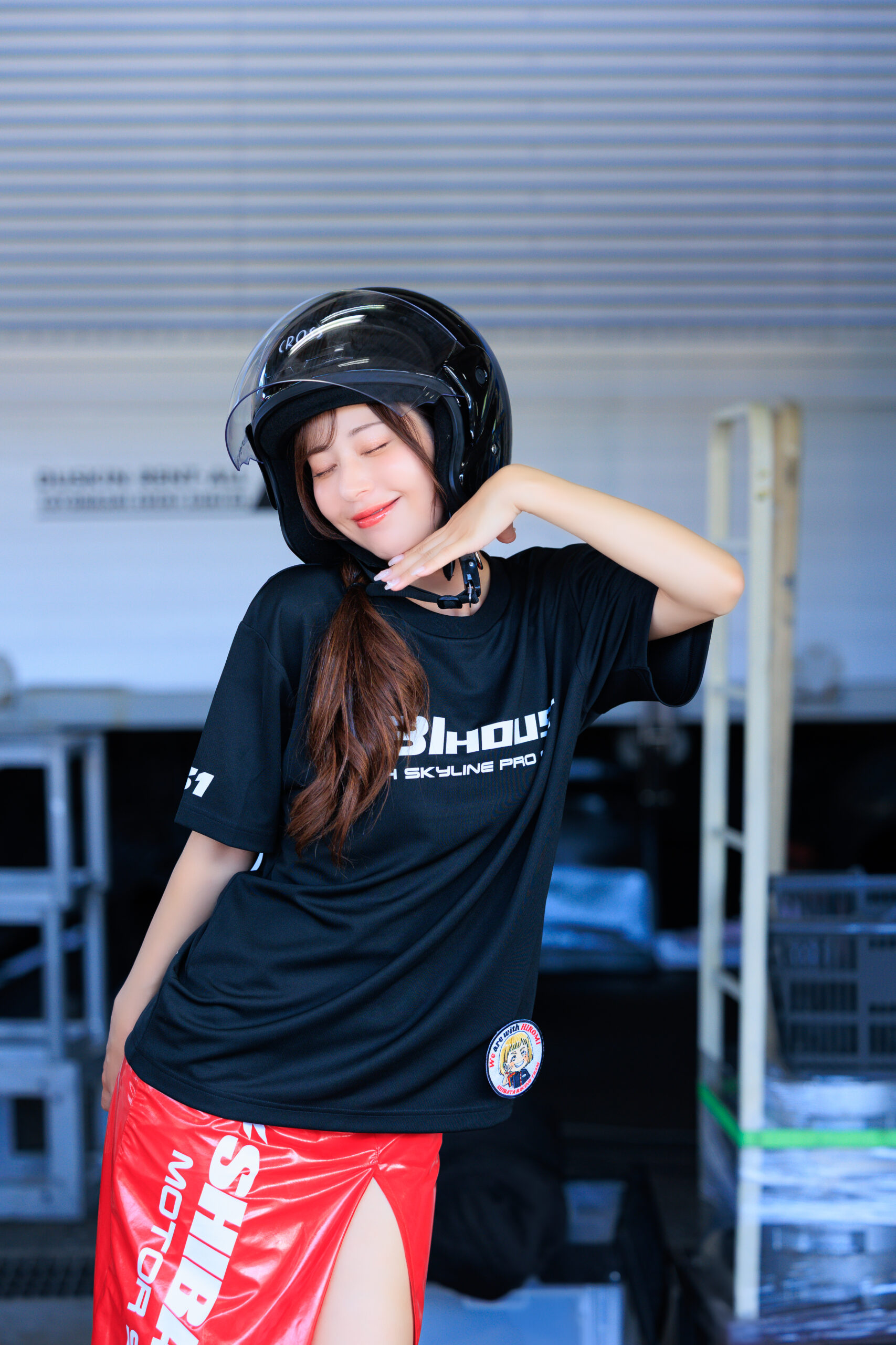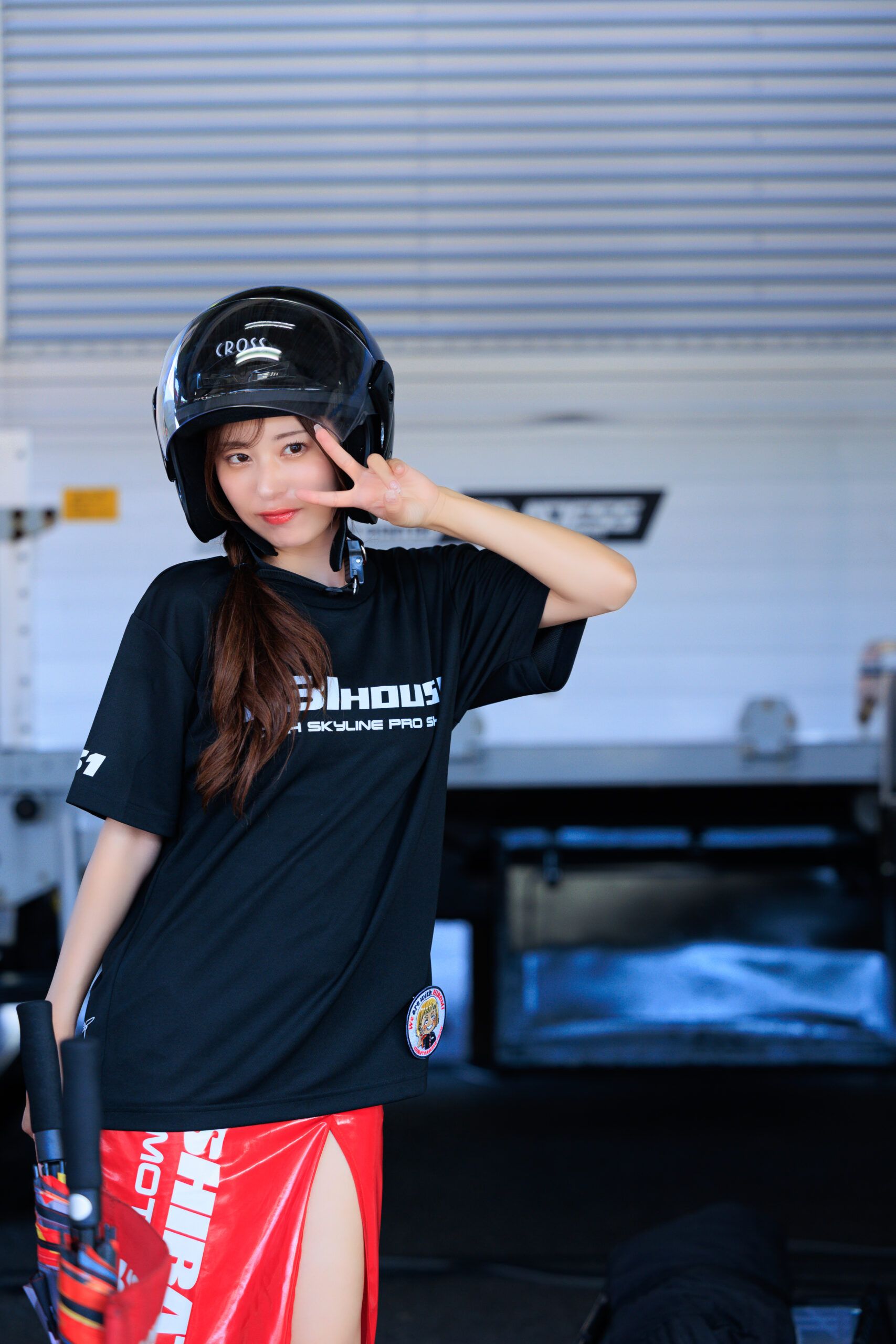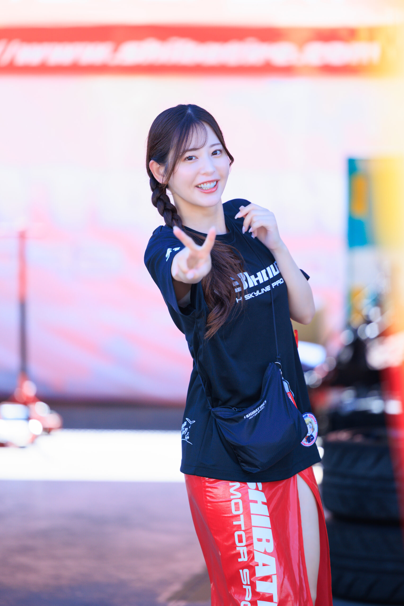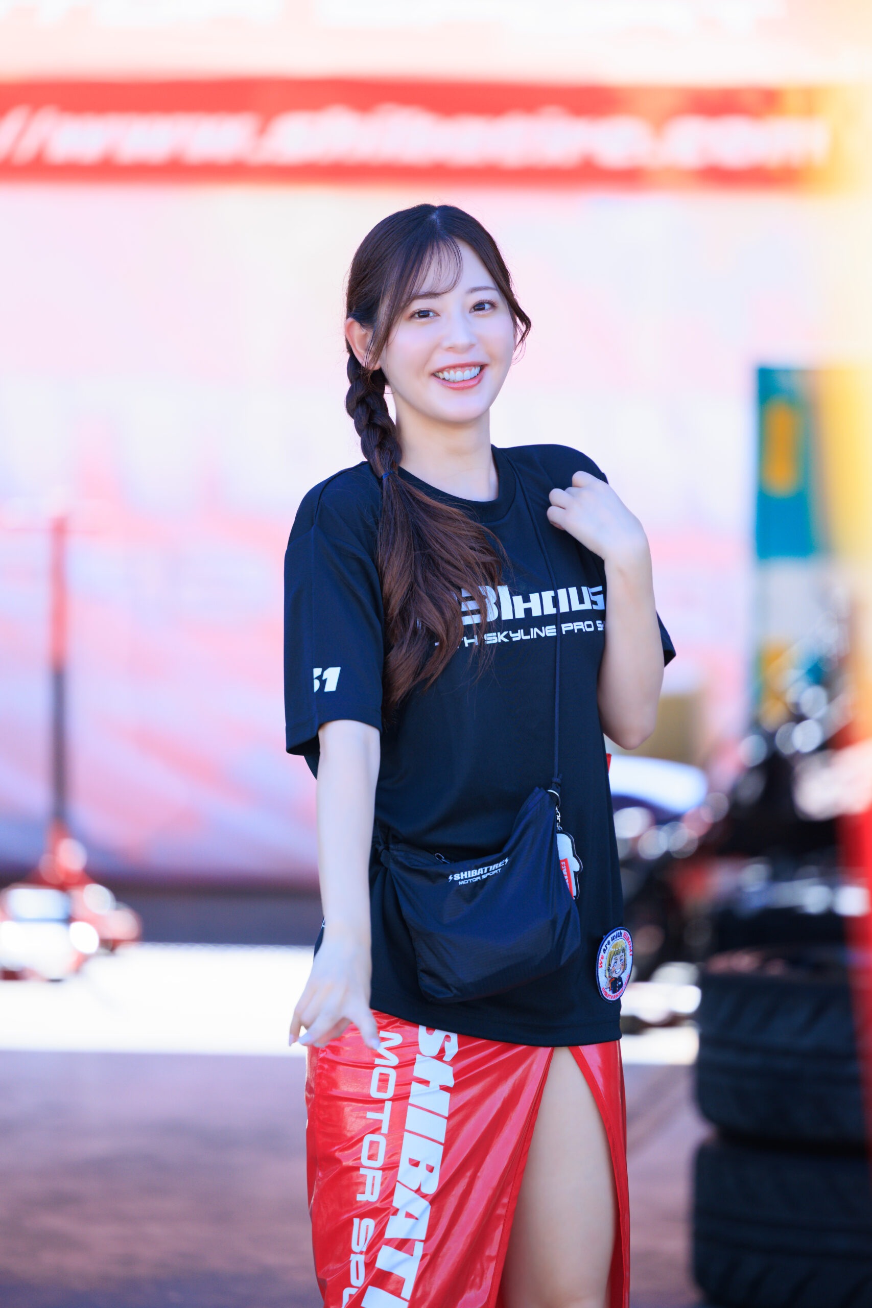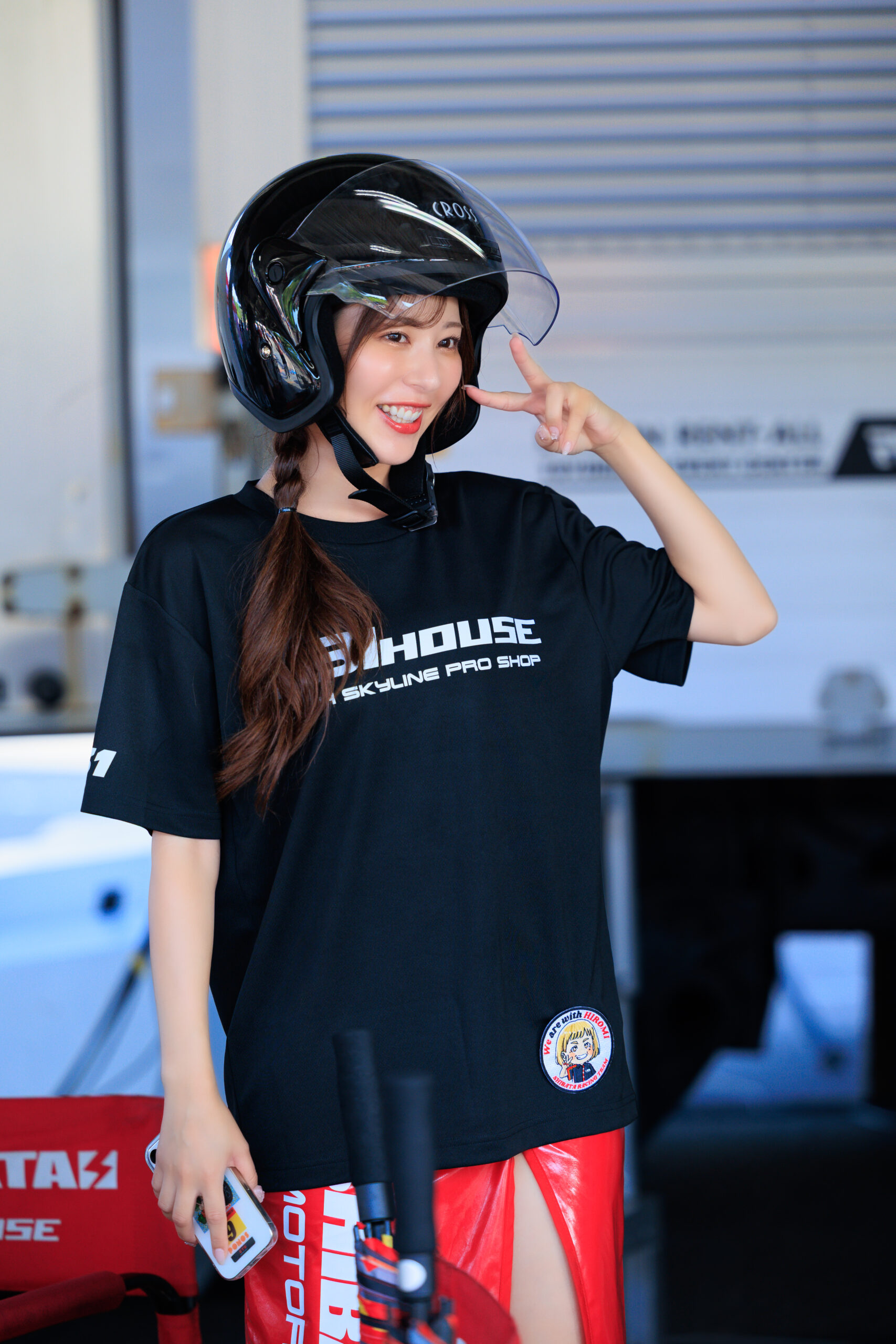 サーキットの熱気と、ももさんの穏やかな笑顔が絶妙なコントラストでした。
