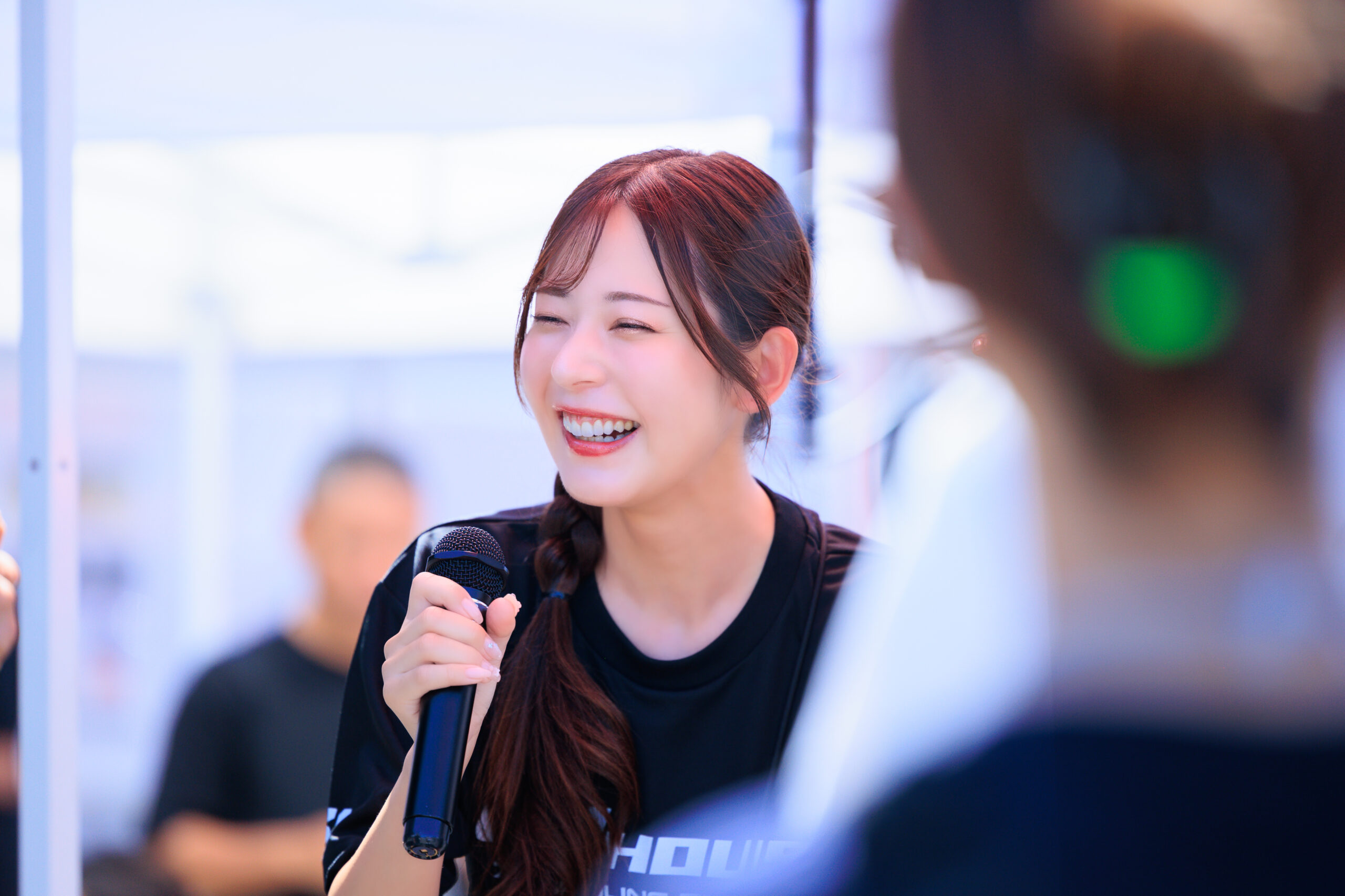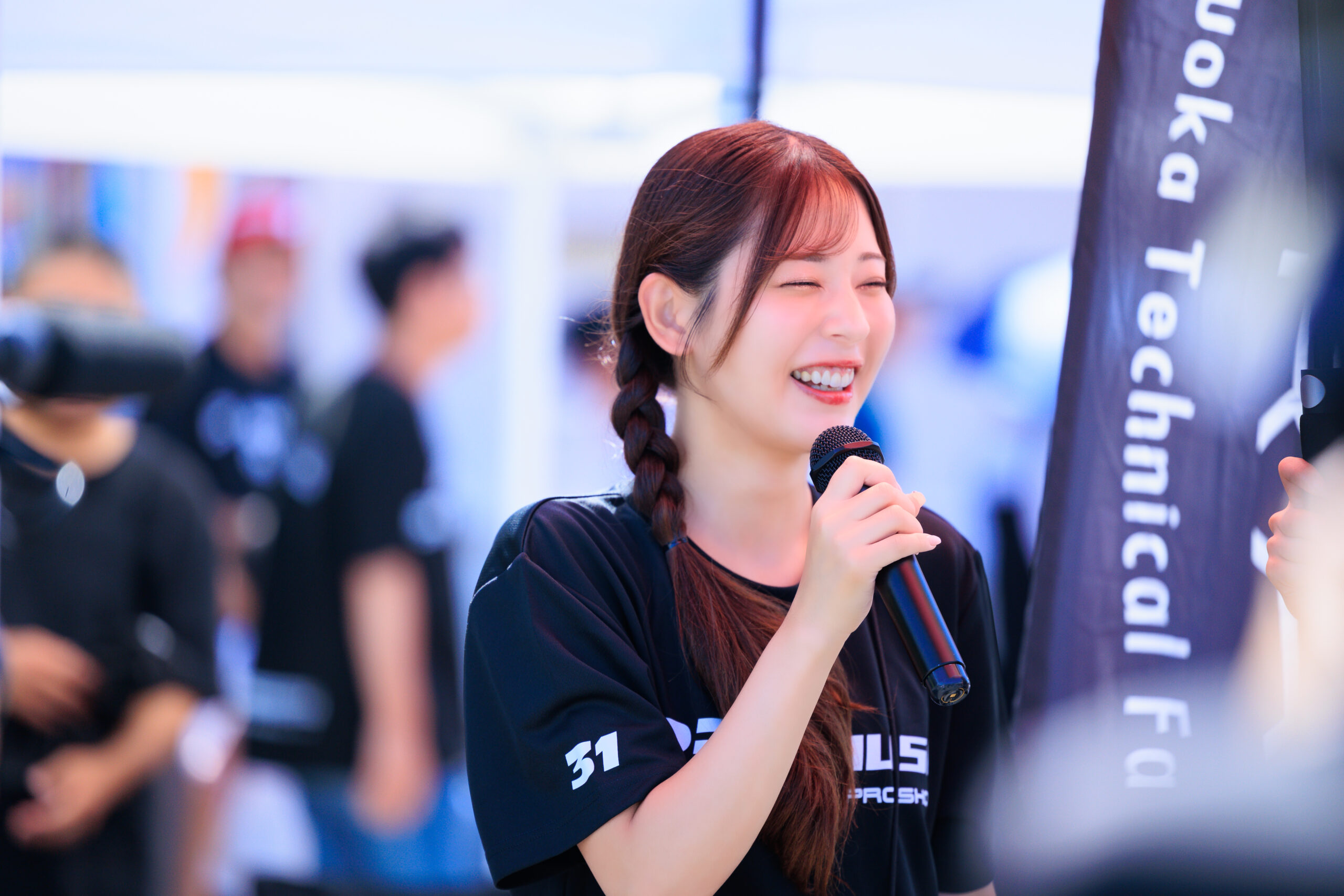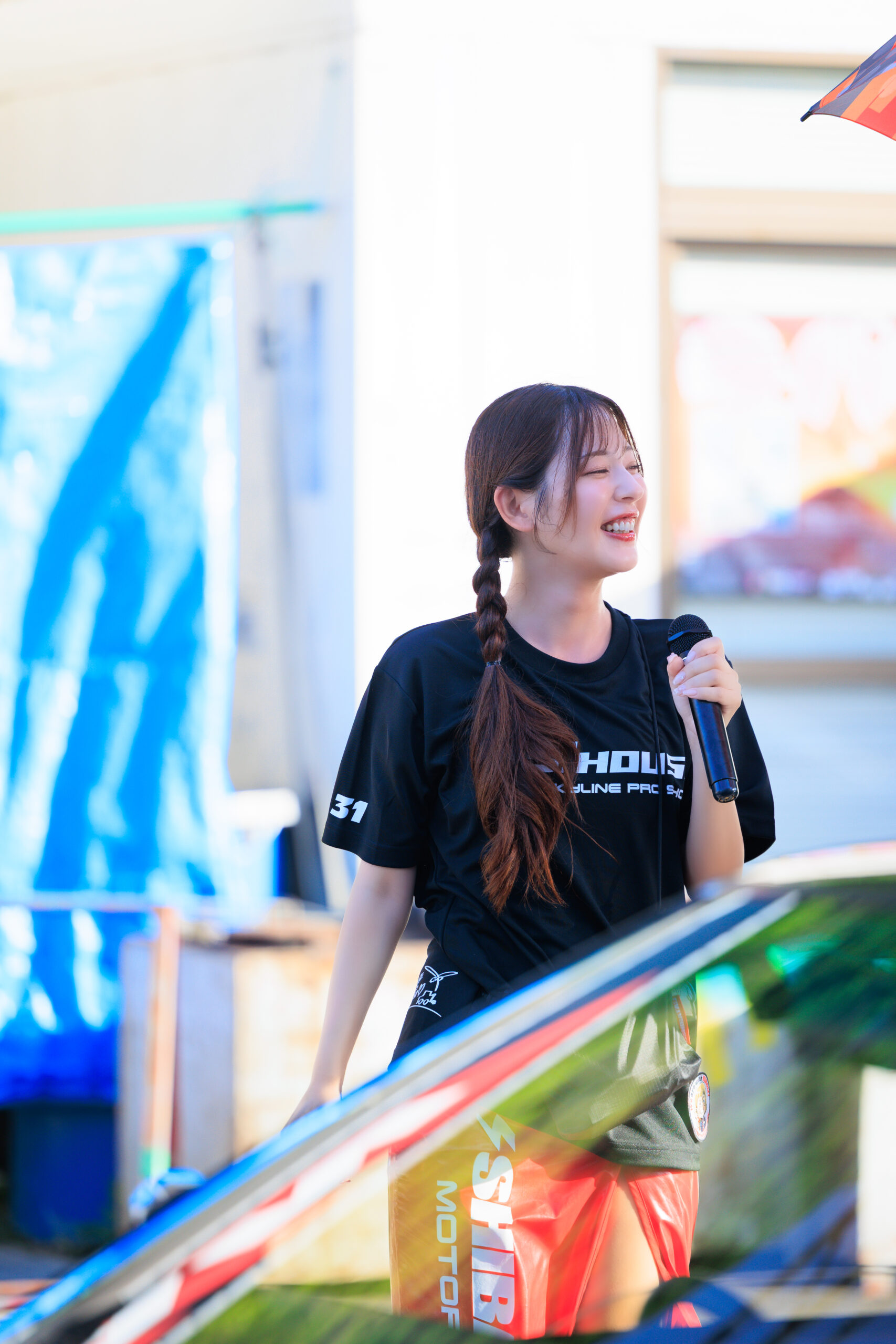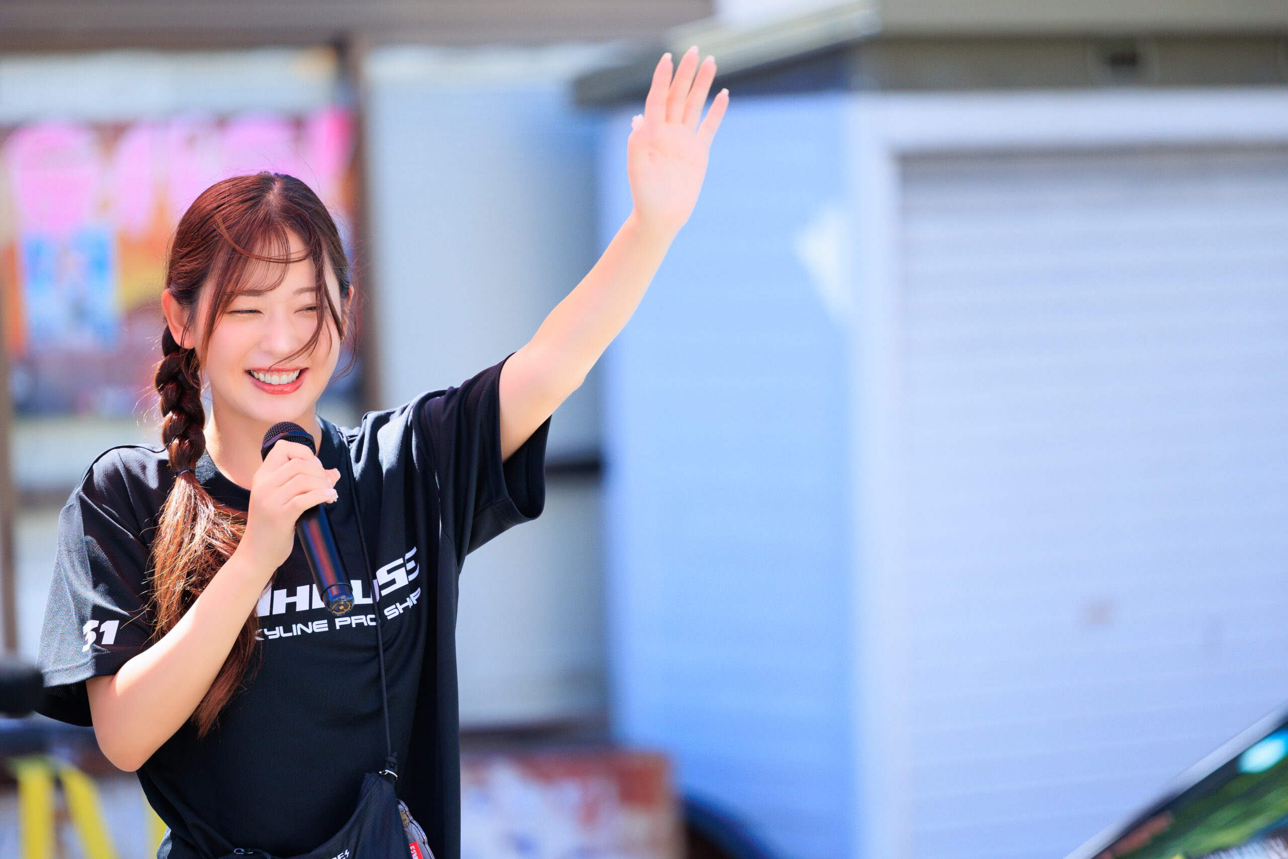 ももさんの笑顔がとても柔らかく、温かさを感じます。マイクを持ちながら楽しそうに話す姿から、場を盛り上げている雰囲気。サーキットの熱気と笑顔が重なって、見る人に元気を届ける一枚。