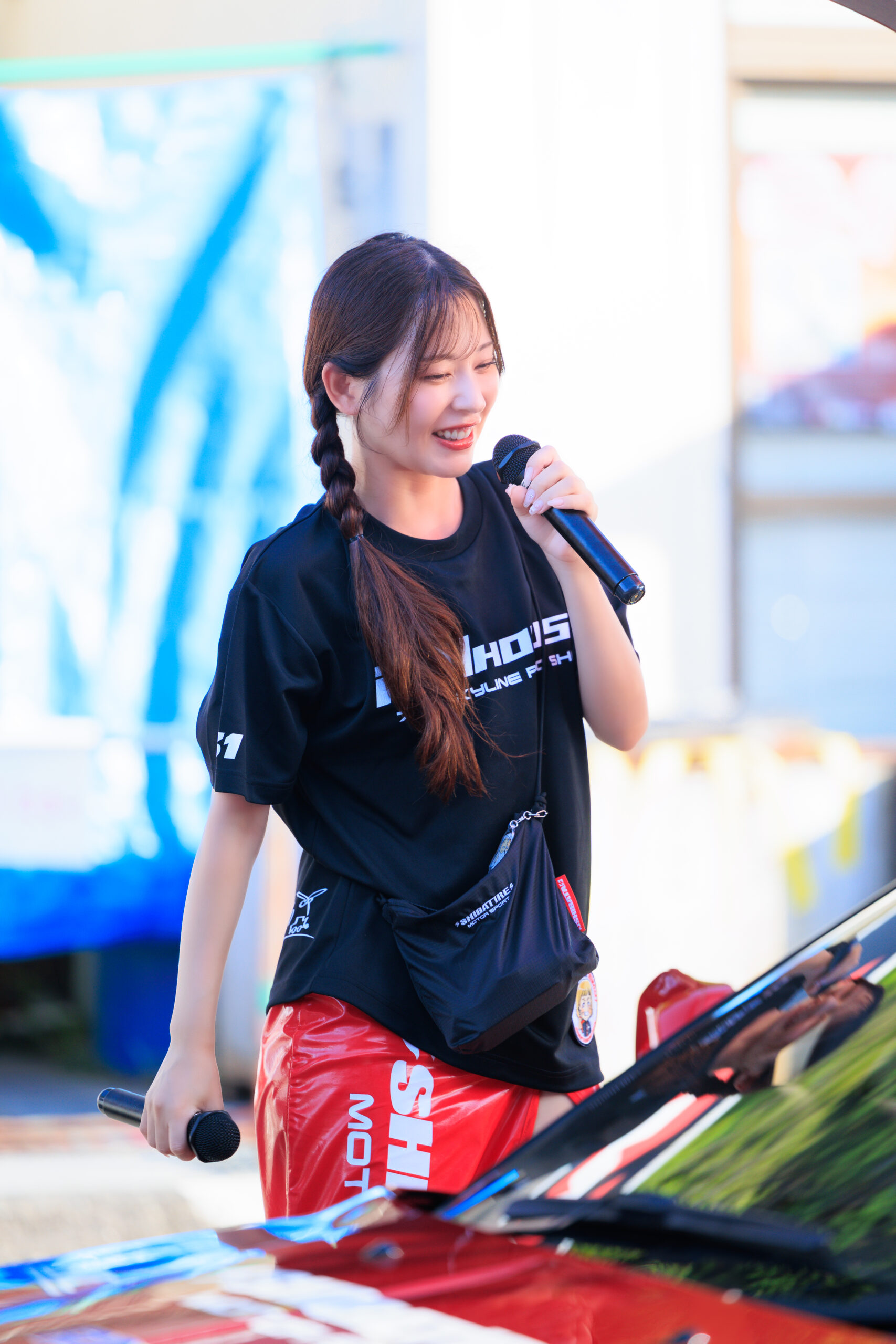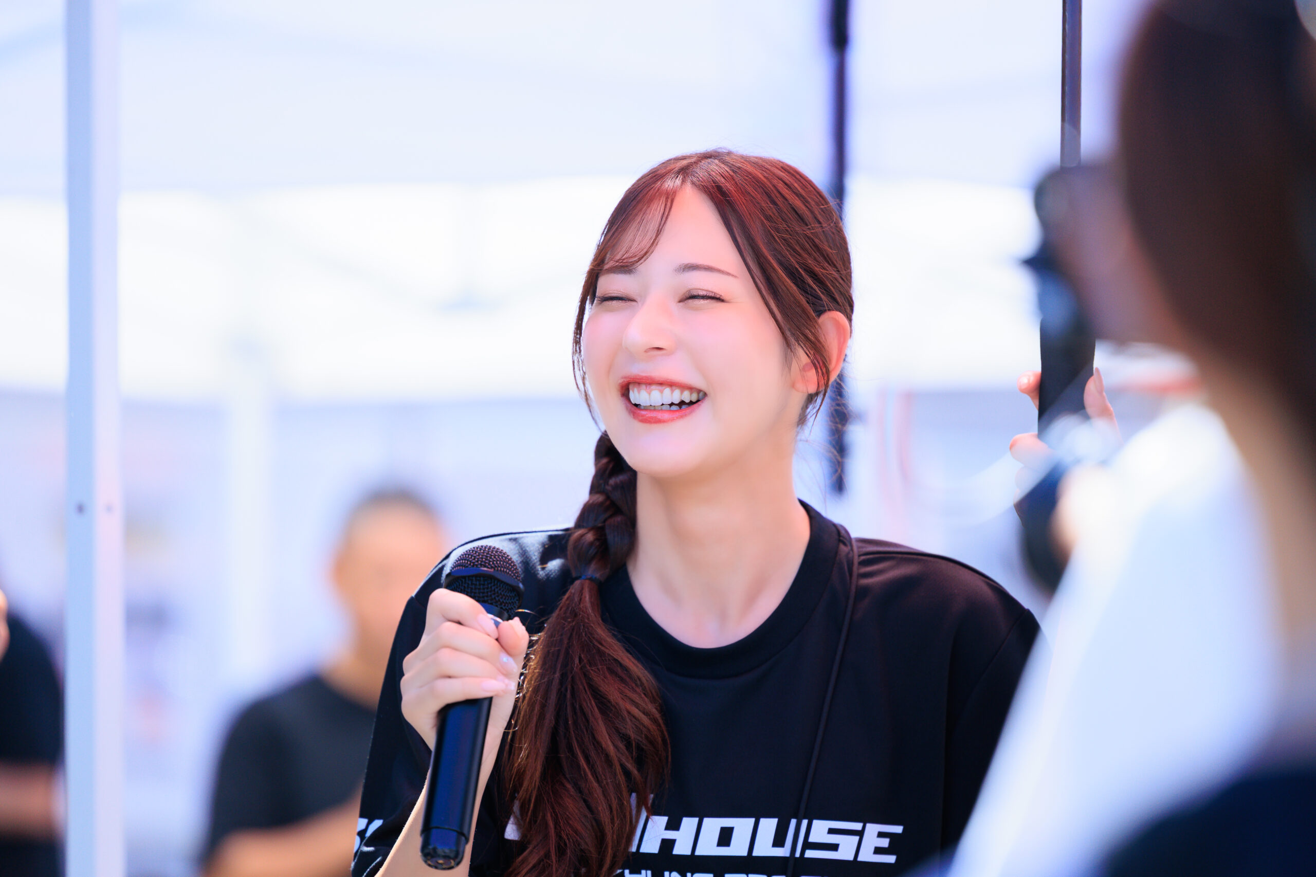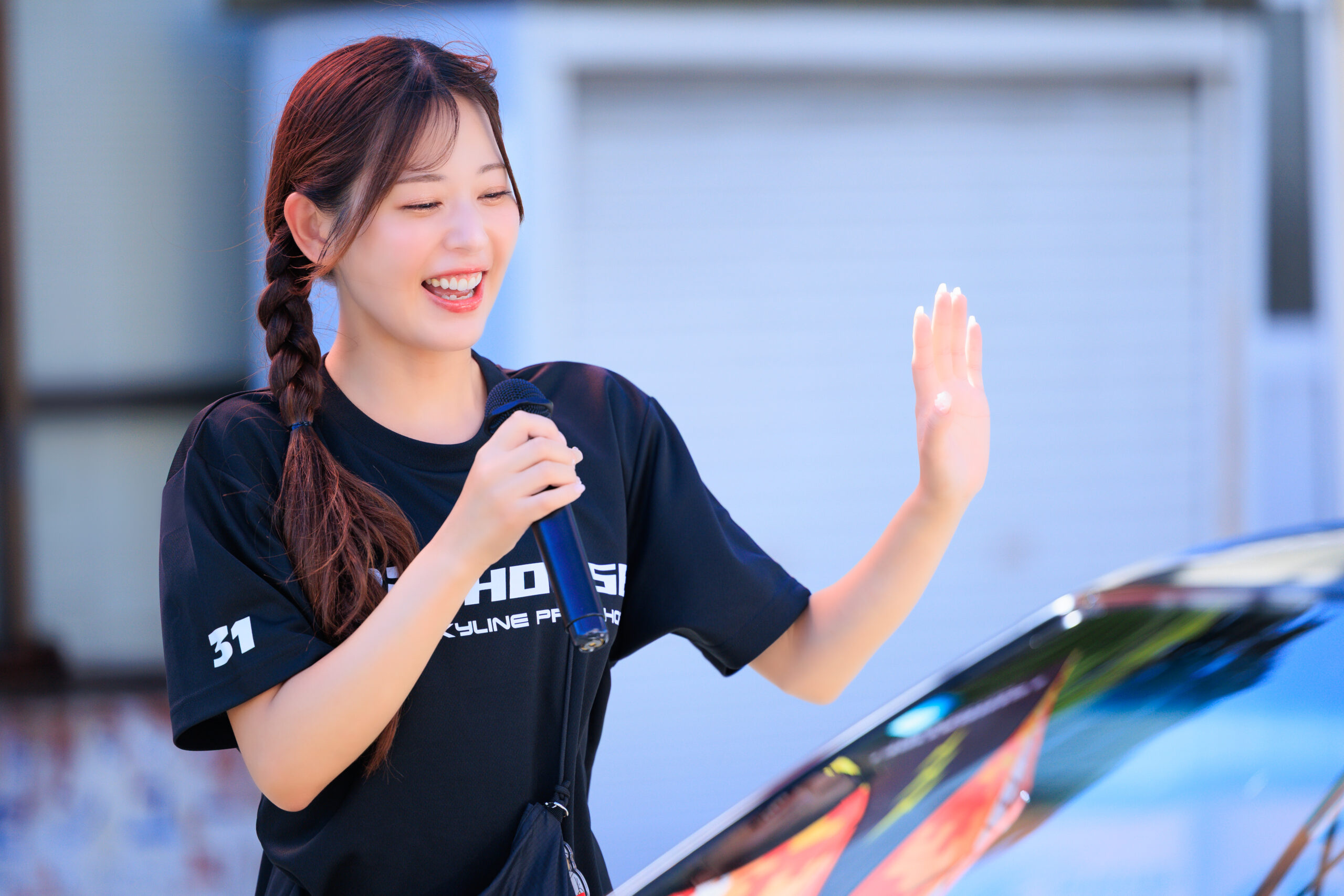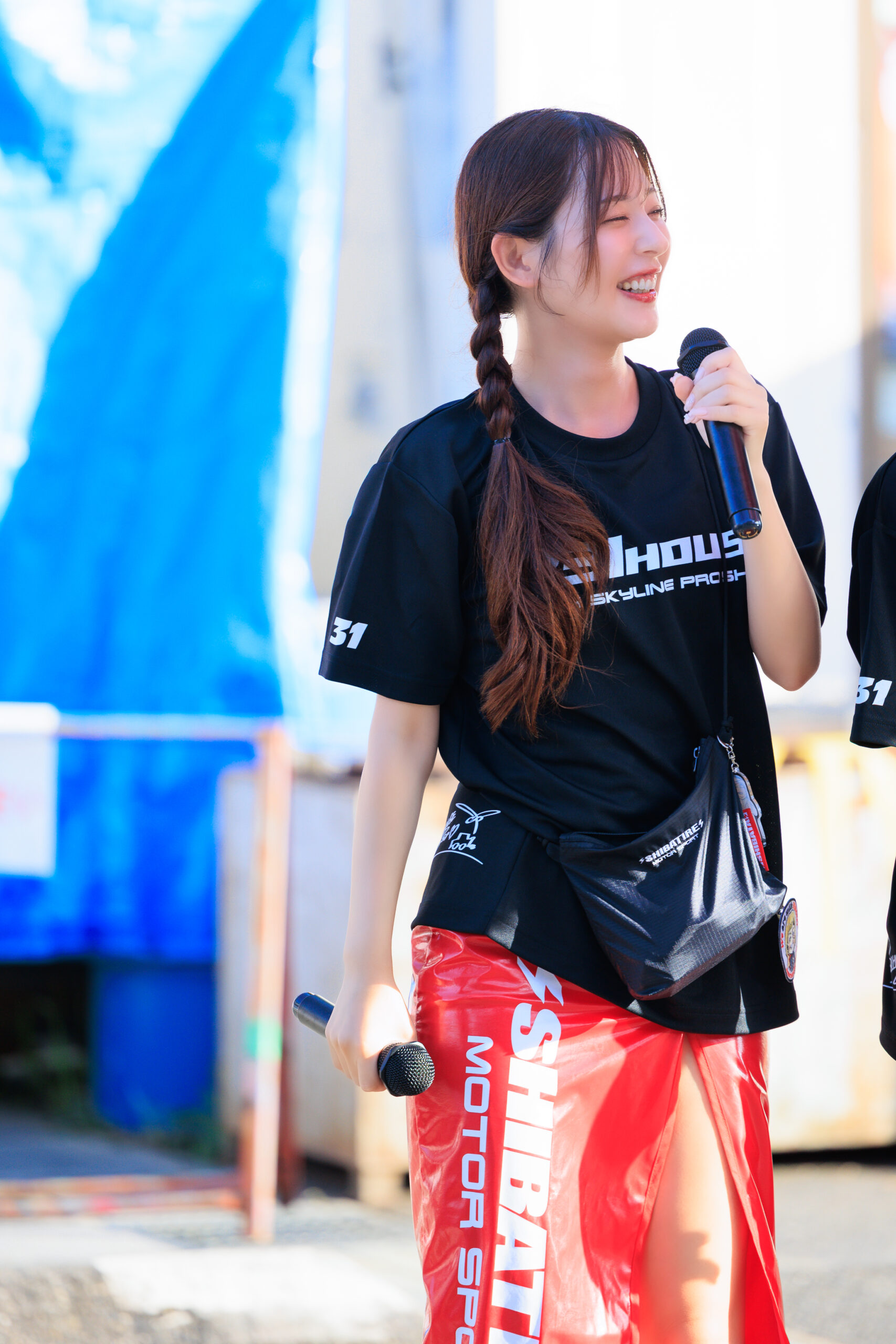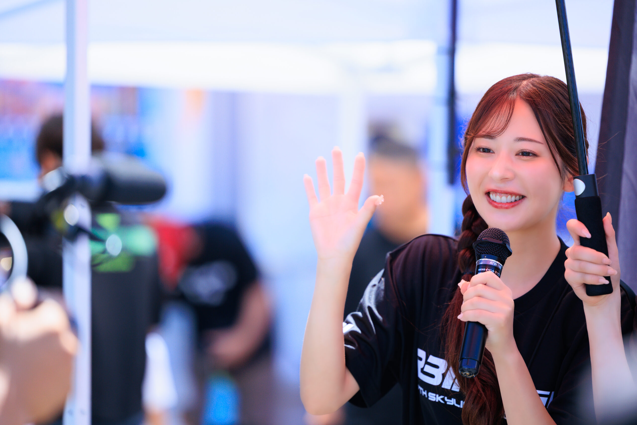 ももさんの笑顔がとても柔らかく、温かさを感じます。マイクを持ちながら楽しそうに話す姿から、場を盛り上げている雰囲気。サーキットの熱気と笑顔が重なって、見る人に元気を届ける一枚。