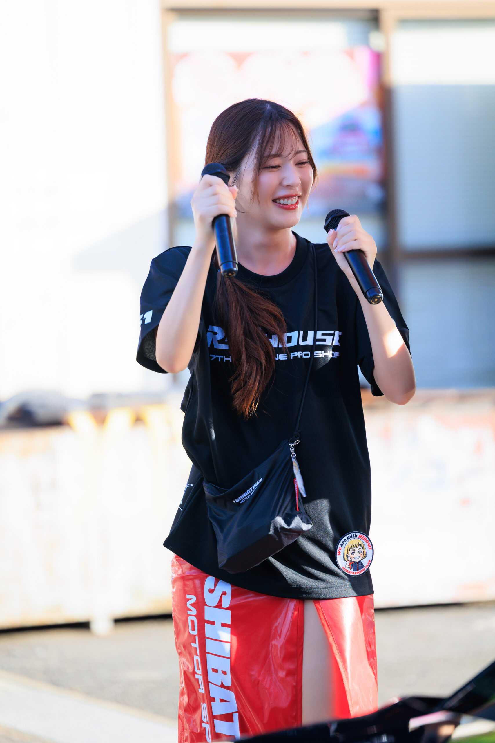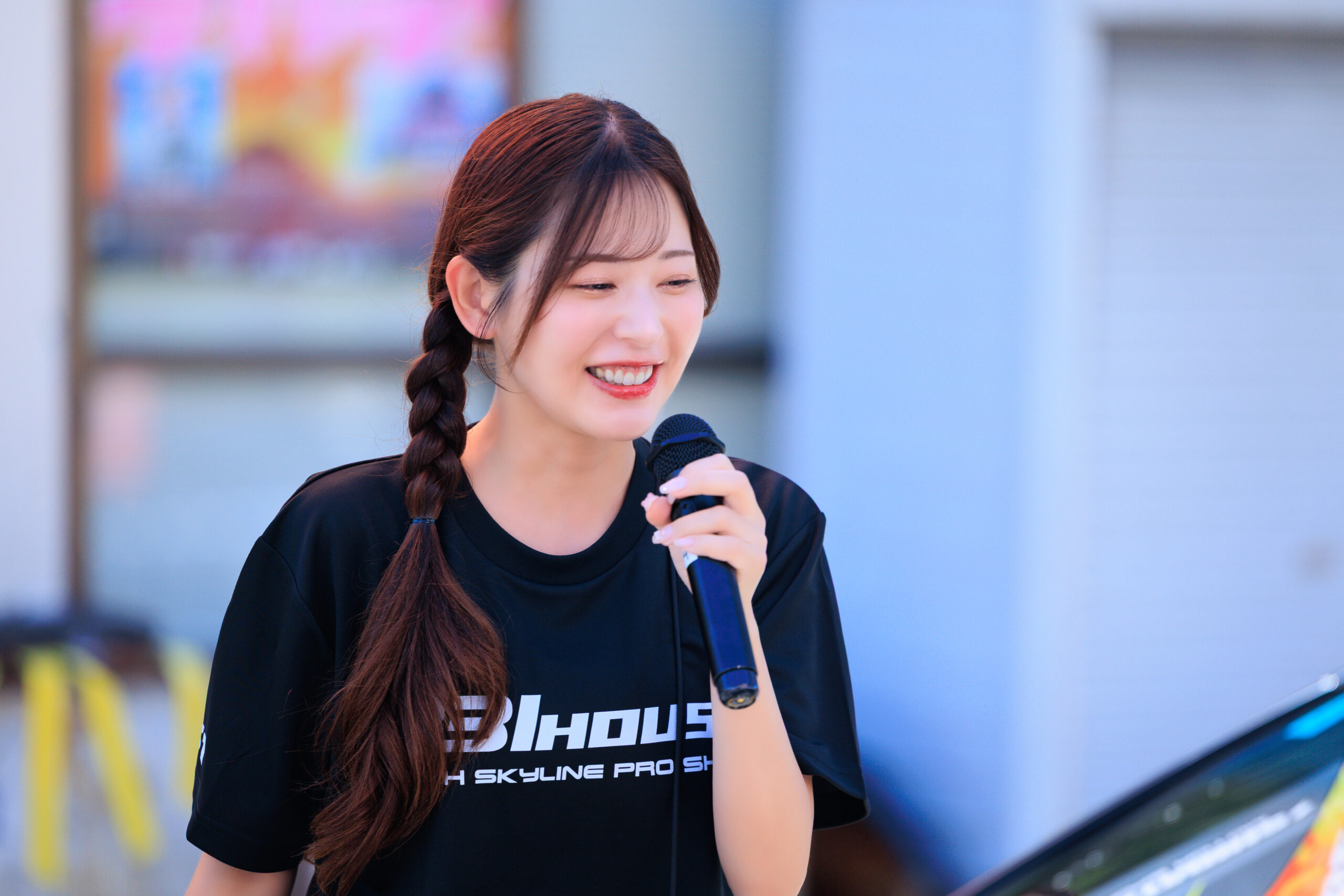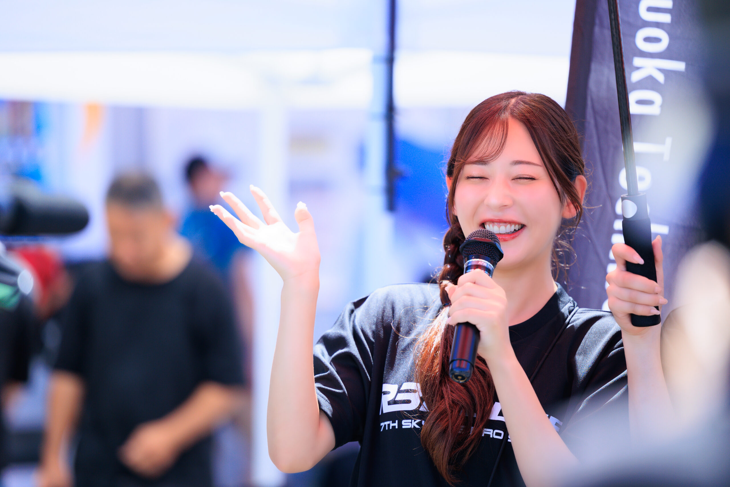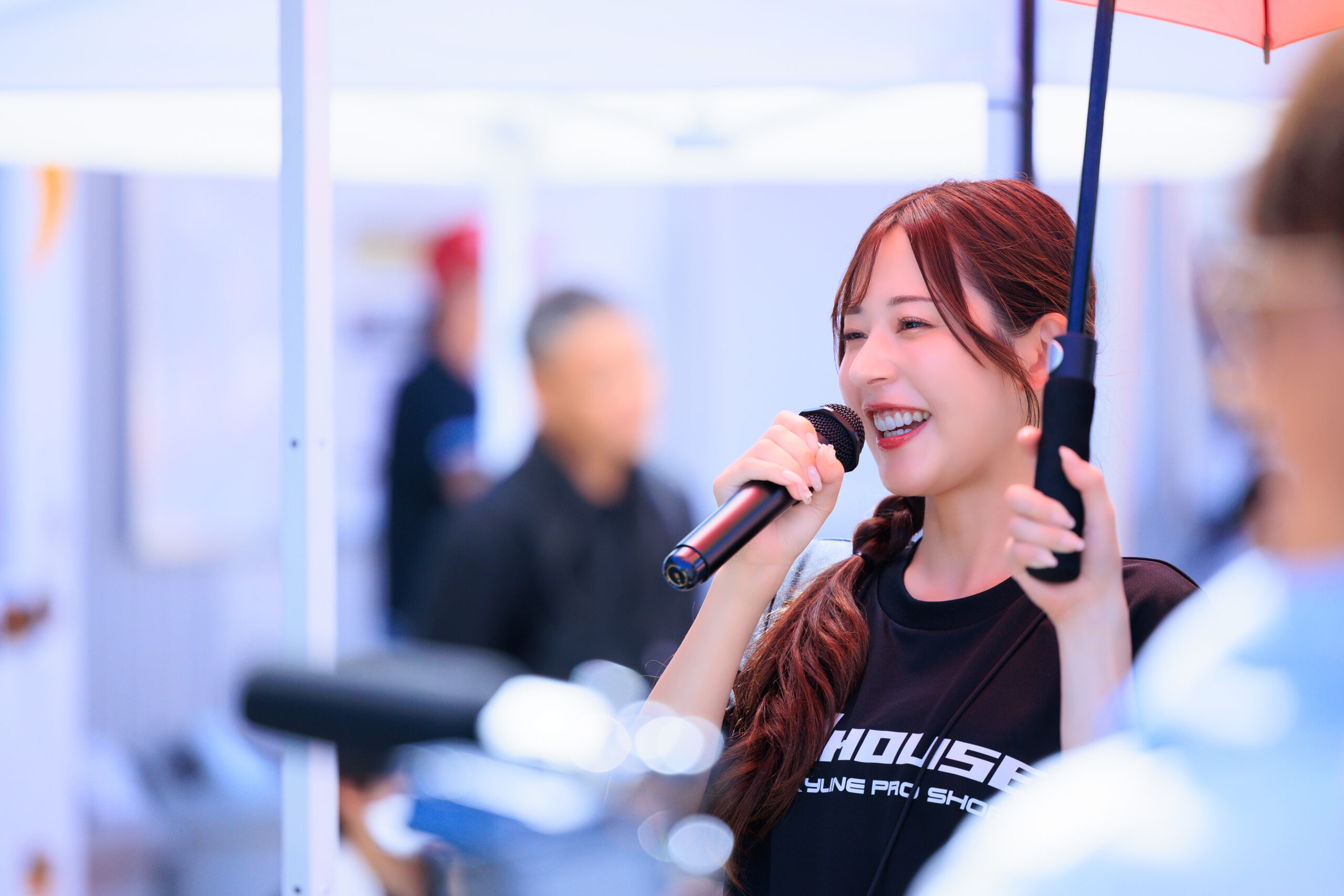 ももさんの笑顔がとても柔らかく、温かさを感じます。マイクを持ちながら楽しそうに話す姿から、場を盛り上げている雰囲気。サーキットの熱気と笑顔が重なって、見る人に元気を届ける一枚。
