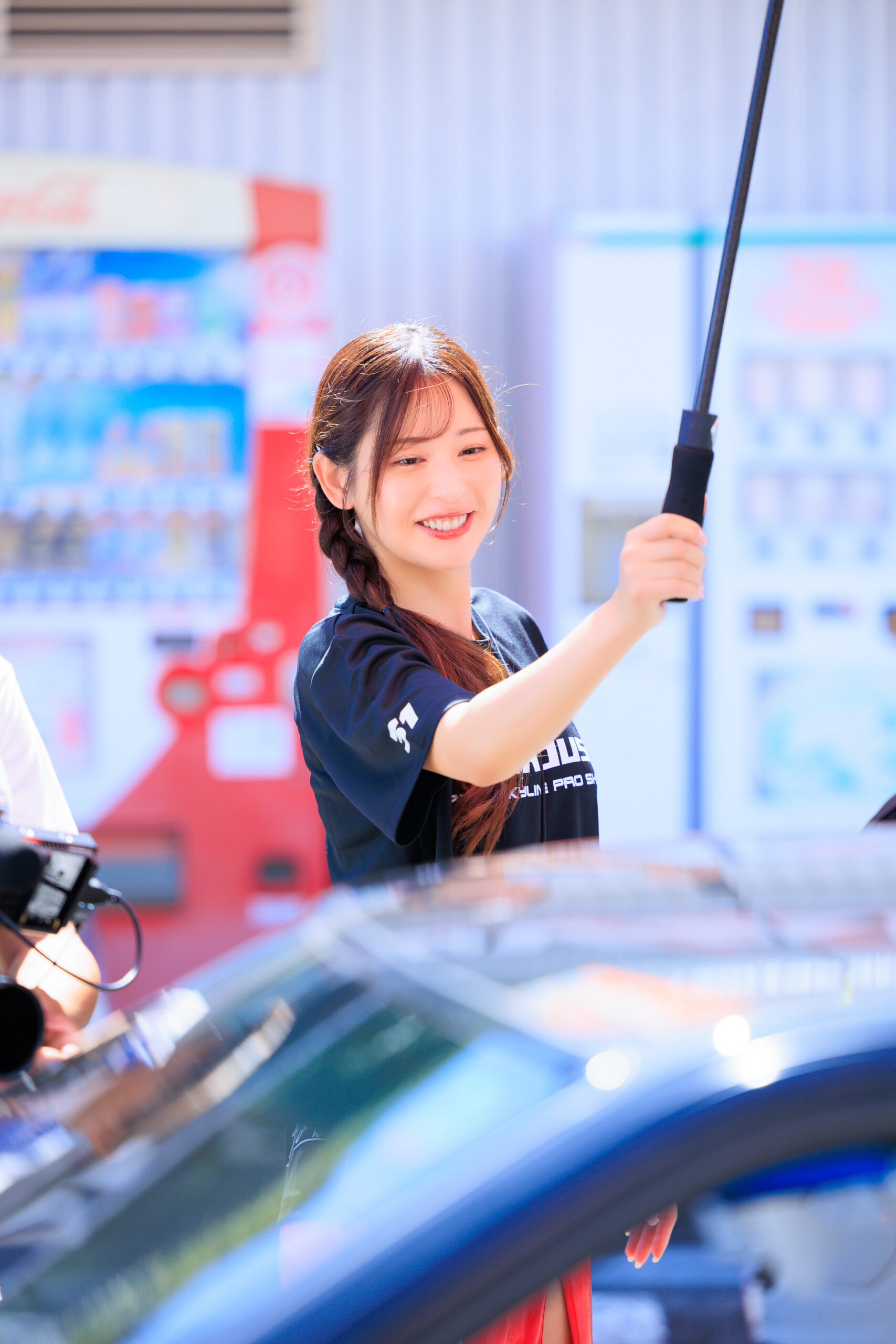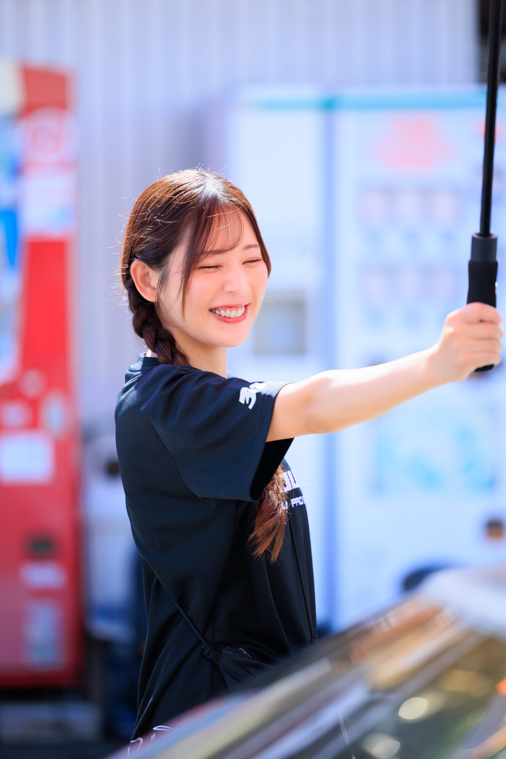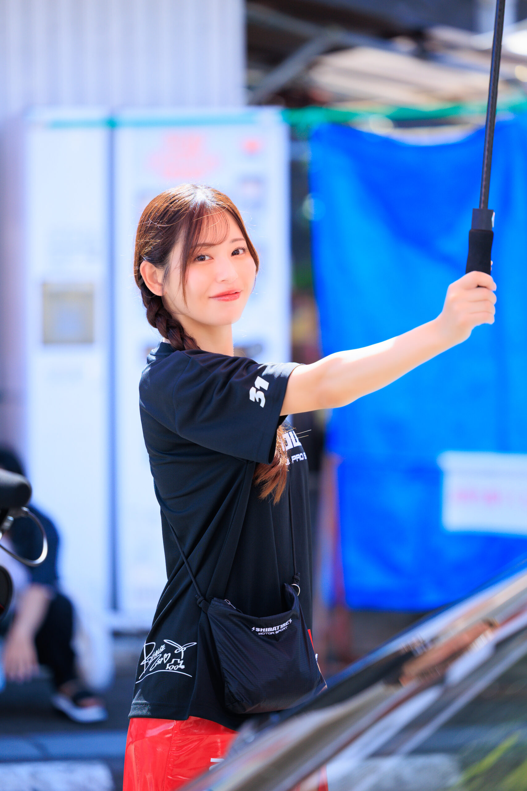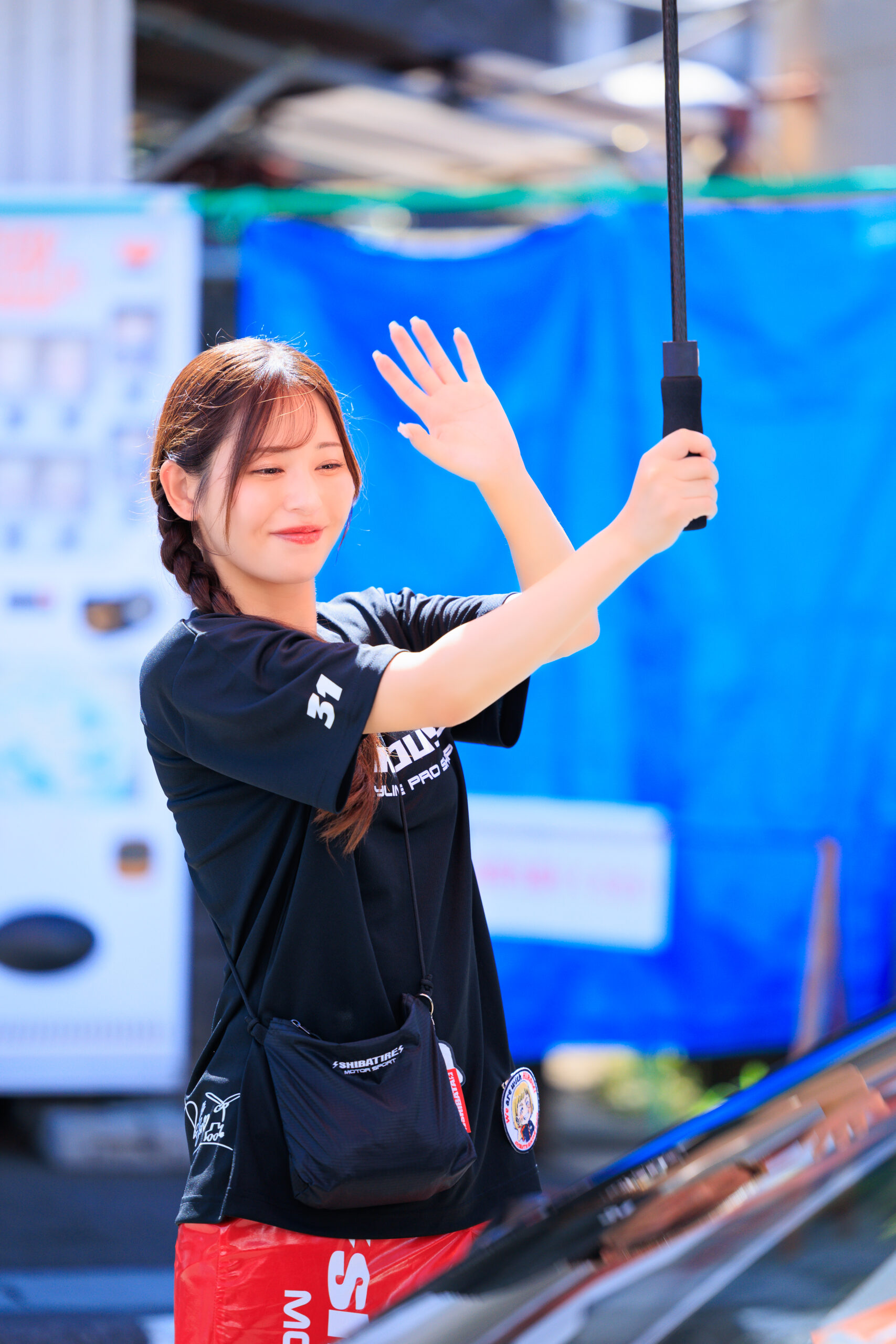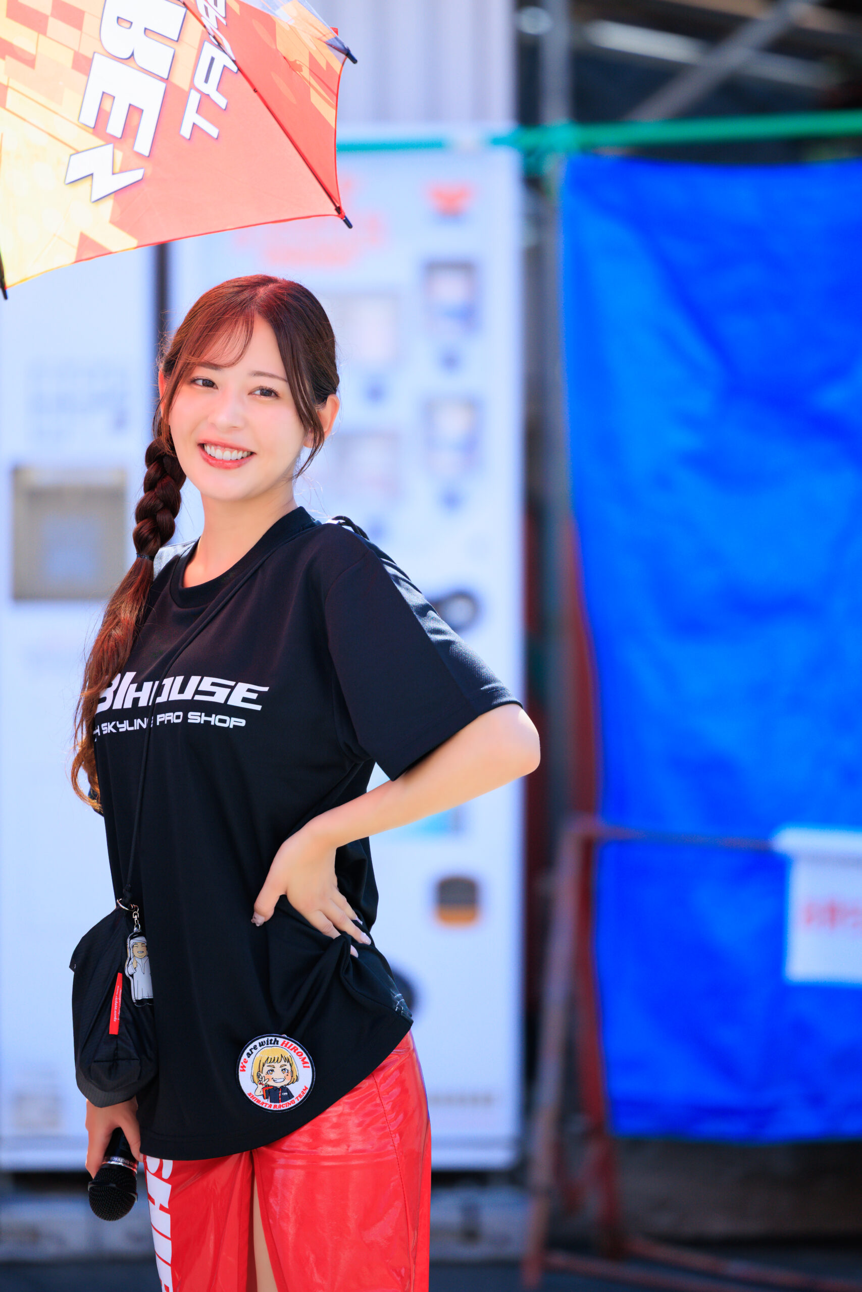 黒Tシャツとチームカラーの傘が映えて、スポーティーさと明るさが両立。サーキットの熱気の中で、爽やかさと親しみやすさが伝わってきますね。