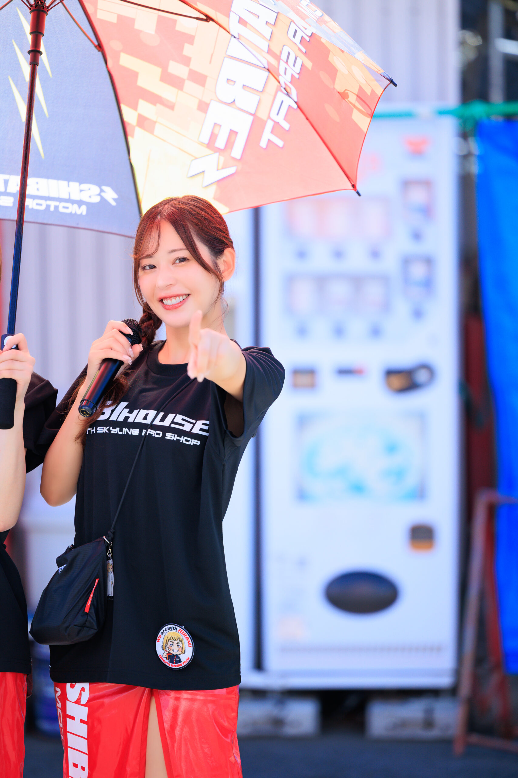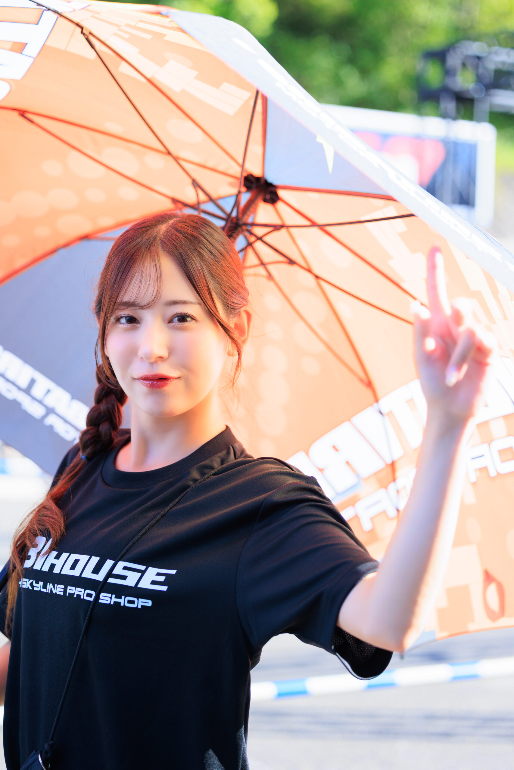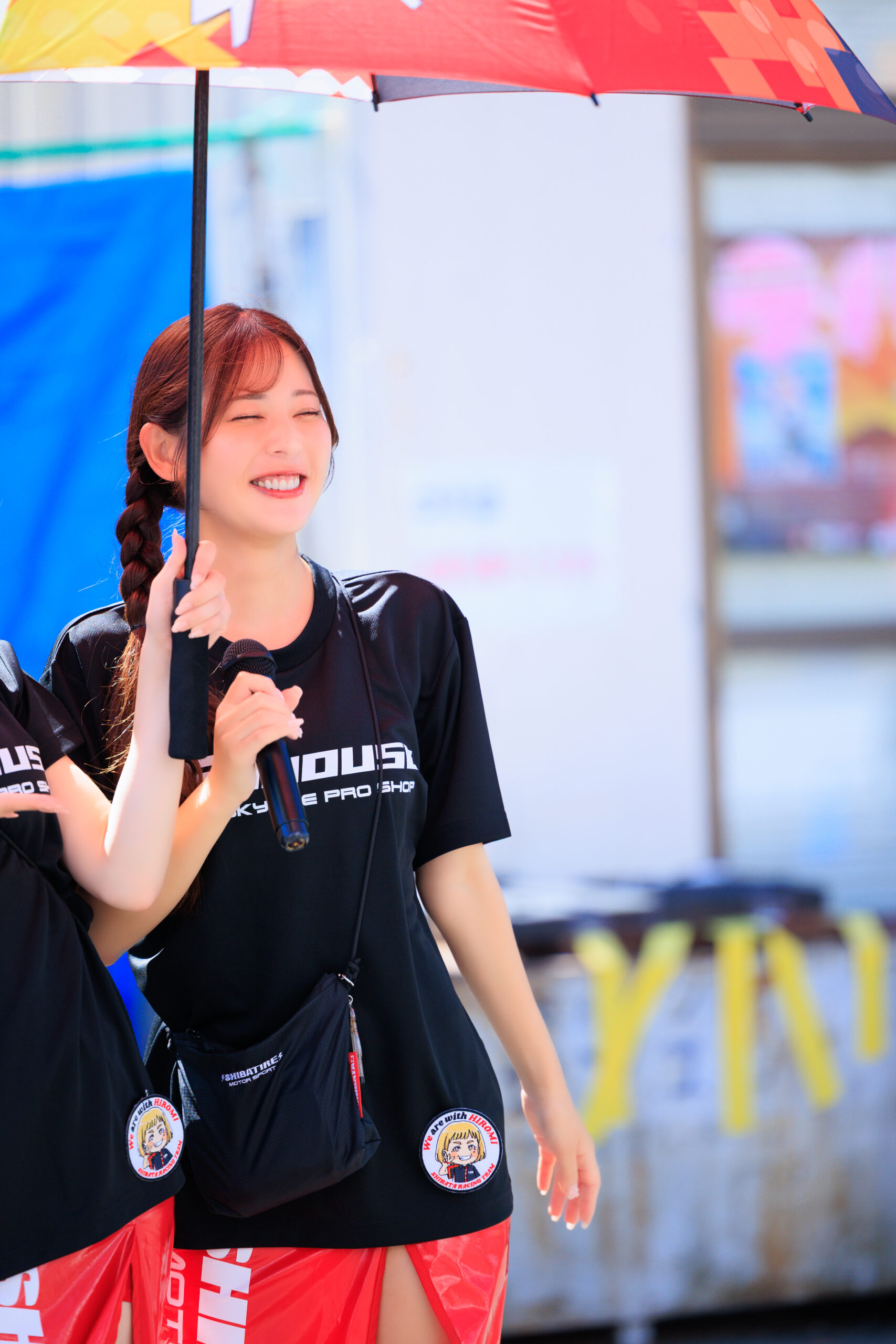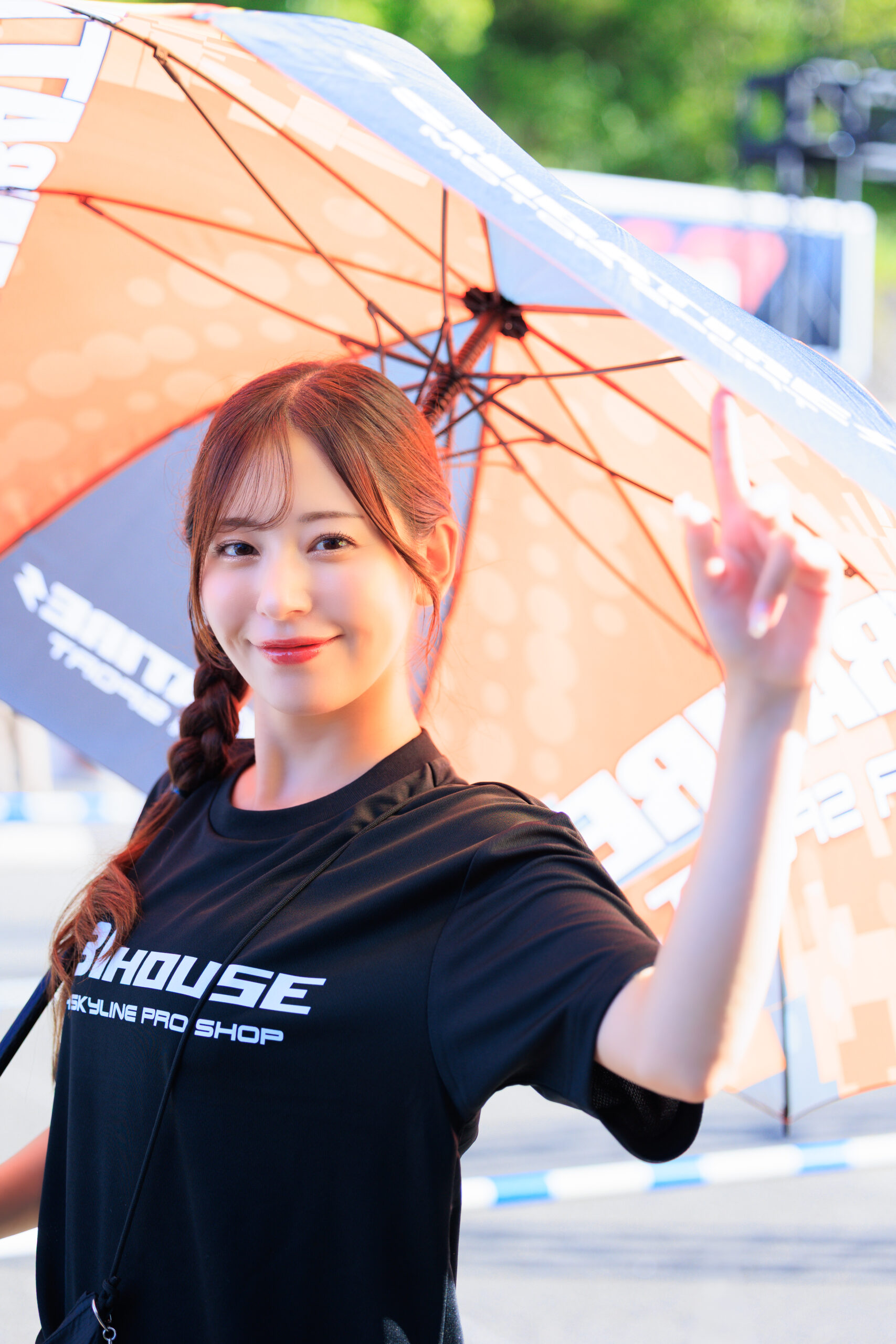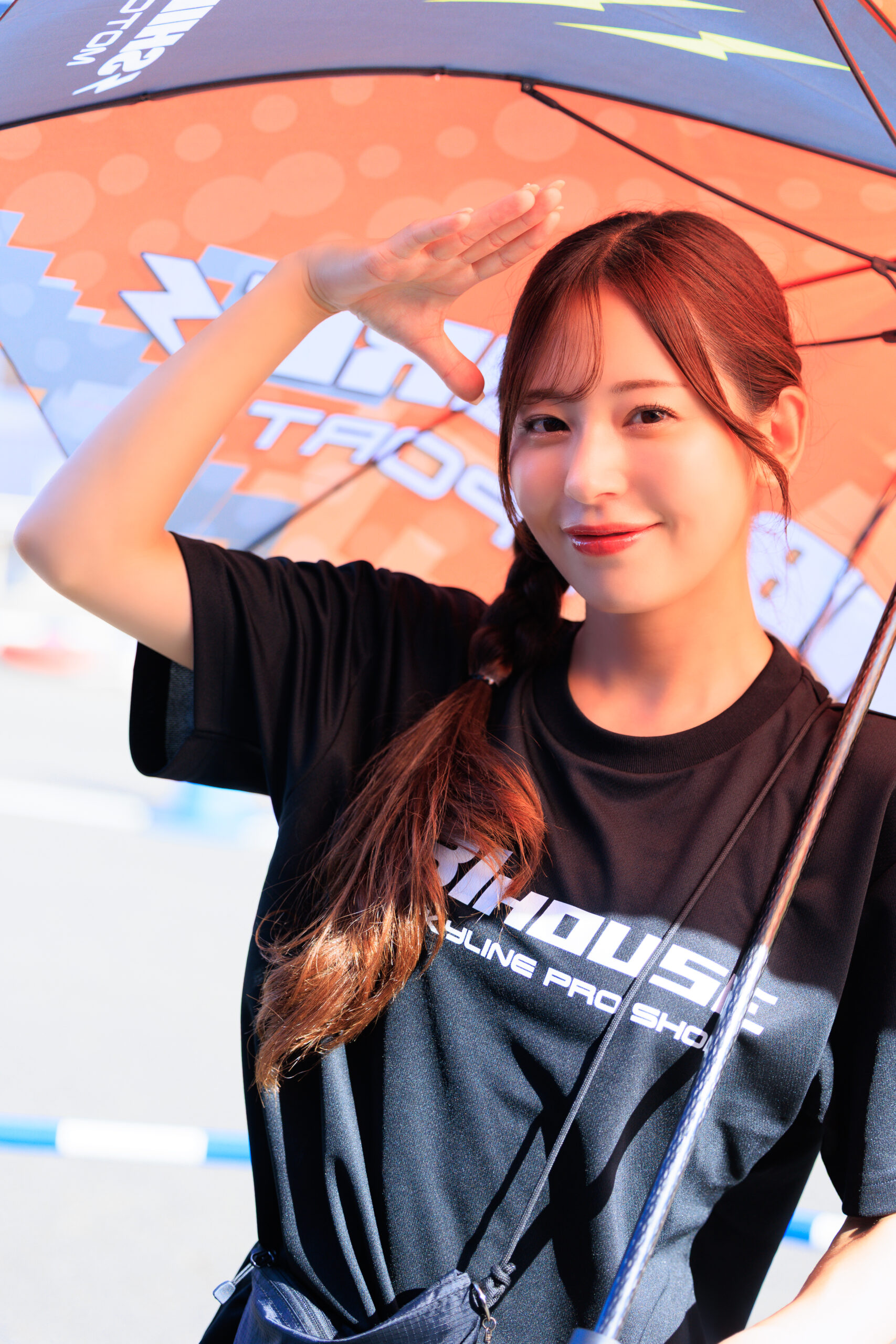 黒Tシャツとチームカラーの傘が映えて、スポーティーさと明るさが両立。サーキットの熱気の中で、爽やかさと親しみやすさが伝わってきますね。