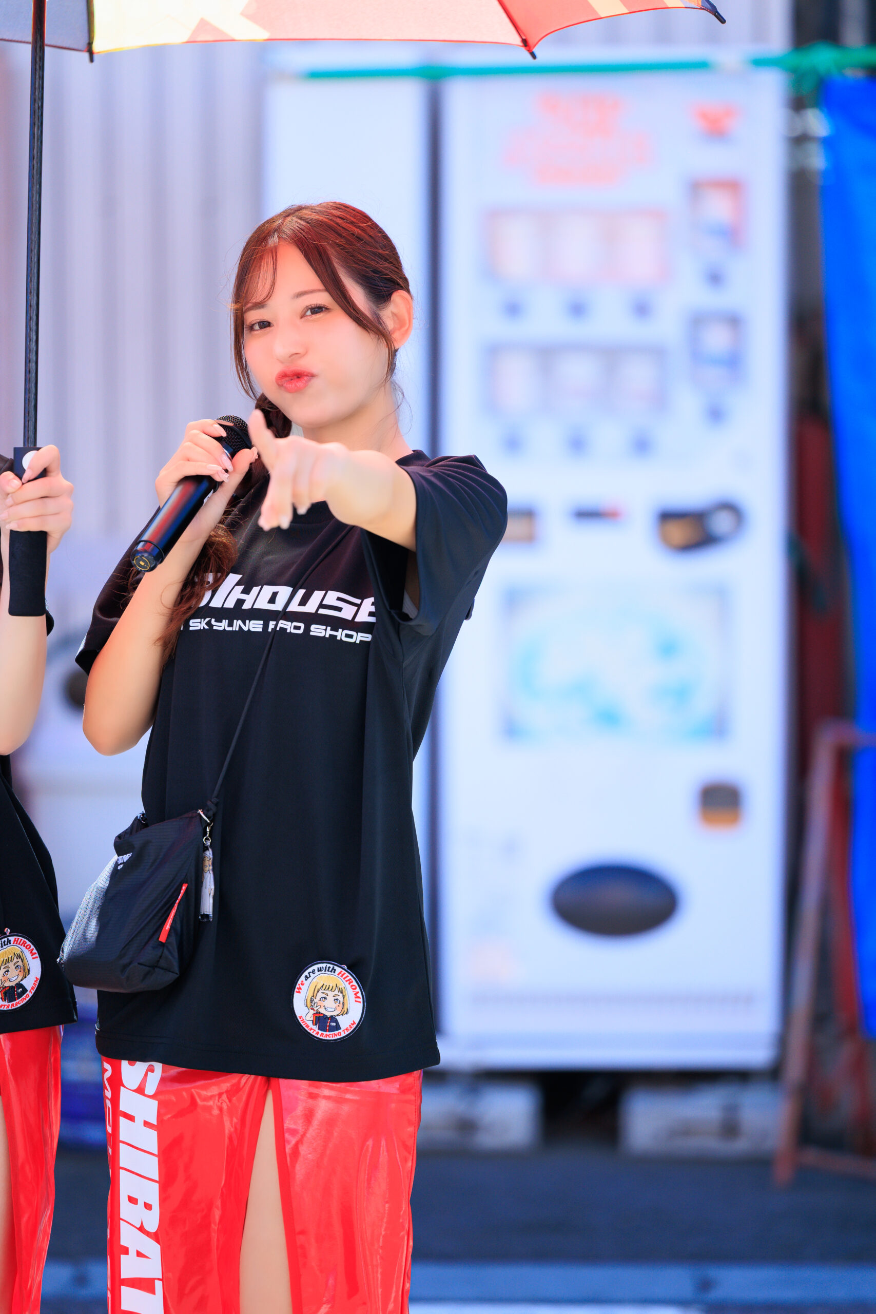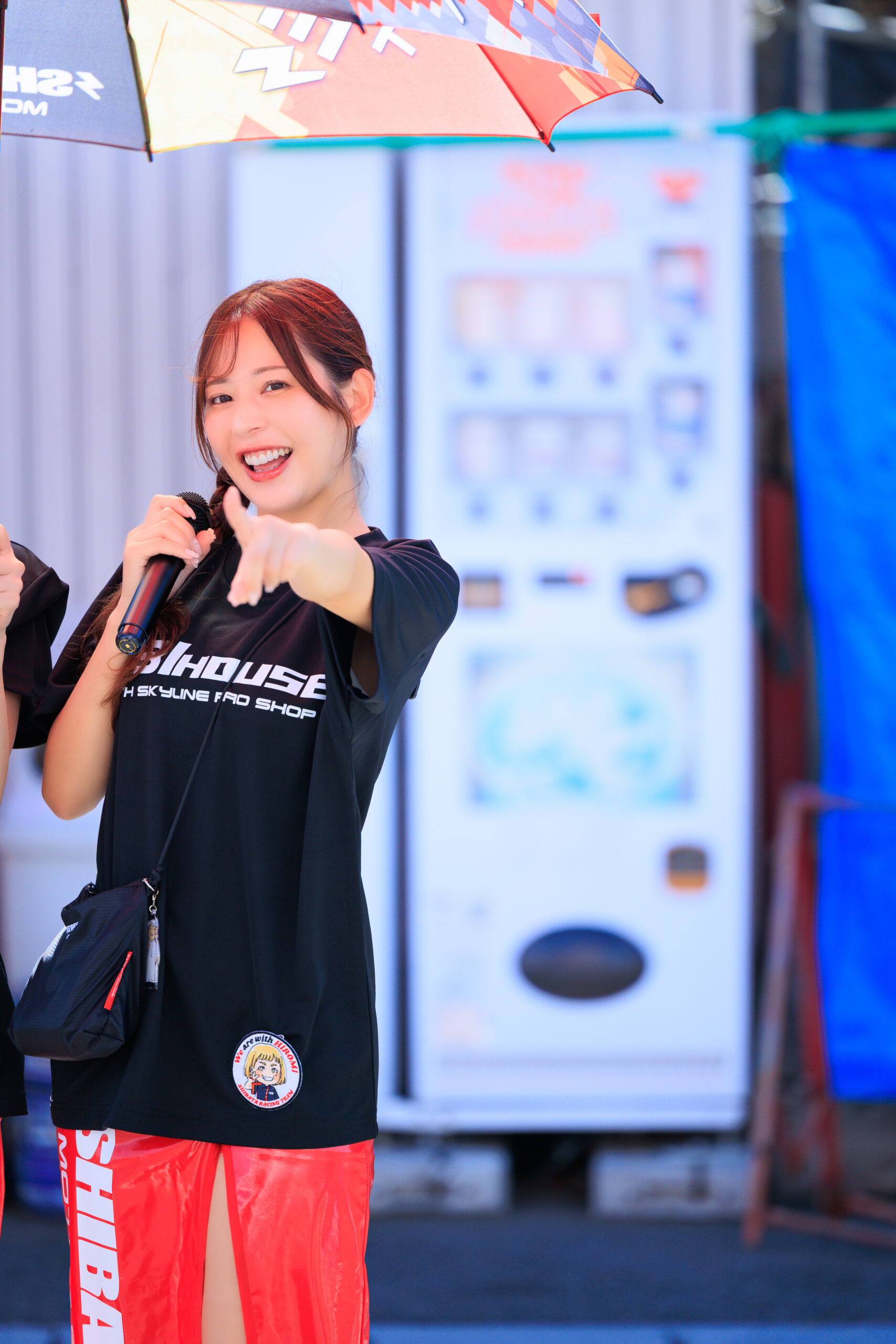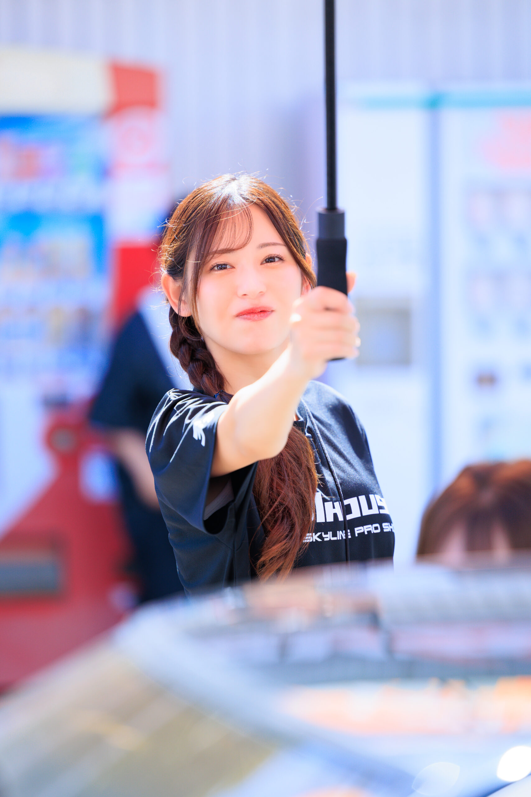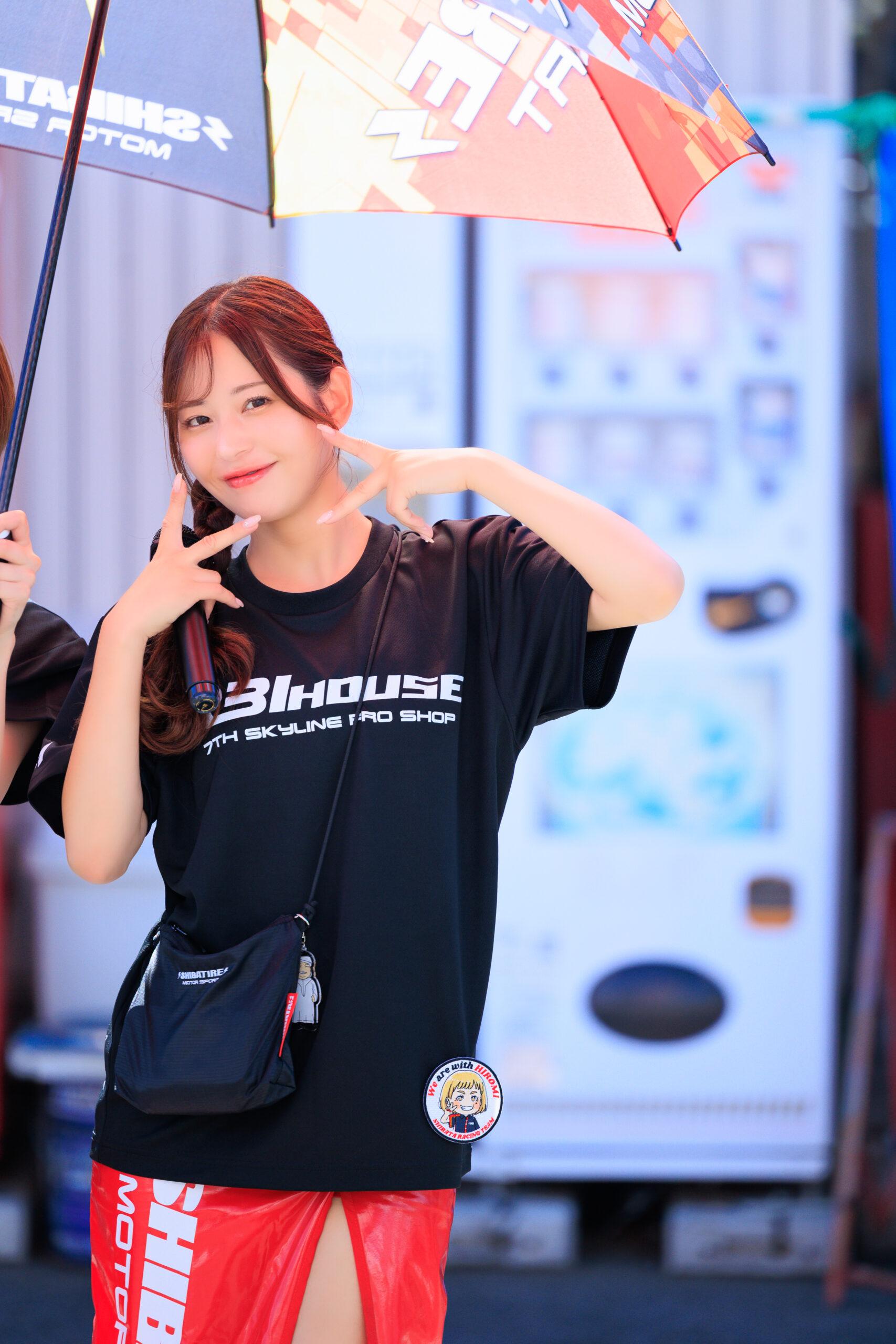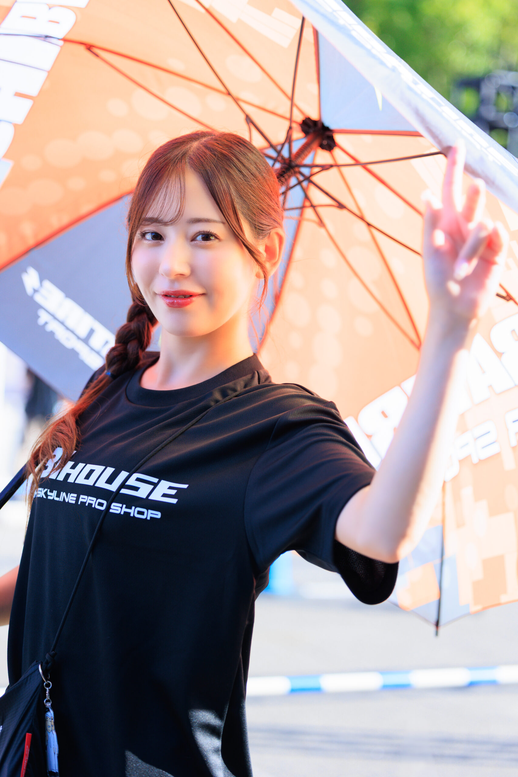 黒Tシャツとチームカラーの傘が映えて、スポーティーさと明るさが両立。サーキットの熱気の中で、爽やかさと親しみやすさが伝わってきますね。
