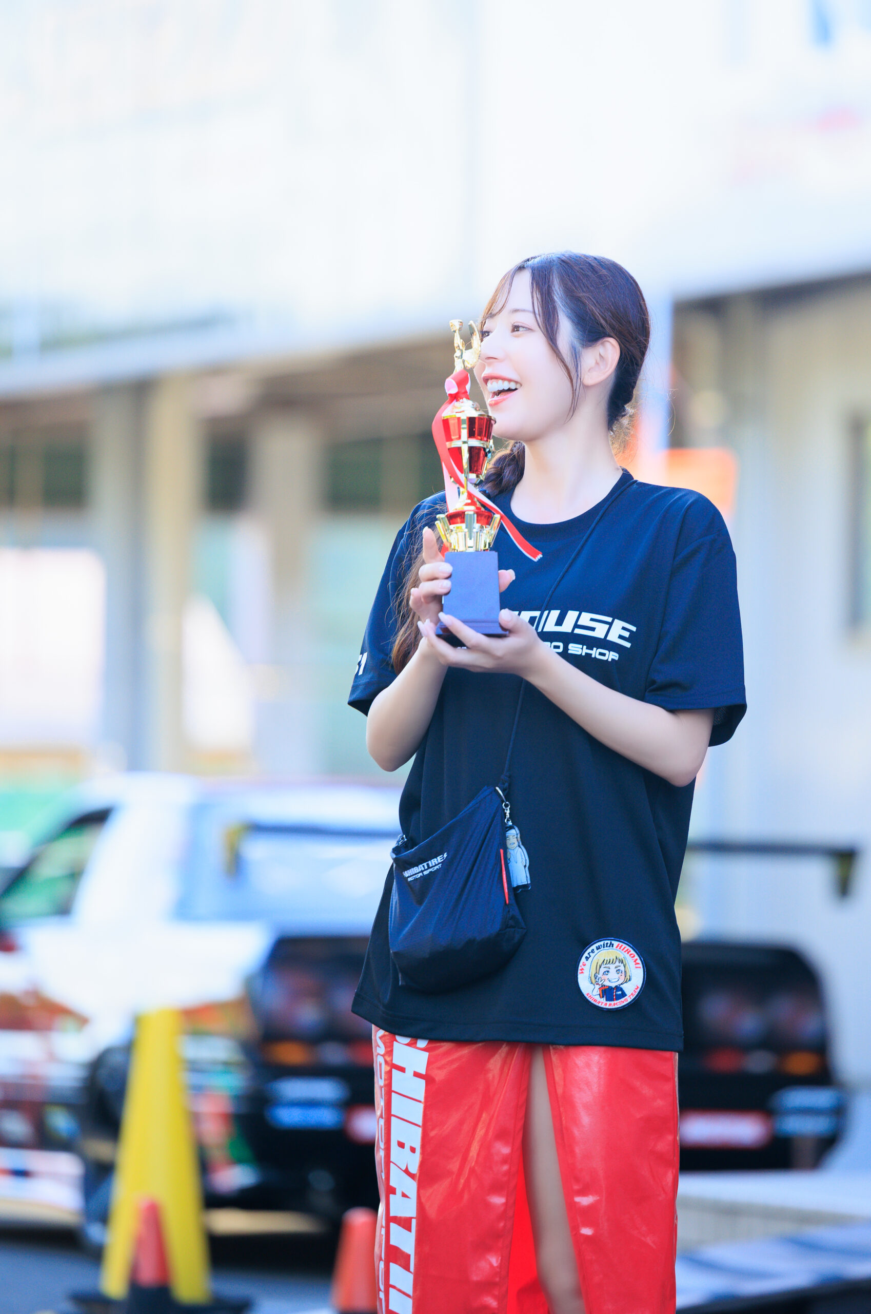 光のやわらかさと笑顔の明るさが調和していて、「努力が実った喜び」を感じさせる一枚。トロフィーを抱きしめる仕草が、純粋な嬉しさと可愛らしさを同時に伝えています。