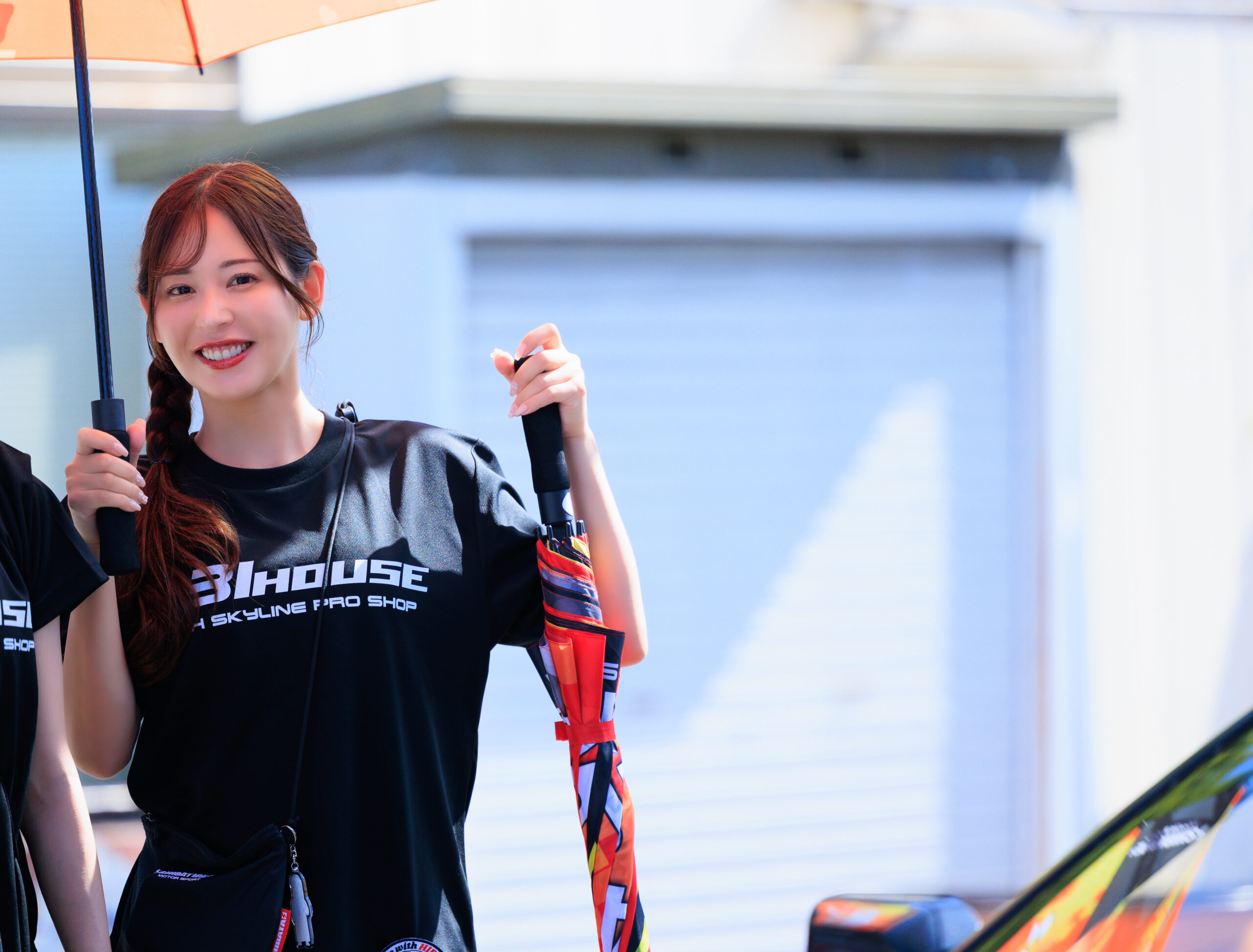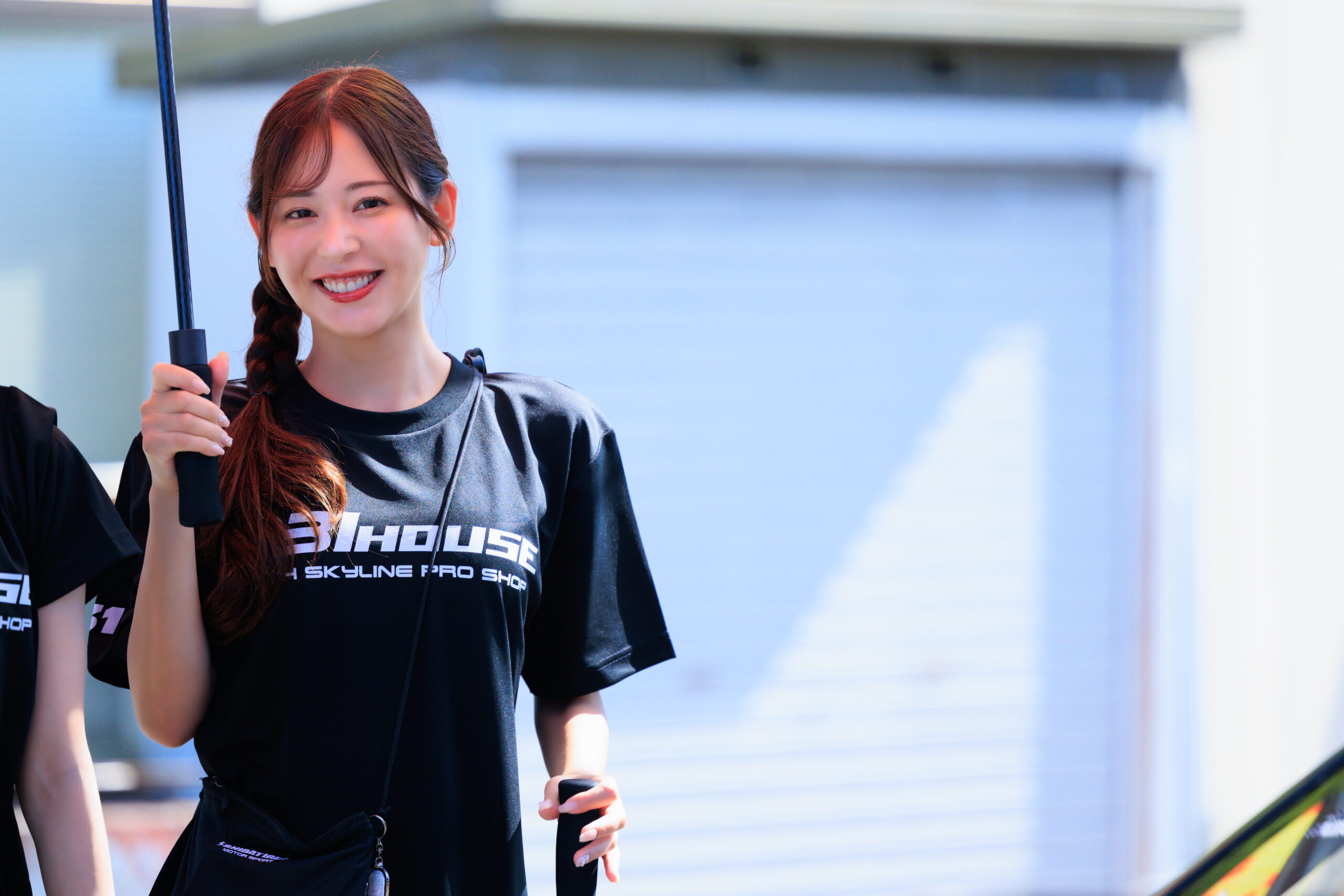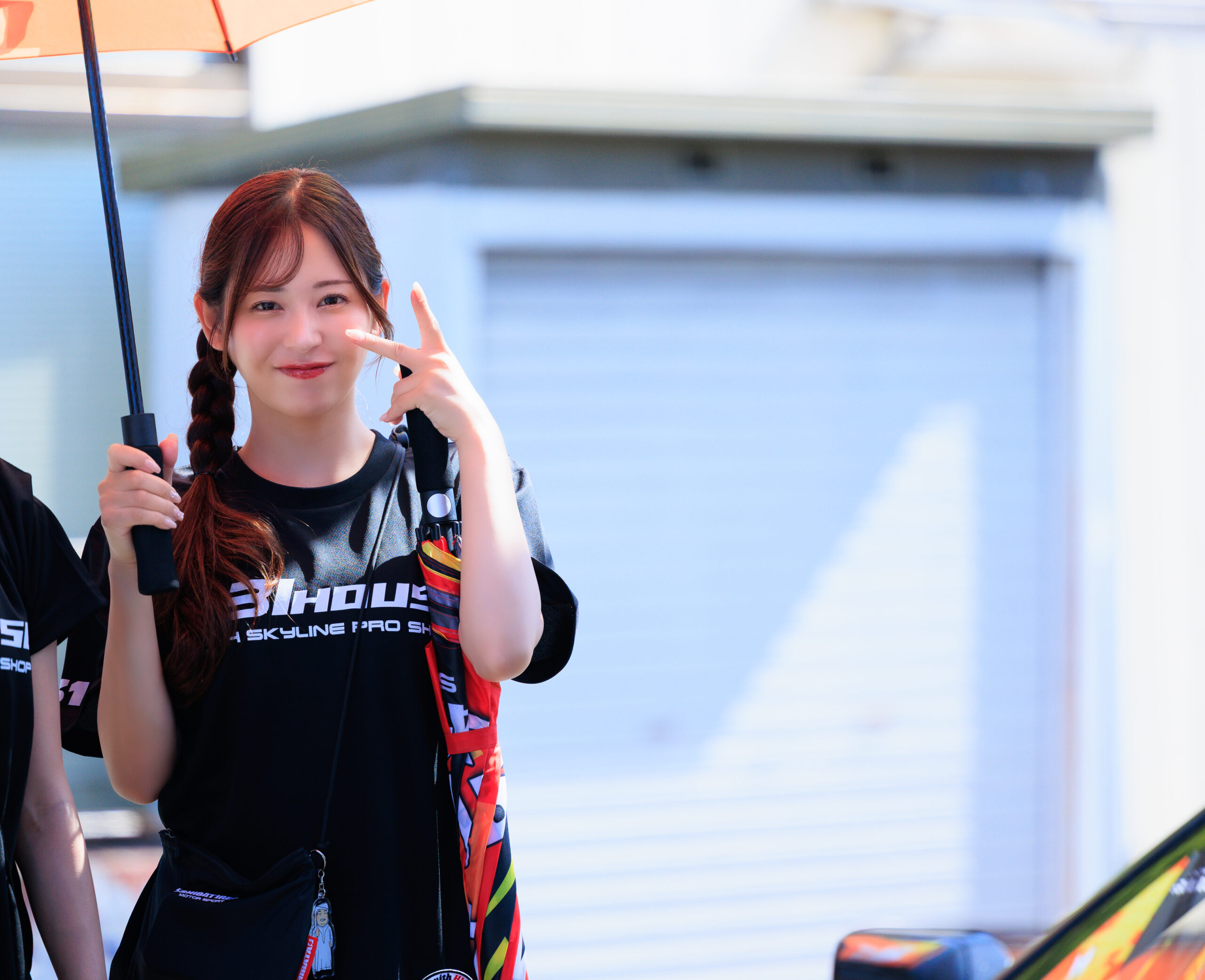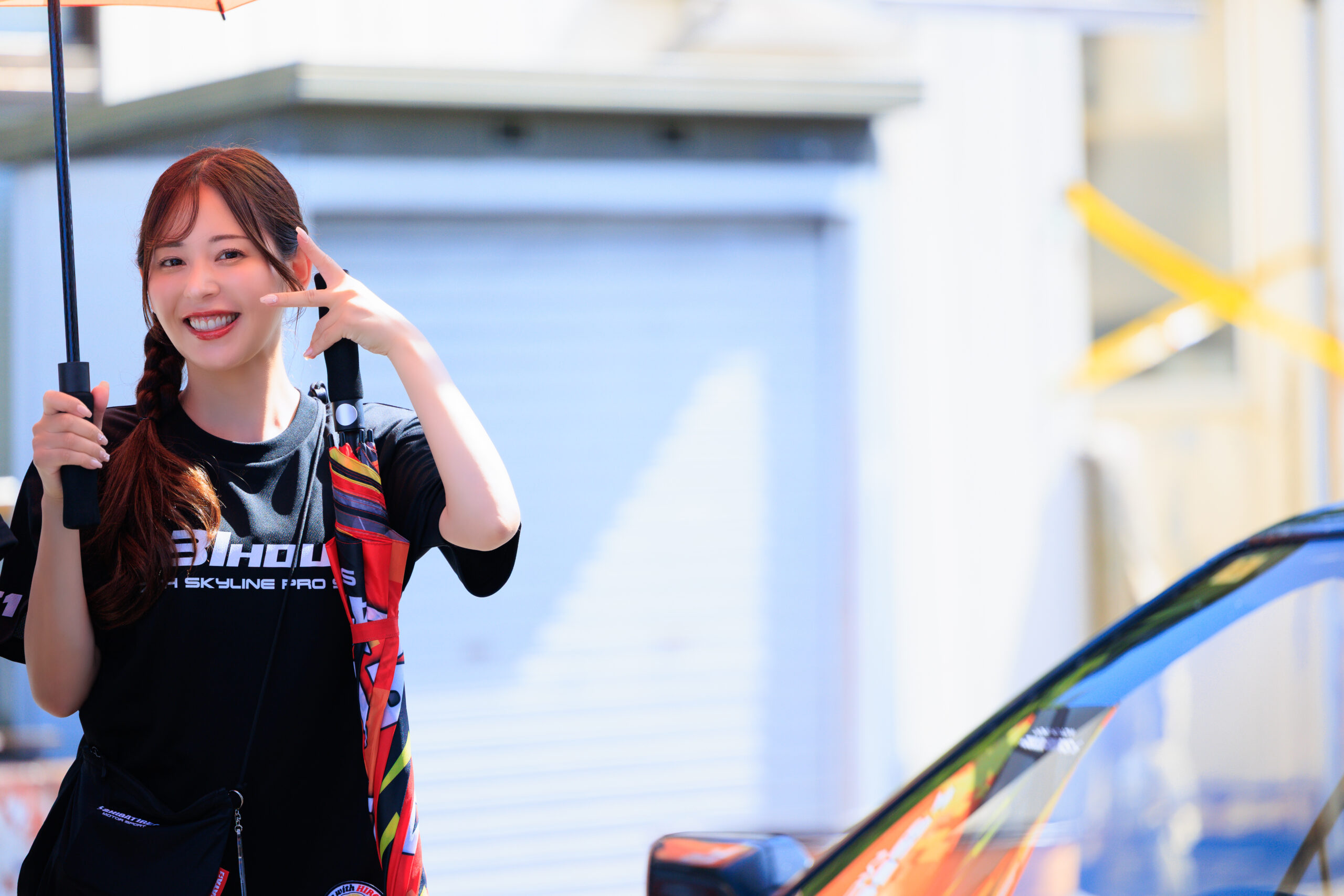 黒Tシャツとチームカラーの傘が映えて、スポーティーさと明るさが両立。サーキットの熱気の中で、爽やかさと親しみやすさが伝わってきますね。