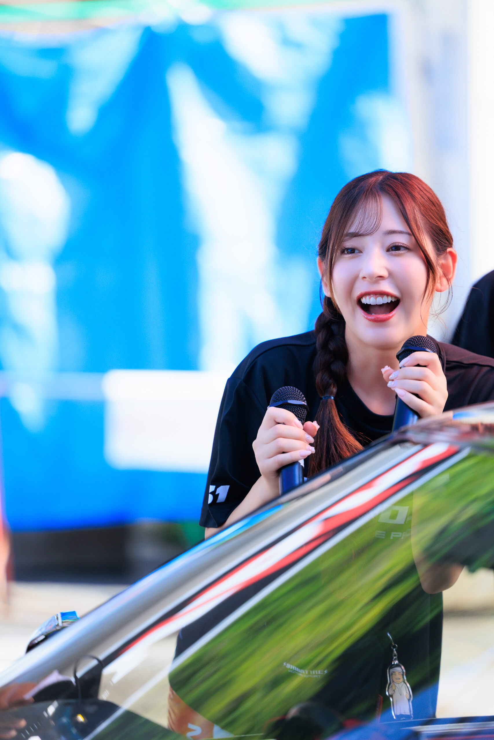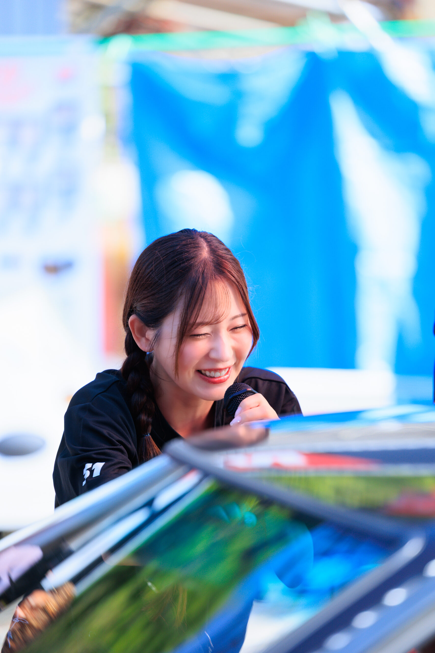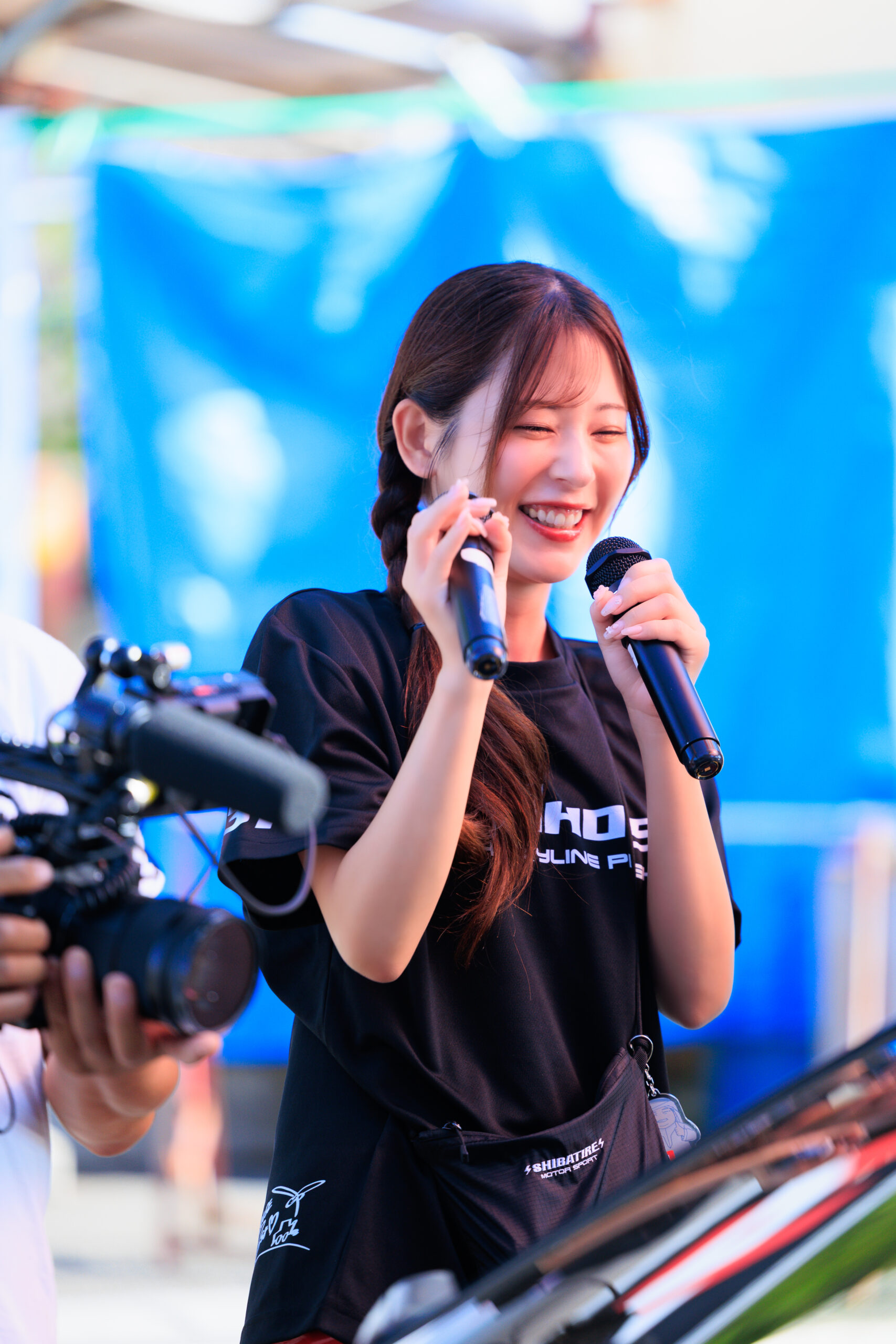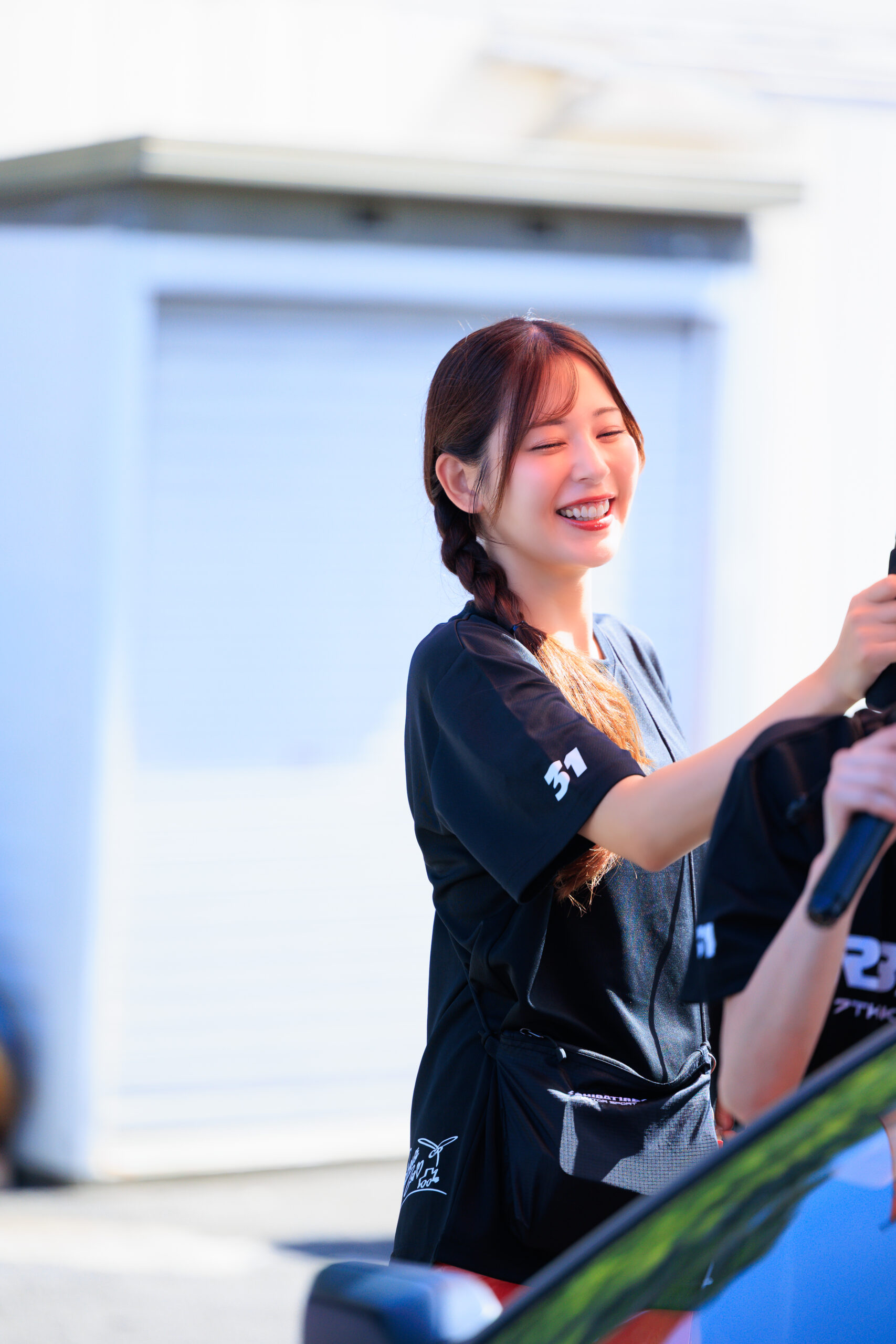 ももさんの笑顔がとても柔らかく、温かさを感じます。マイクを持ちながら楽しそうに話す姿から、場を盛り上げている雰囲気。サーキットの熱気と笑顔が重なって、見る人に元気を届ける一枚。