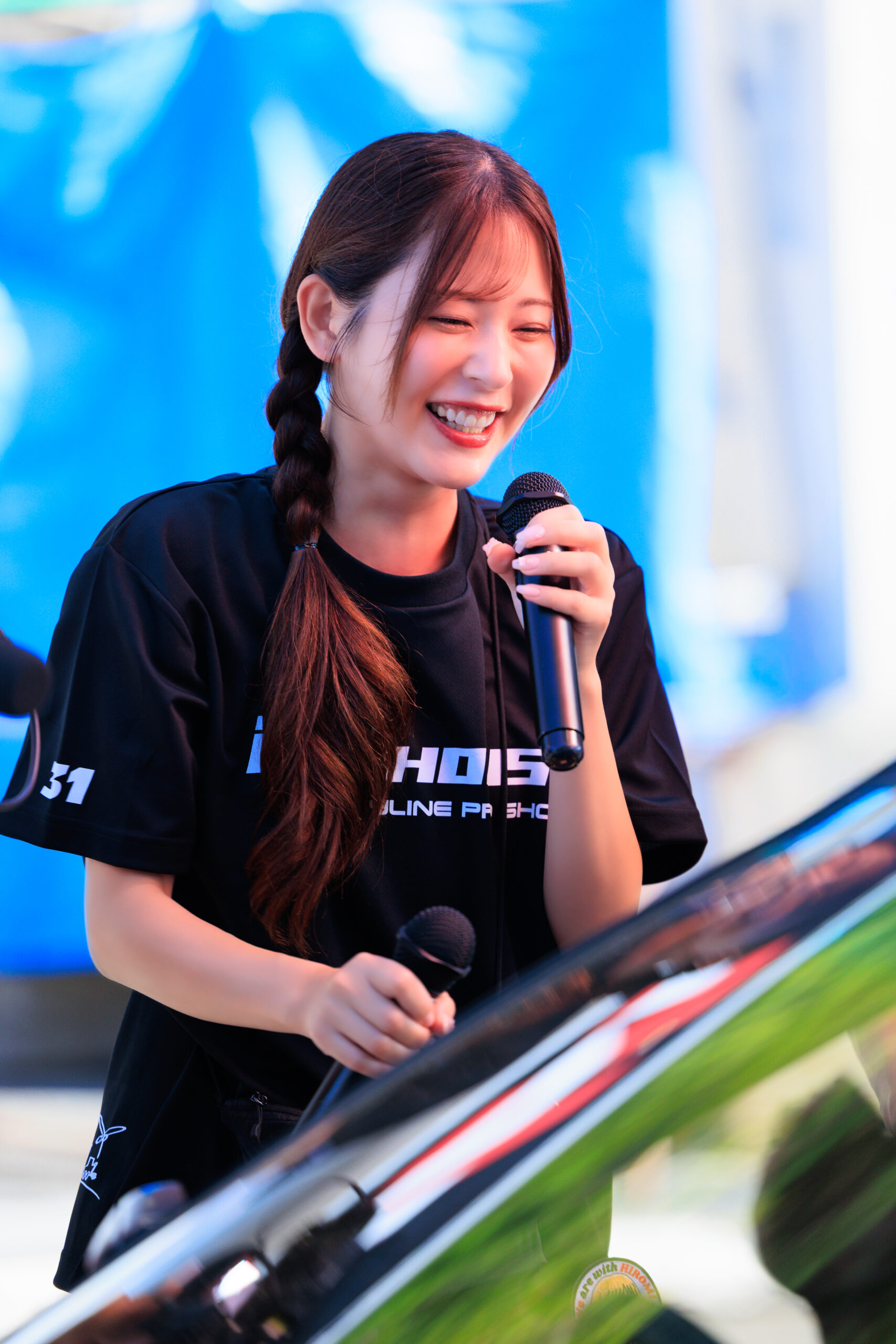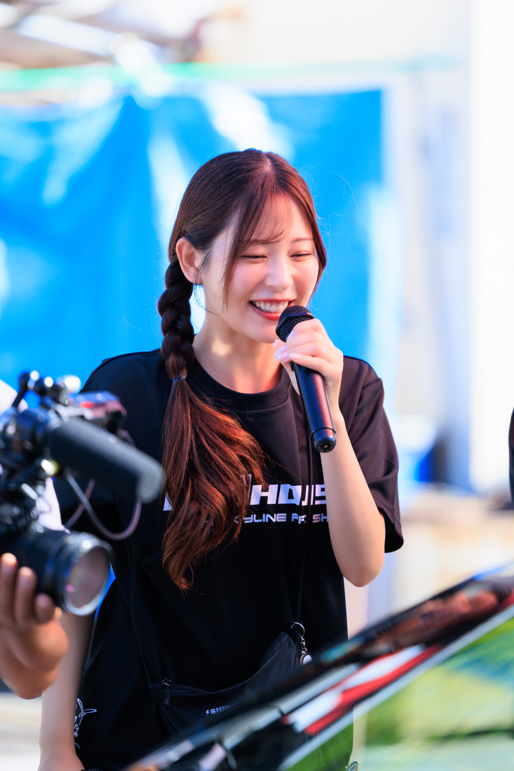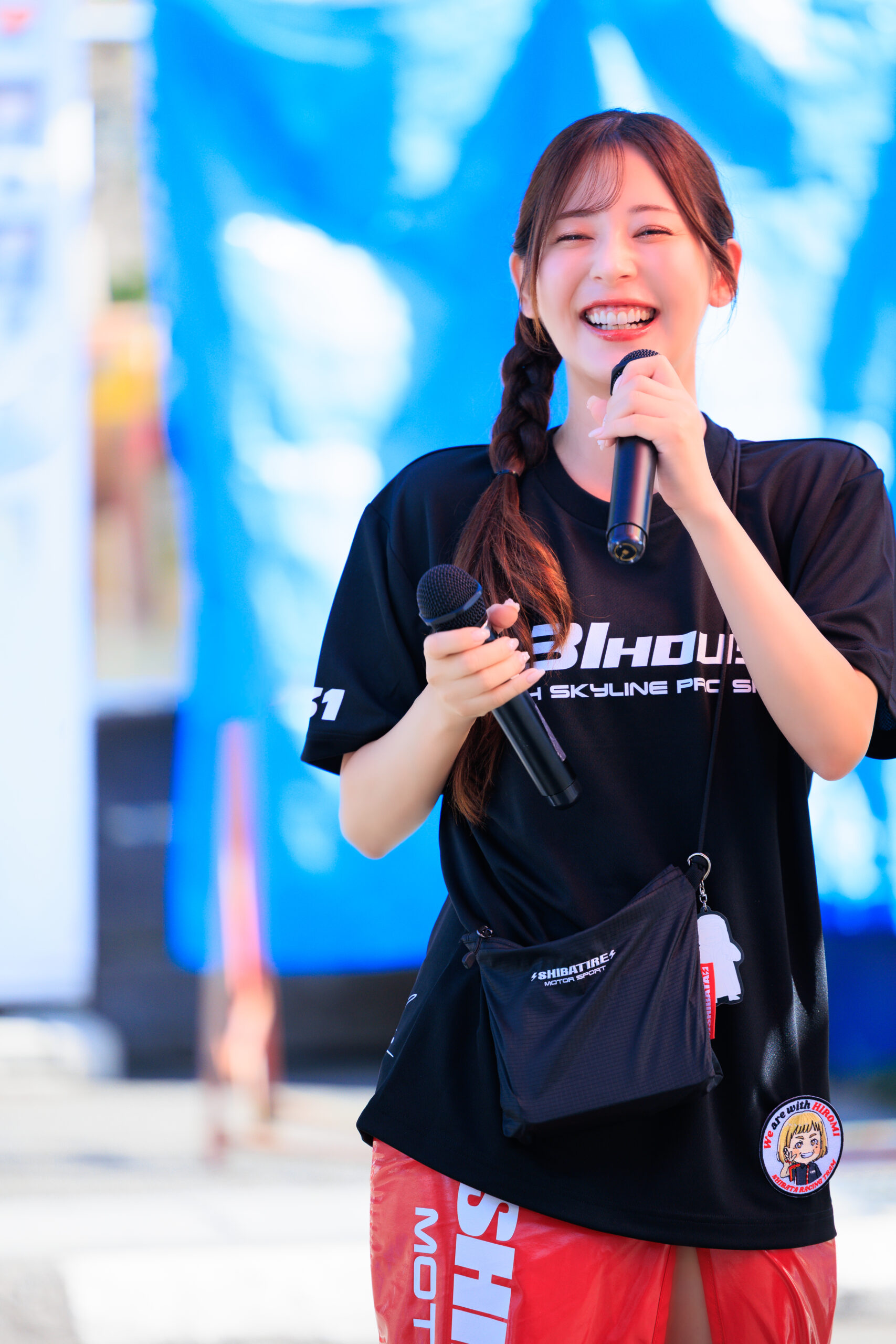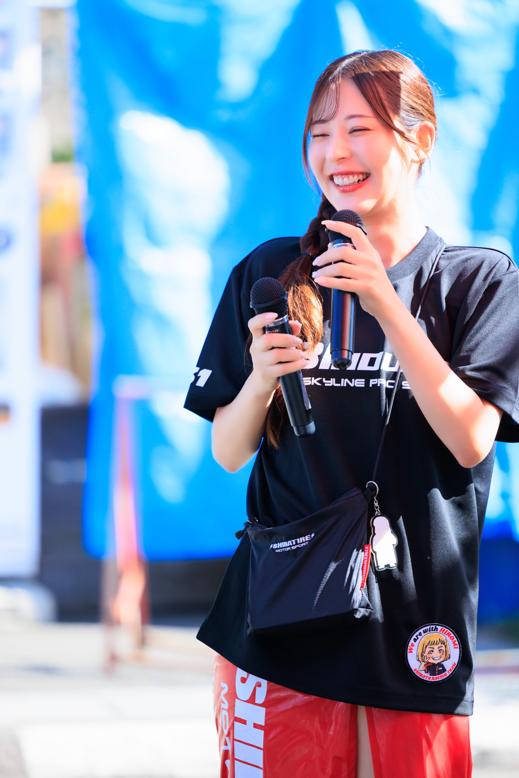 ももさんの笑顔がとても柔らかく、温かさを感じます。マイクを持ちながら楽しそうに話す姿から、場を盛り上げている雰囲気。サーキットの熱気と笑顔が重なって、見る人に元気を届ける一枚。
