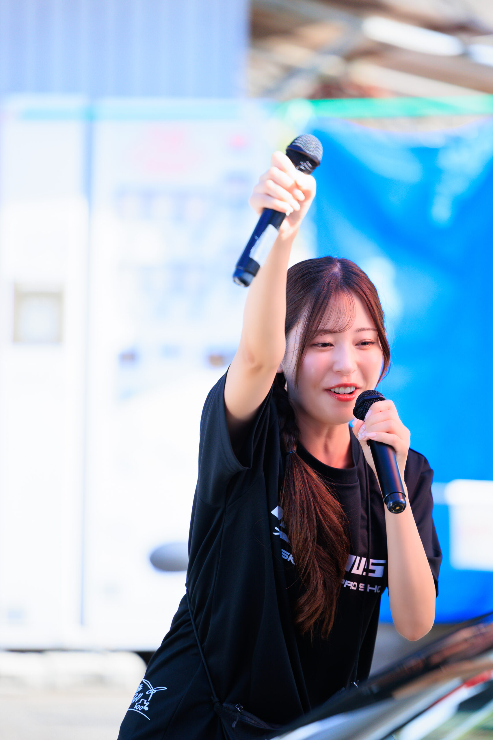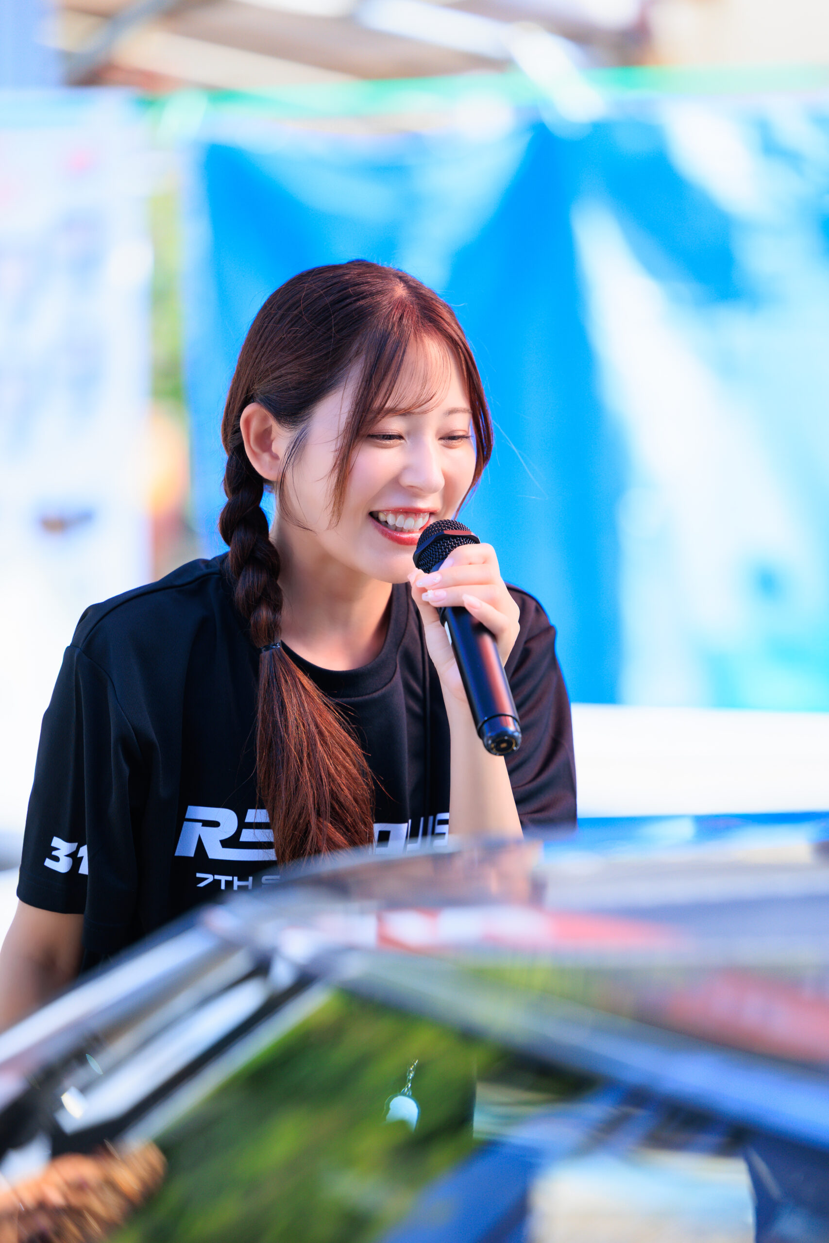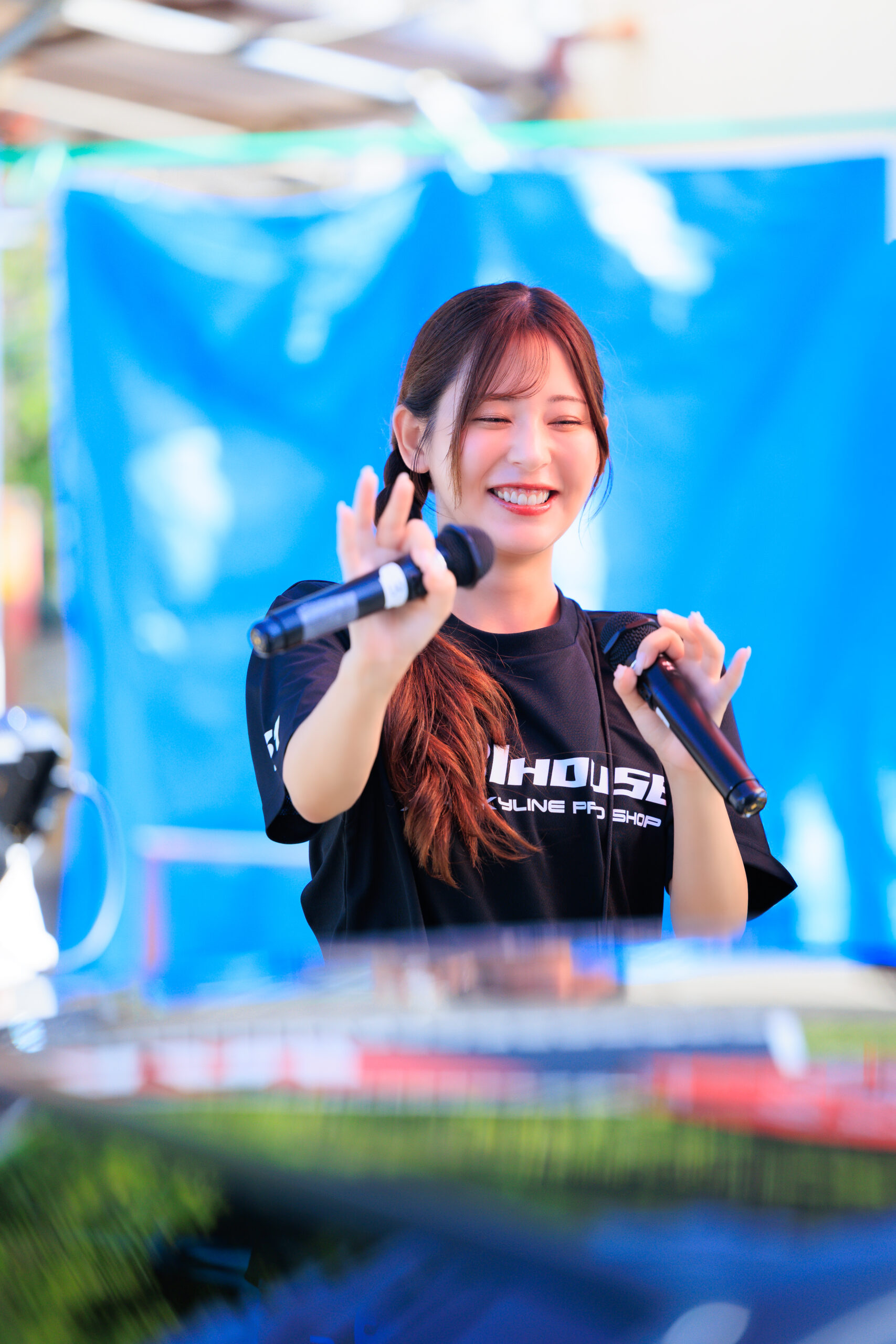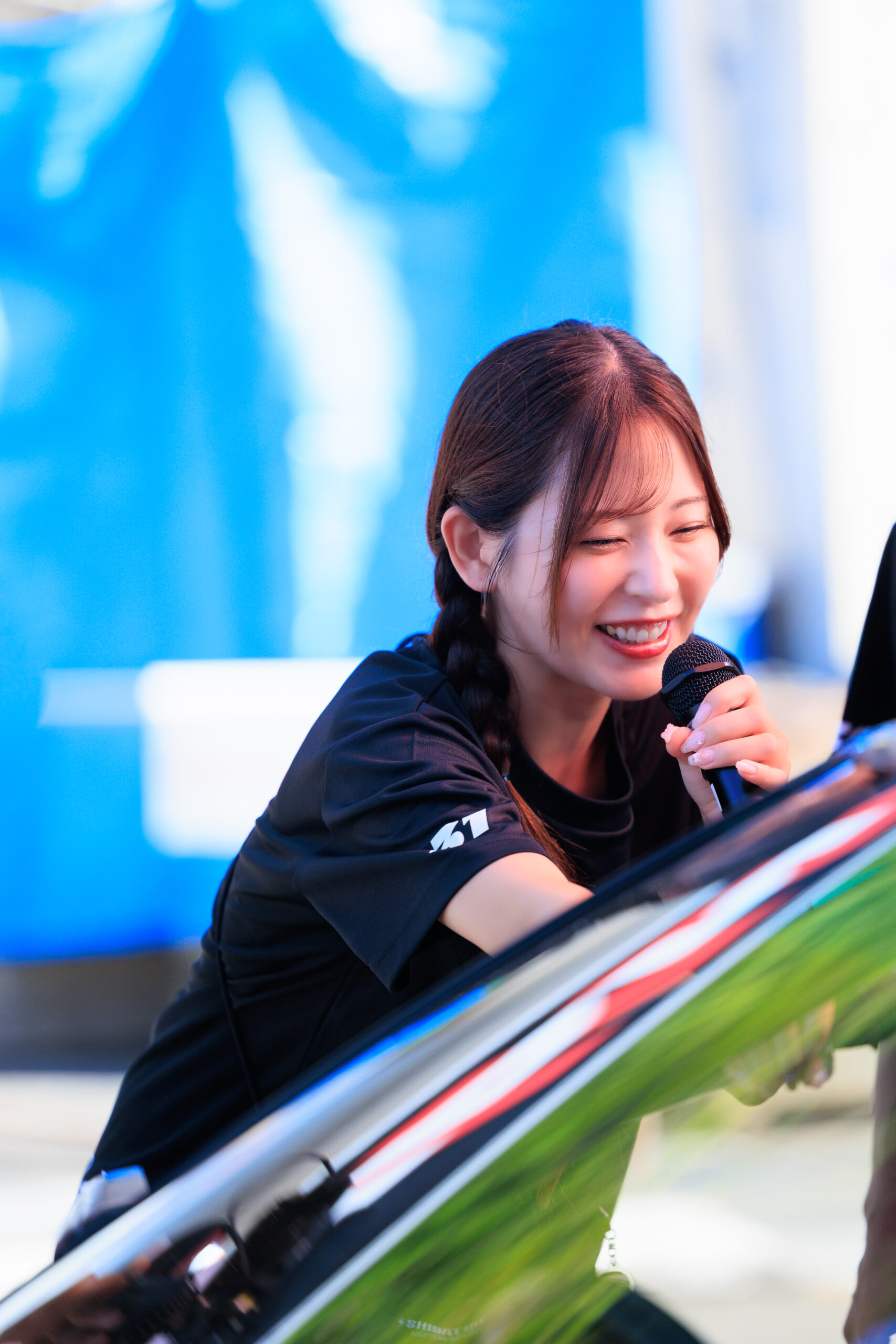 ももさんの笑顔がとても柔らかく、温かさを感じます。マイクを持ちながら楽しそうに話す姿から、場を盛り上げている雰囲気。サーキットの熱気と笑顔が重なって、見る人に元気を届ける一枚。