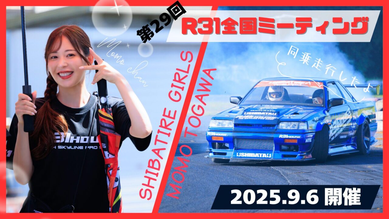 第29回 R31全国ミーティング主催、R31HOUSEの柴田社長を筆頭に、スペシャルゲストの松田次生選手、蕎麦切広大選手、田中省己選手、中川尚隆選手、MC鈴木学様。そして、2025年シバタイヤガールズの渡川ももさん・あらた唯さんの登場です。