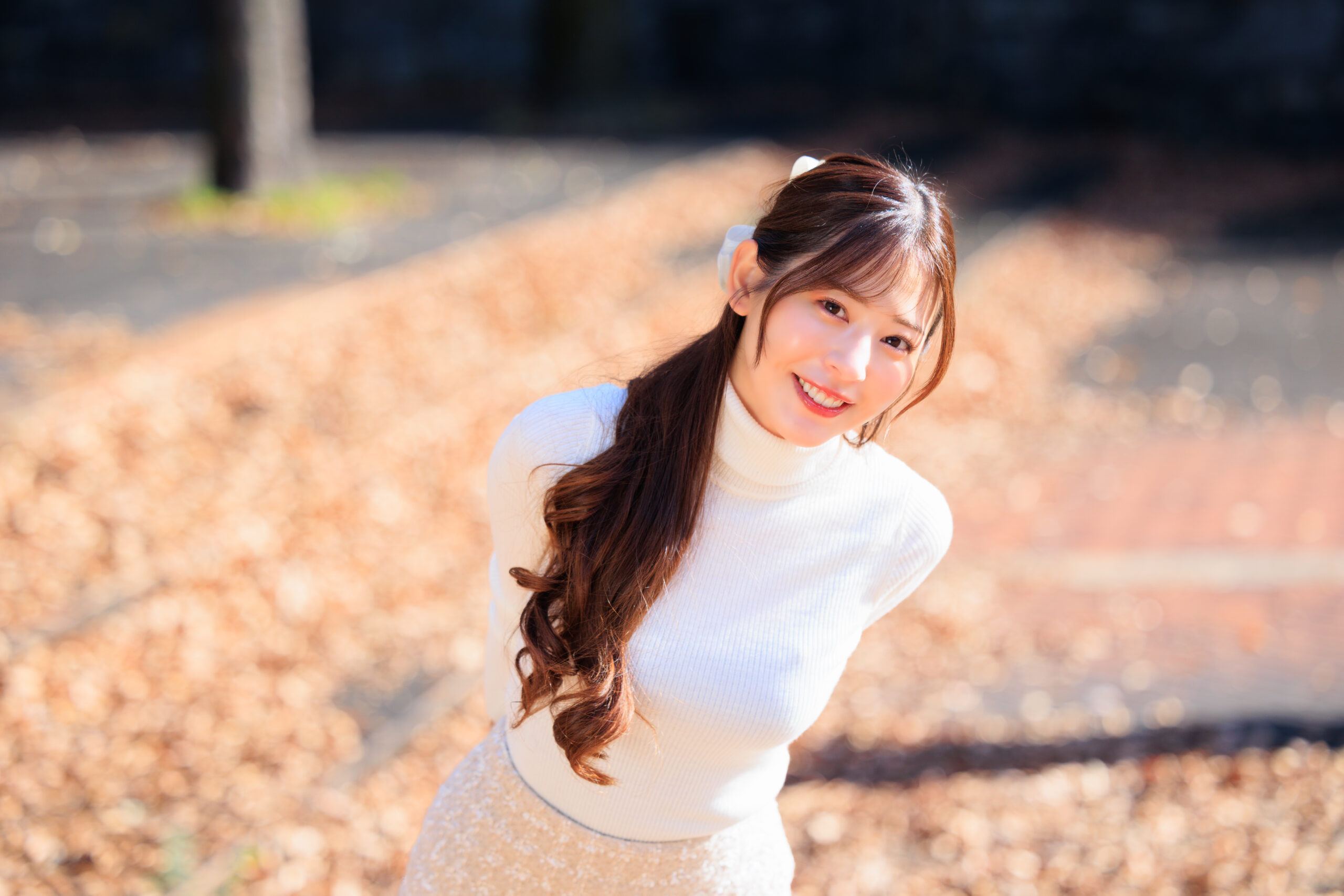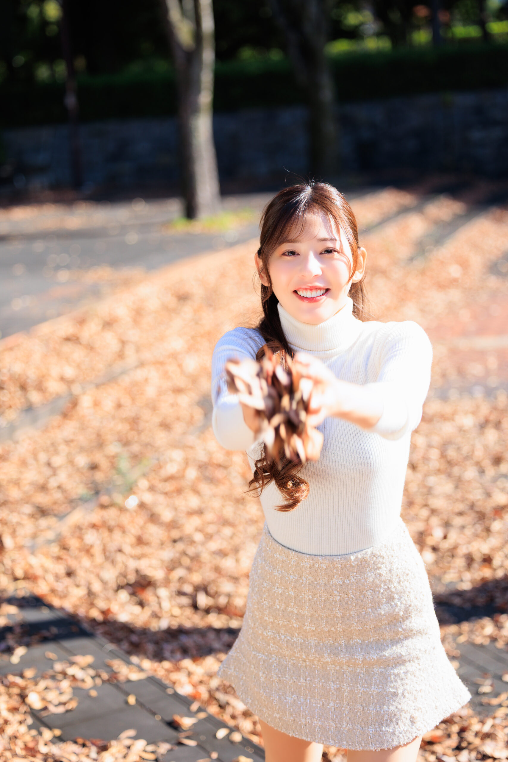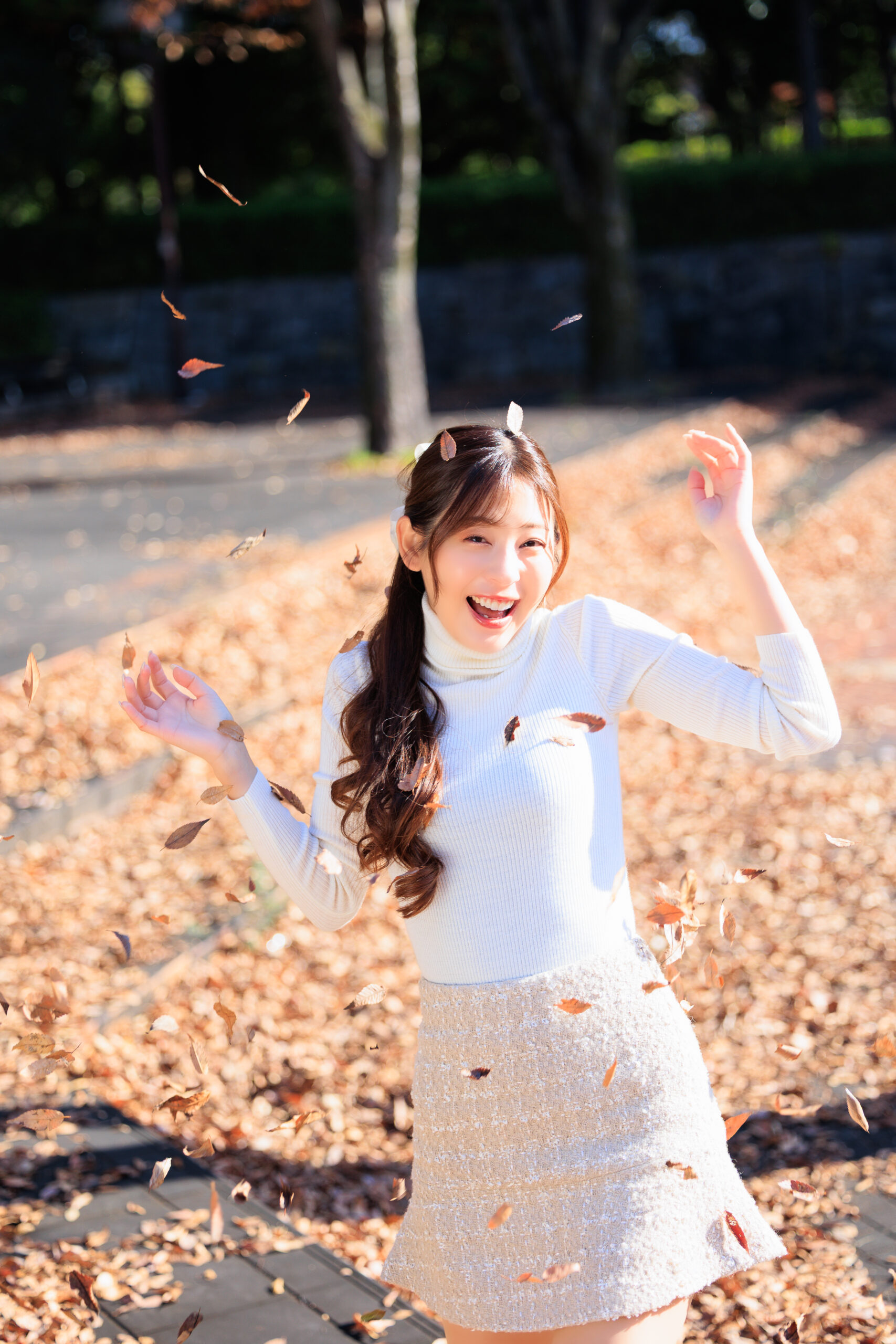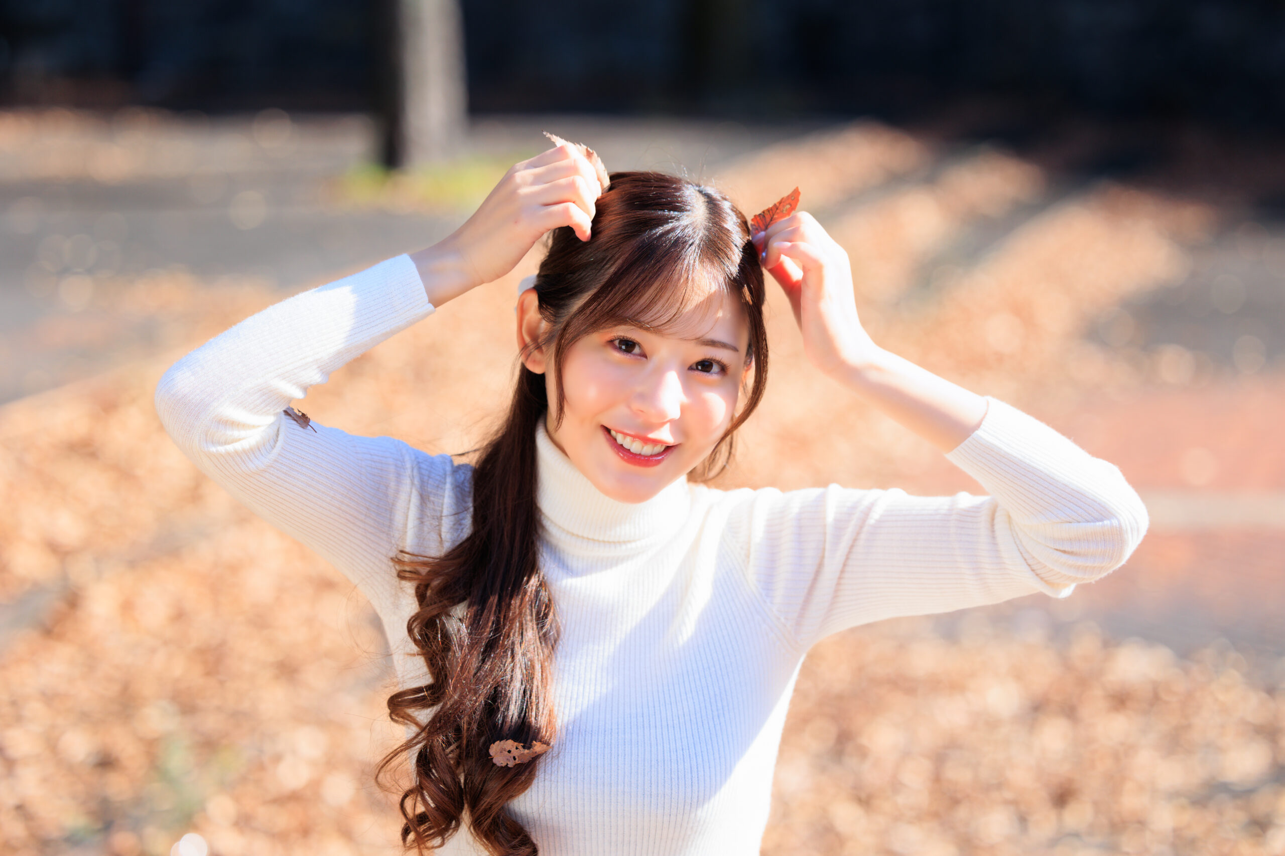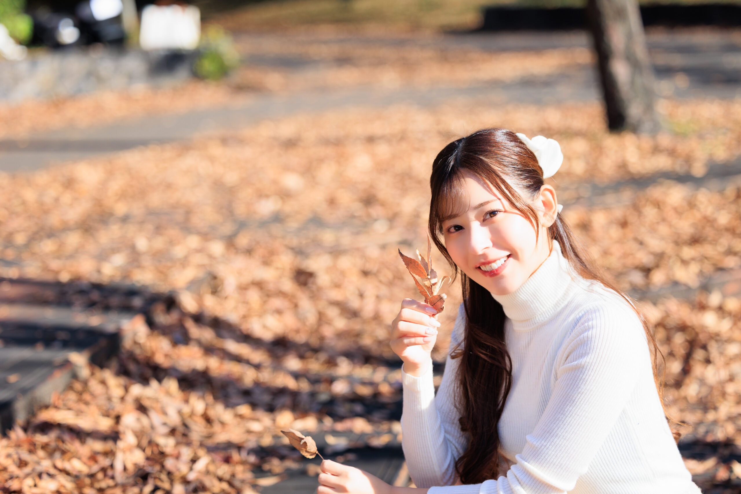 落ち葉に囲まれたやわらかい光の中で、ももちゃんの笑顔が本当にまっすぐで、見た瞬間に「あ、好きだな」って素直に思えるカット。