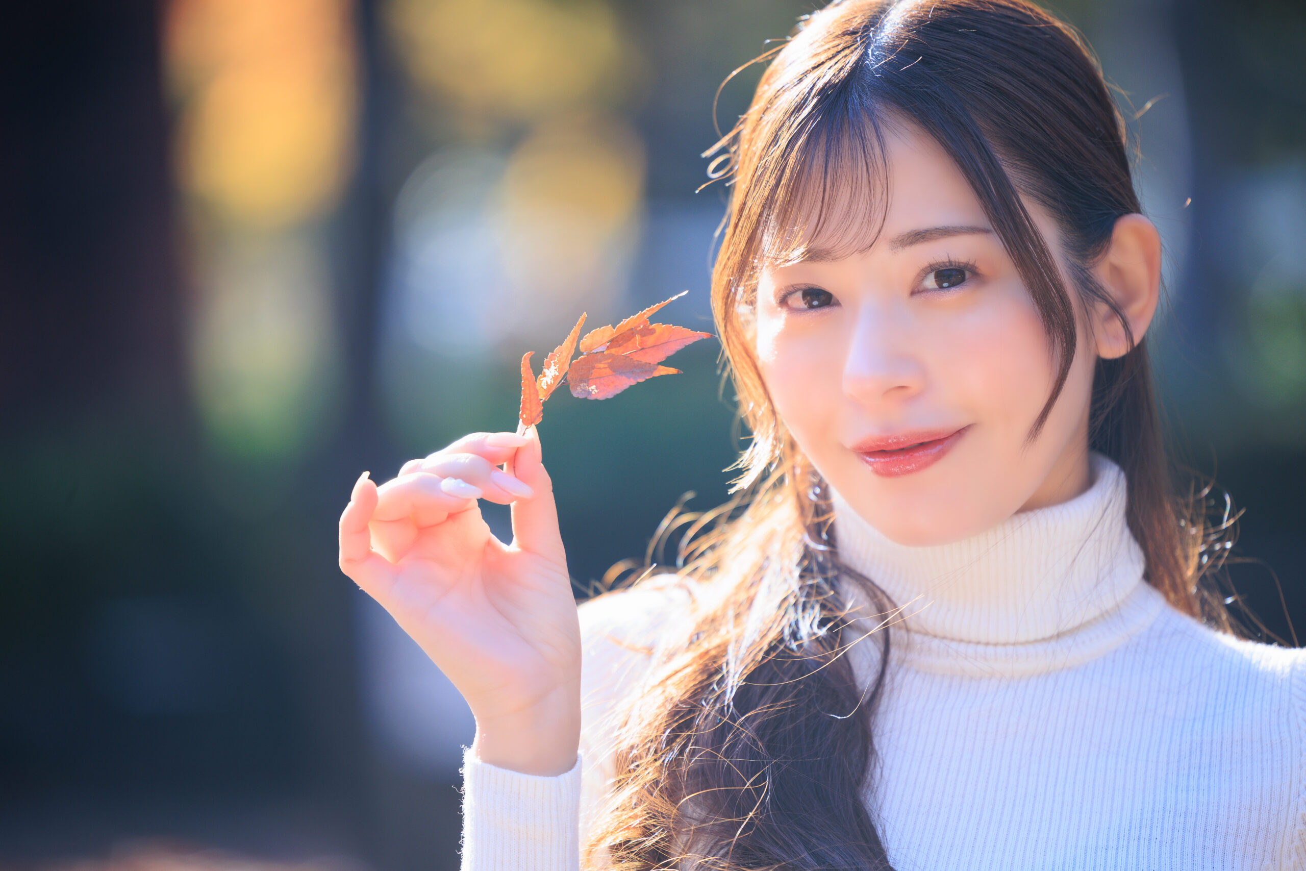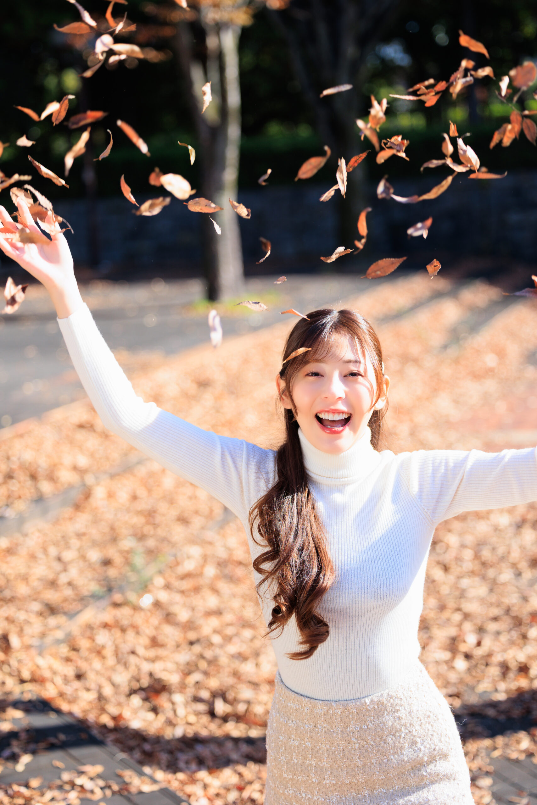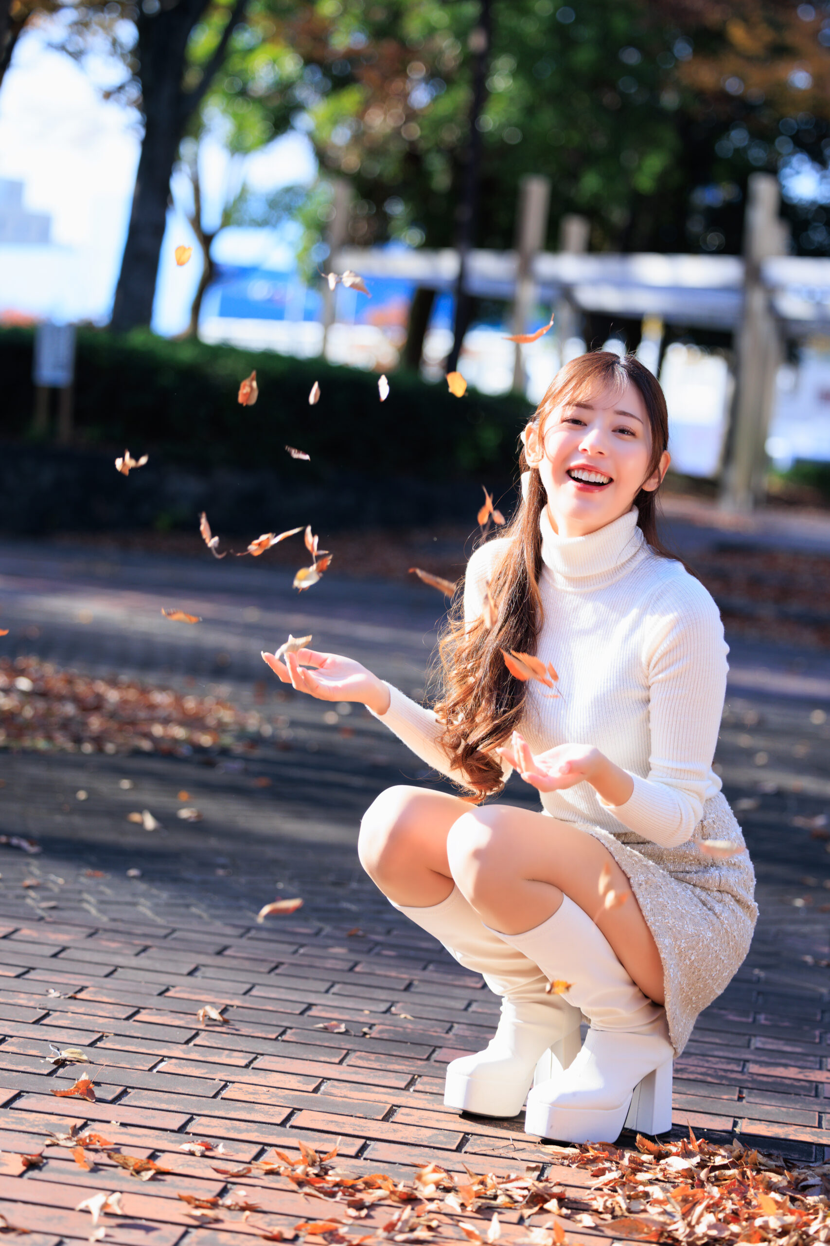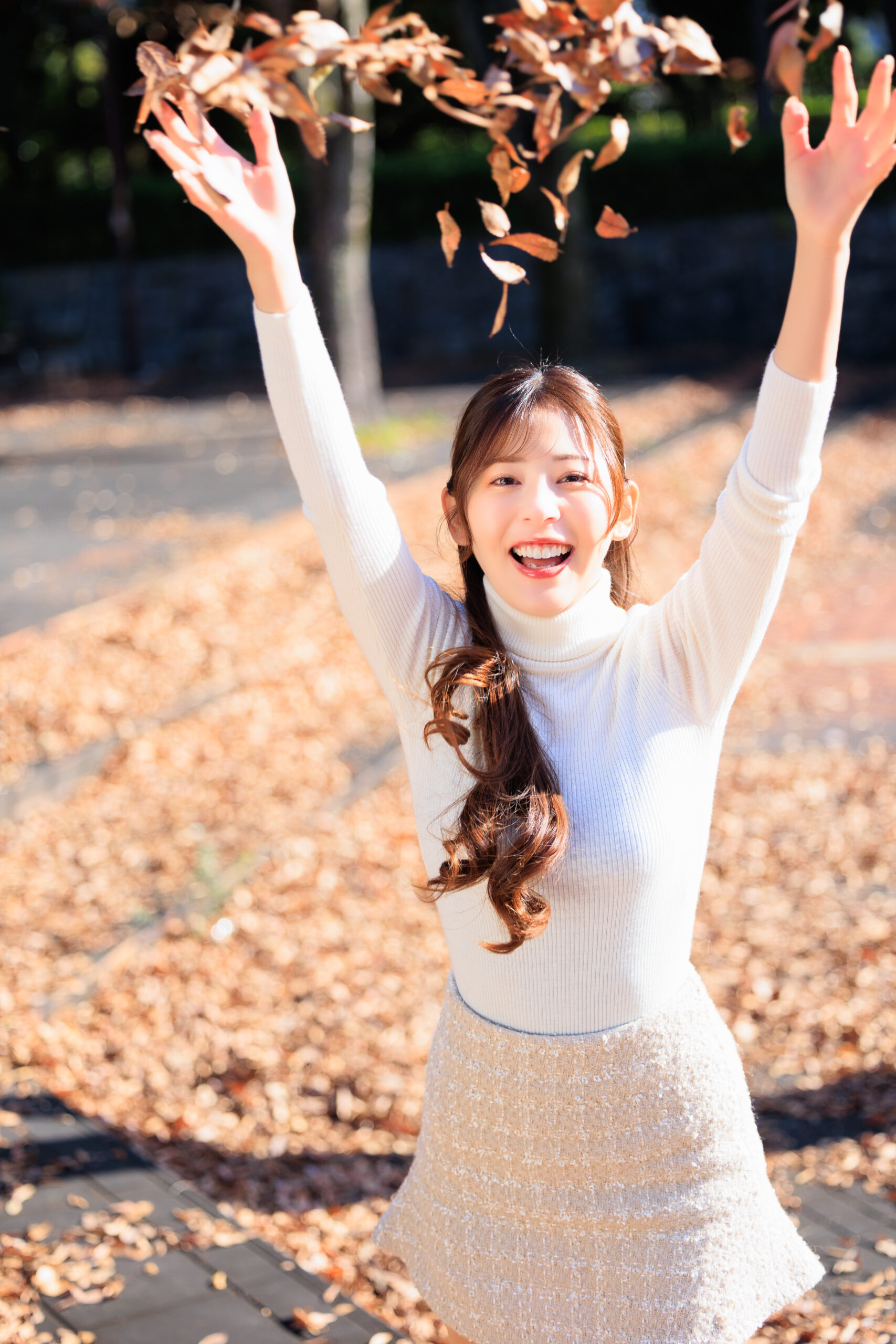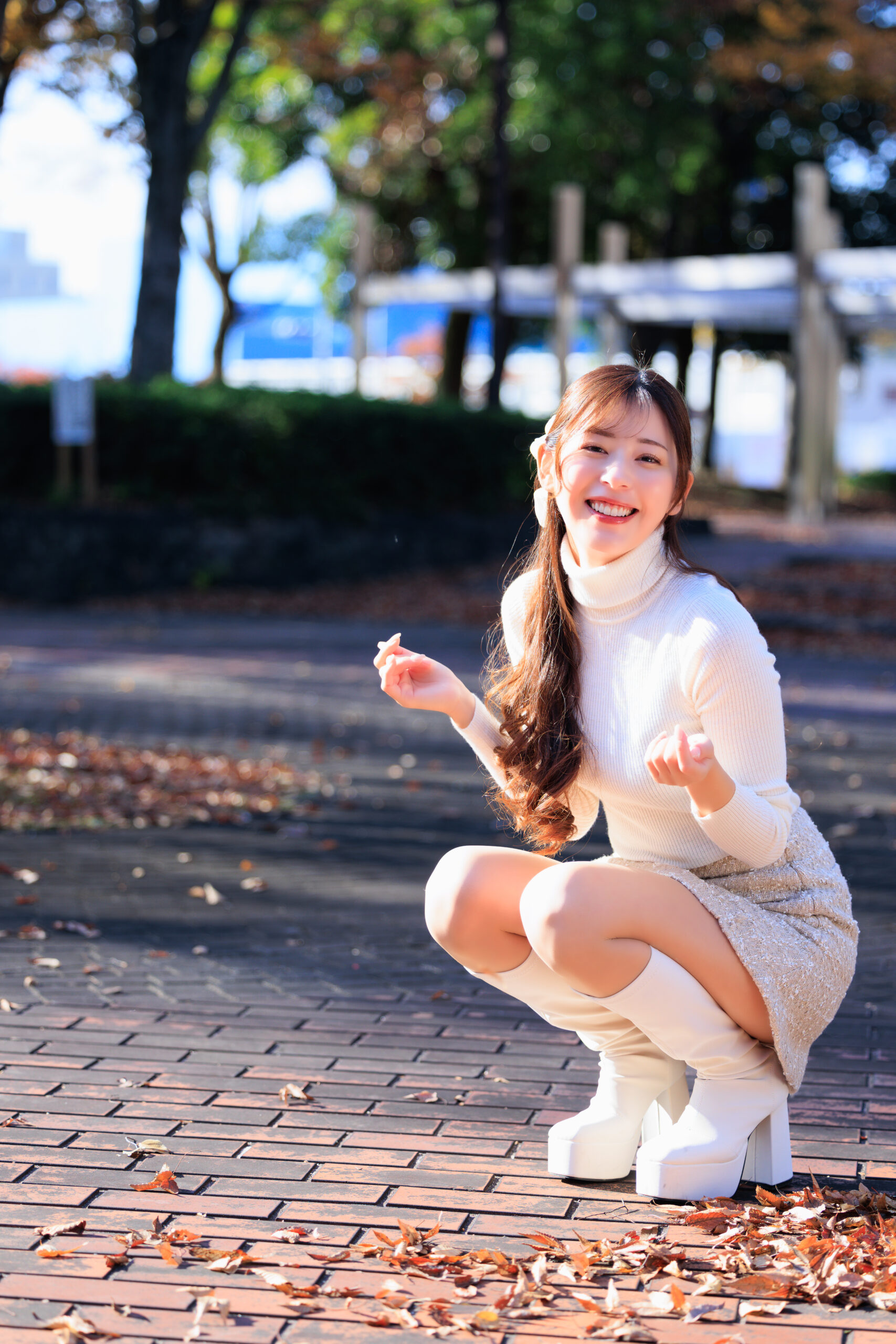 落ち葉に囲まれたやわらかい光の中で、ももちゃんの笑顔が本当にまっすぐで、見た瞬間に「あ、好きだな」って素直に思えるカット。