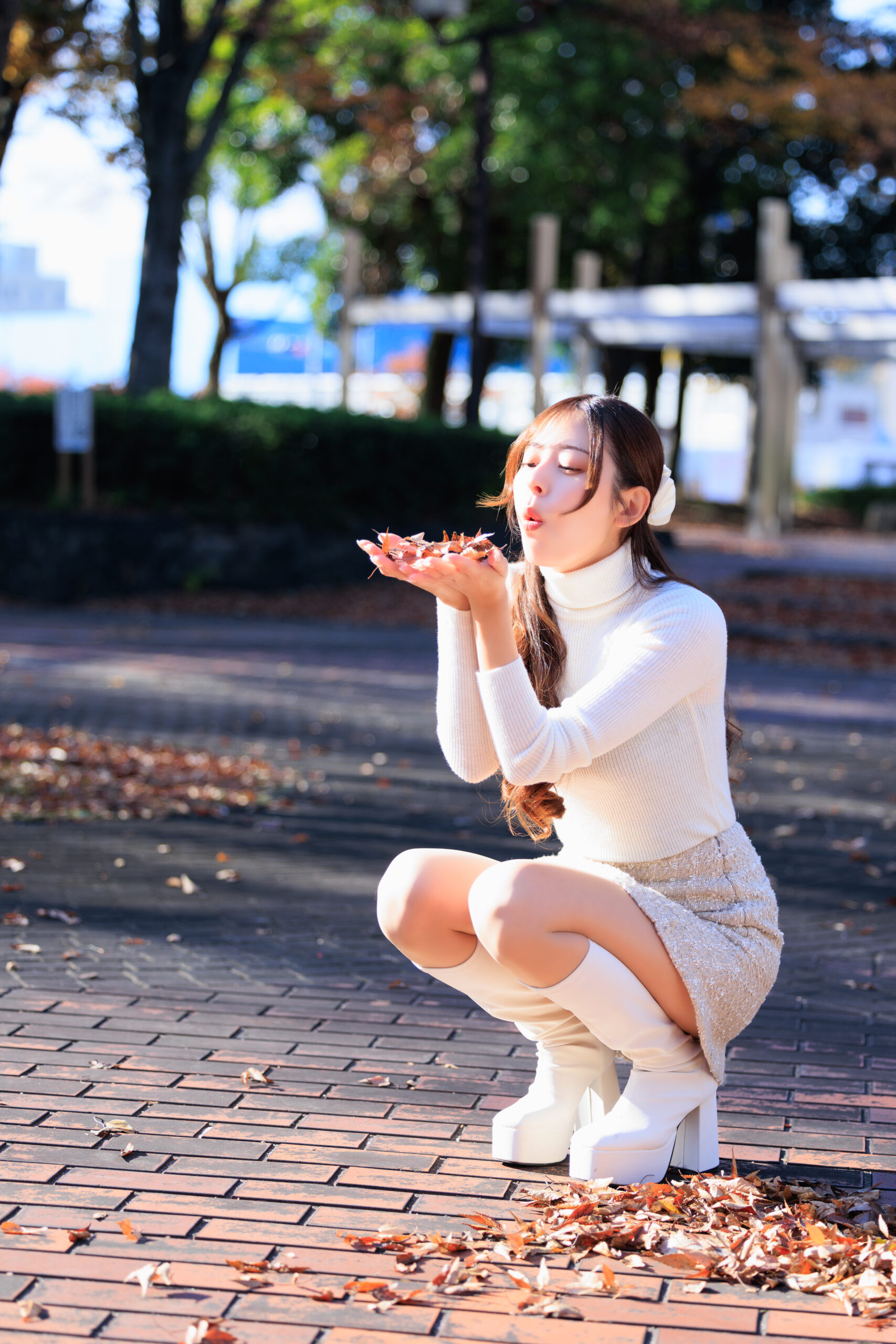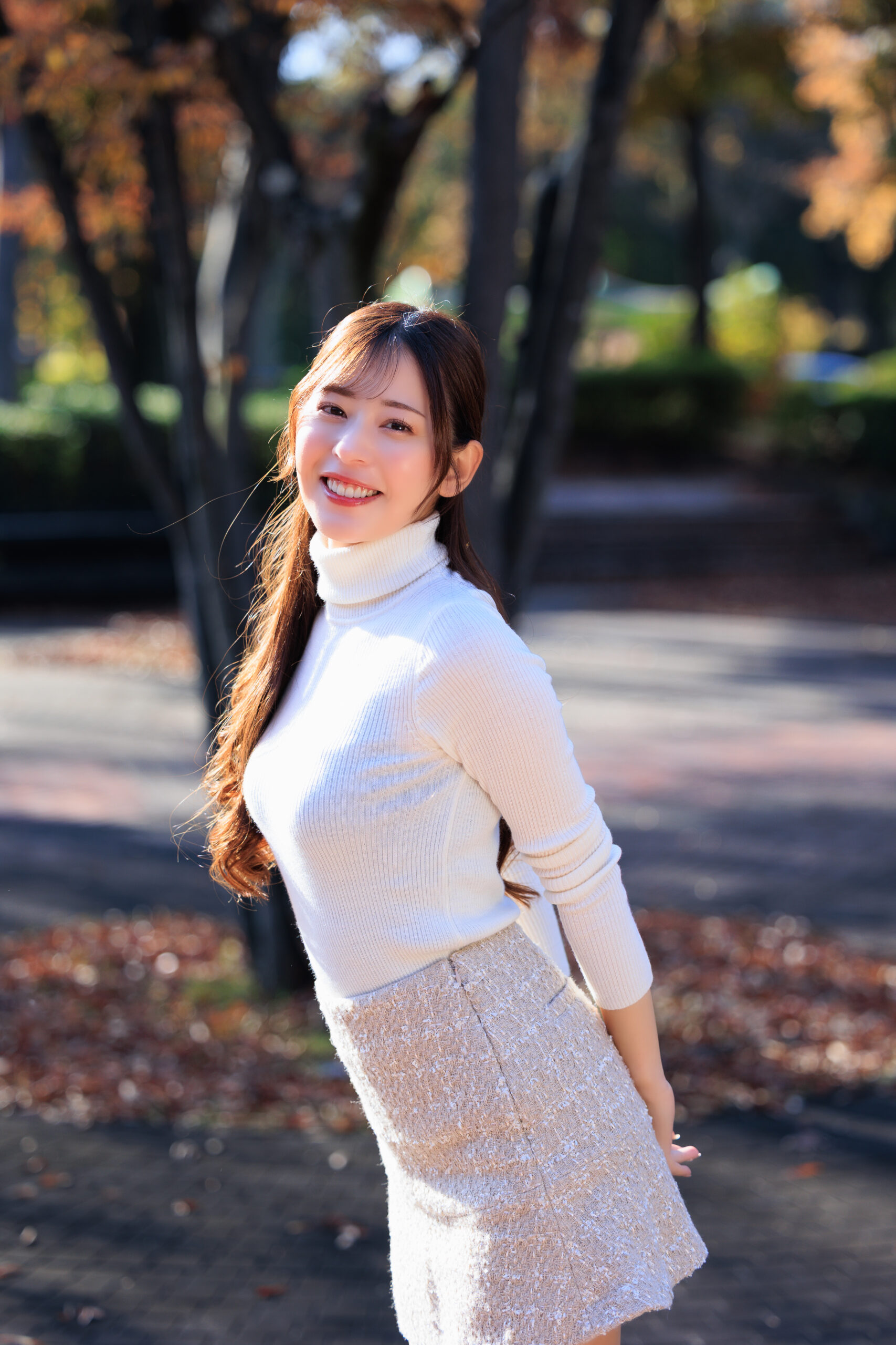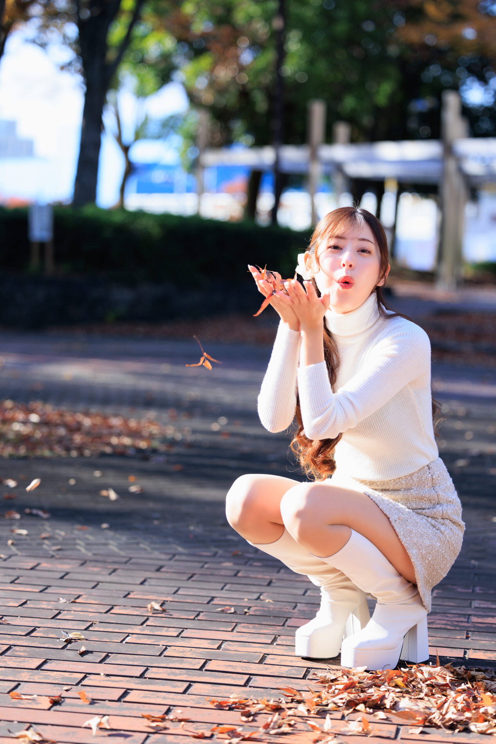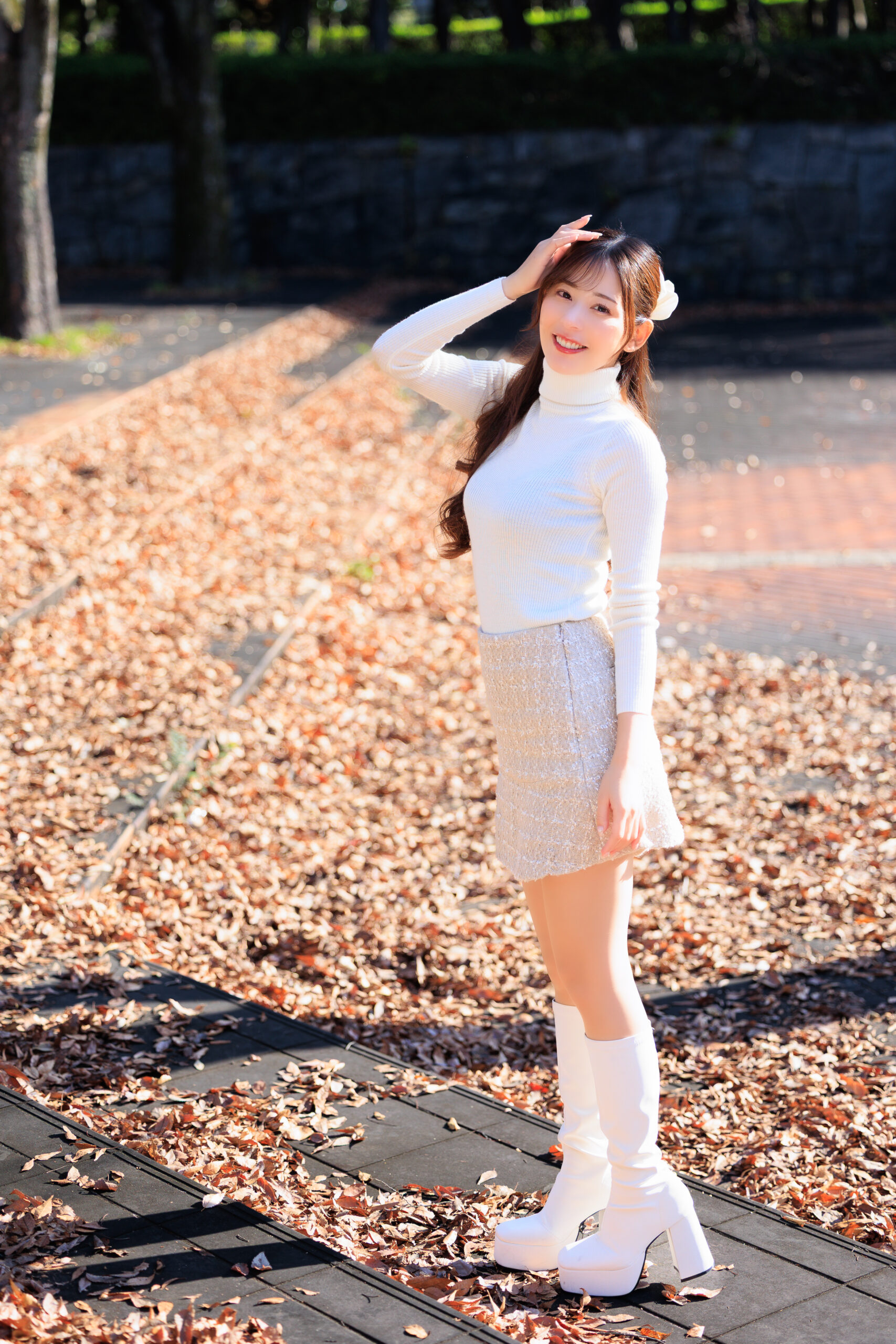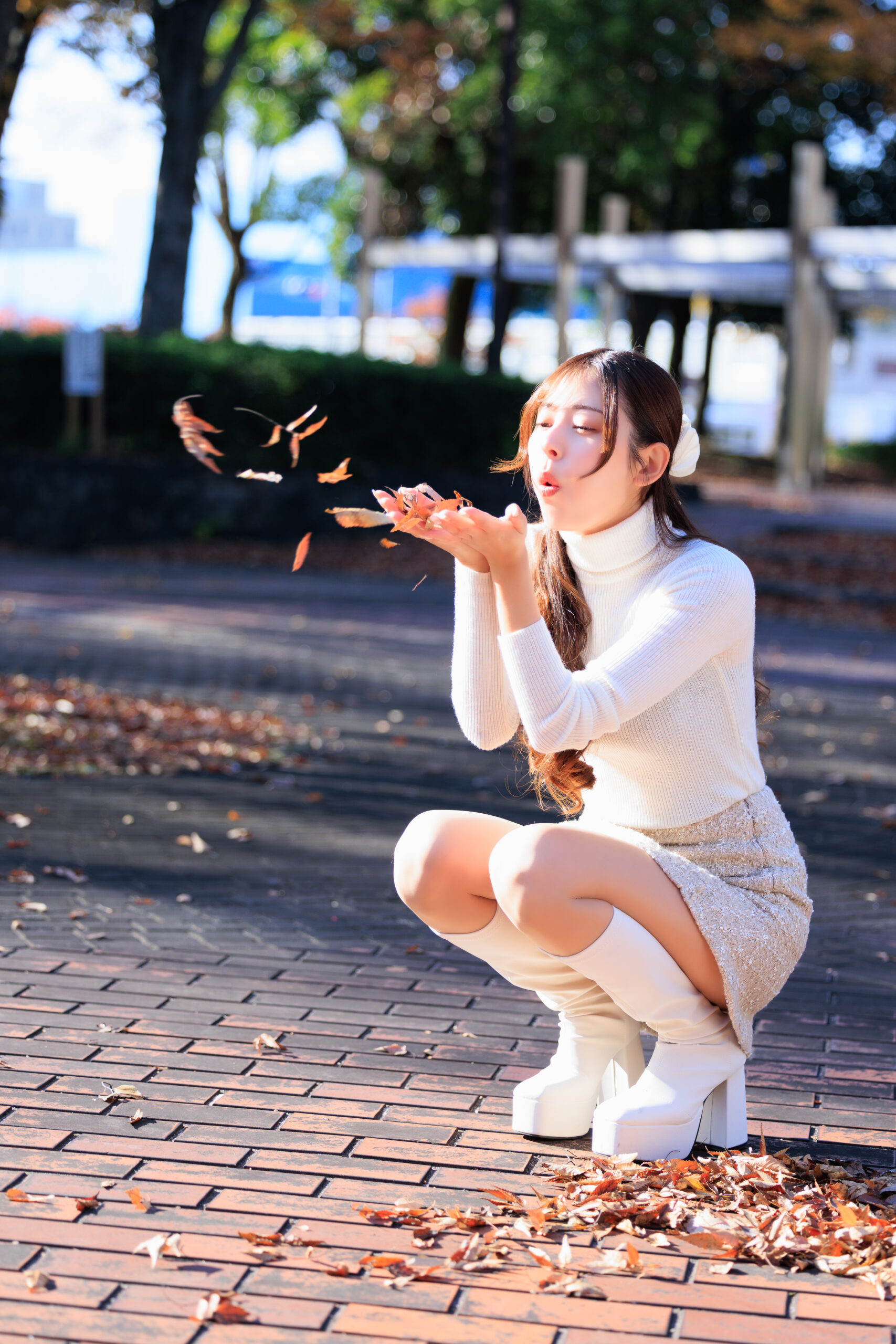 落ち葉に囲まれたやわらかい光の中で、ももちゃんの笑顔が本当にまっすぐで、見た瞬間に「あ、好きだな」って素直に思えるカット。