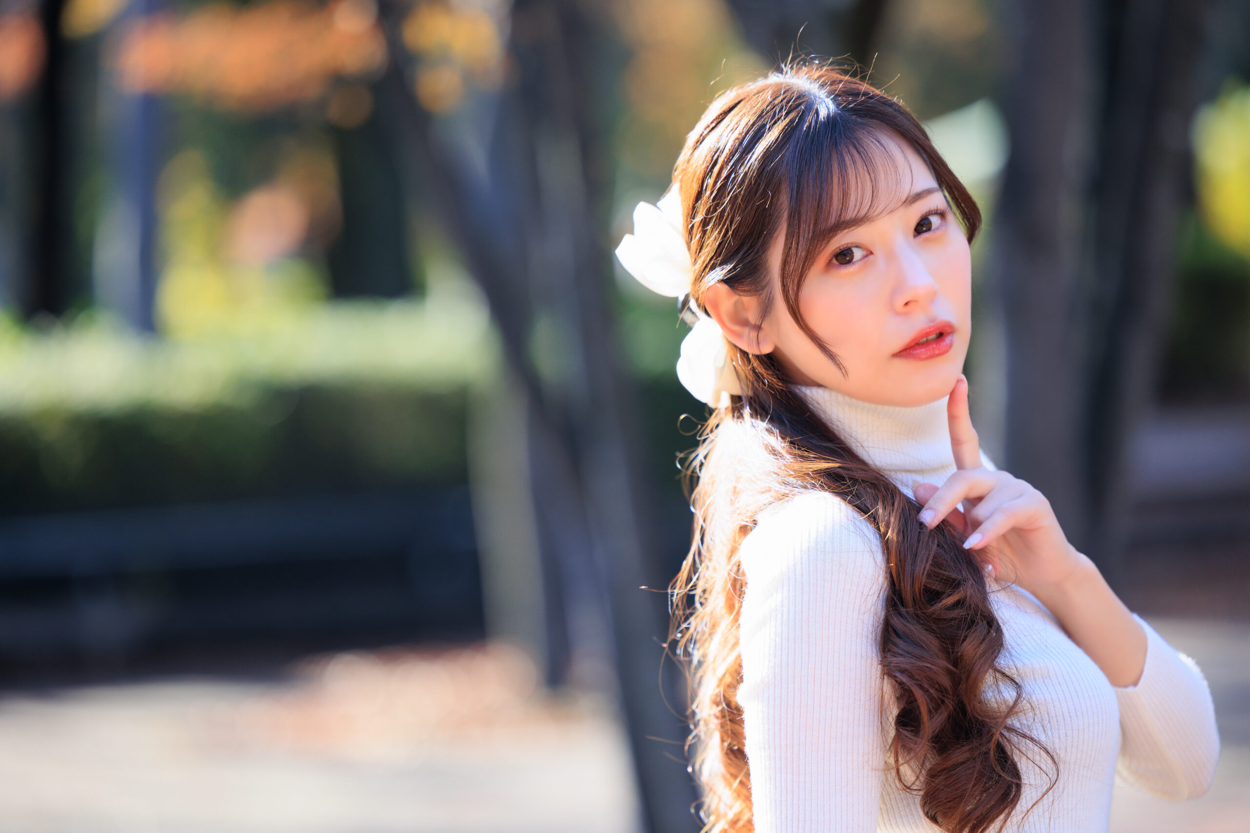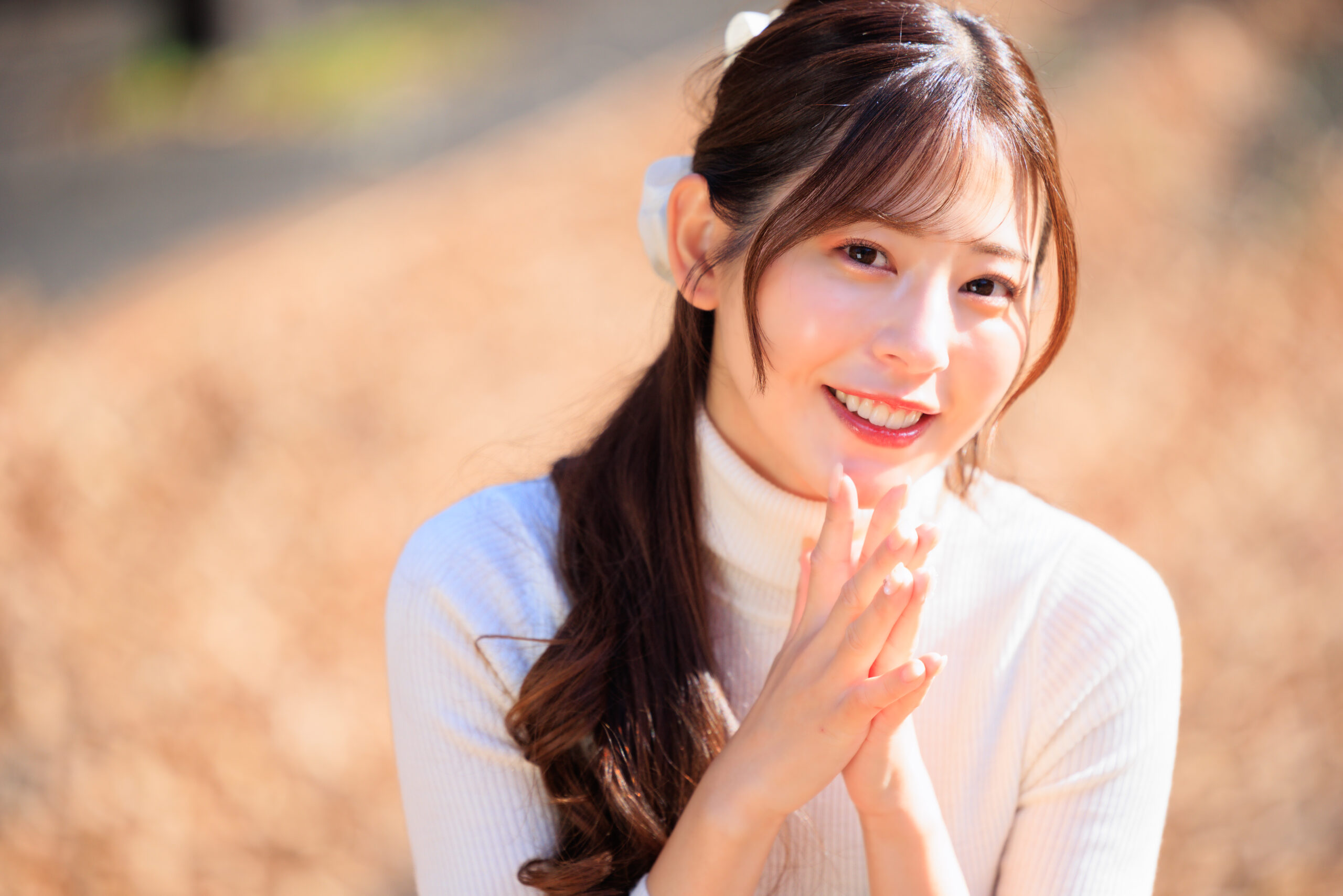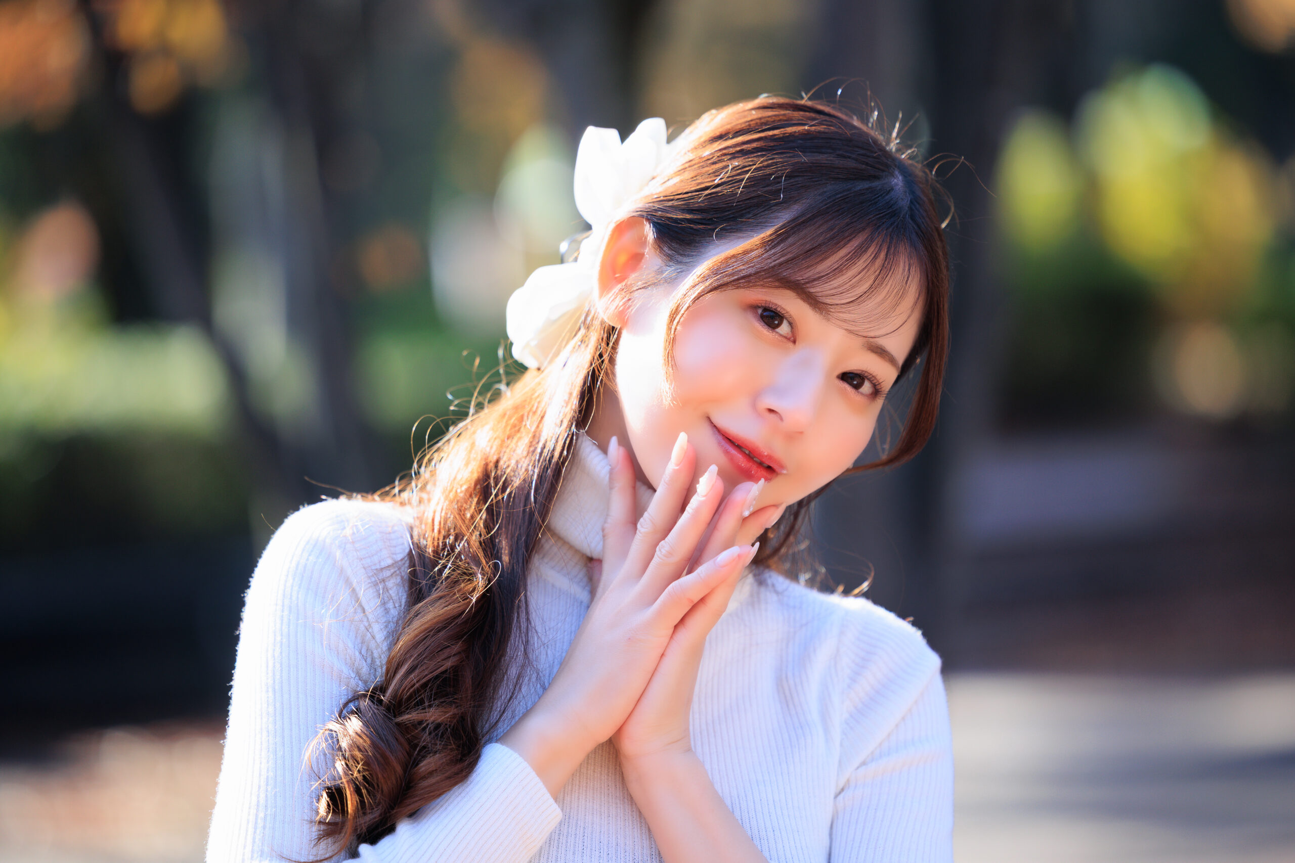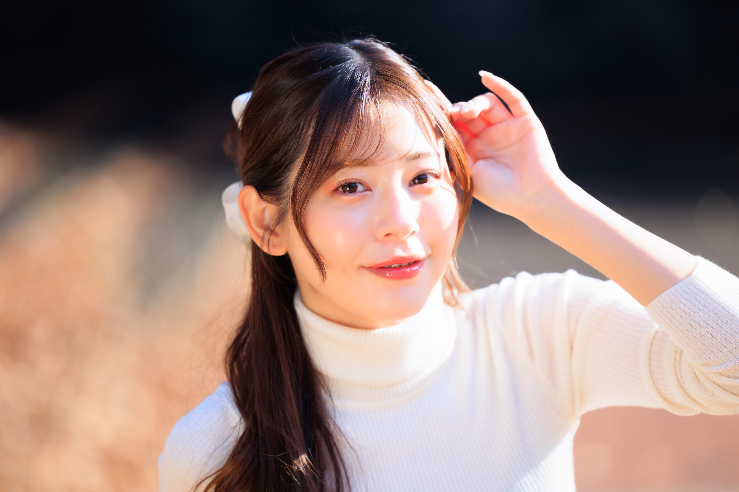 両手で髪にそっと触れる仕草がすごく自然で、ポーズを作っているというより、その場の空気を楽しんでいる感じ。白のニットも相まって、透明感とあたたかさが同時に伝わってきます。