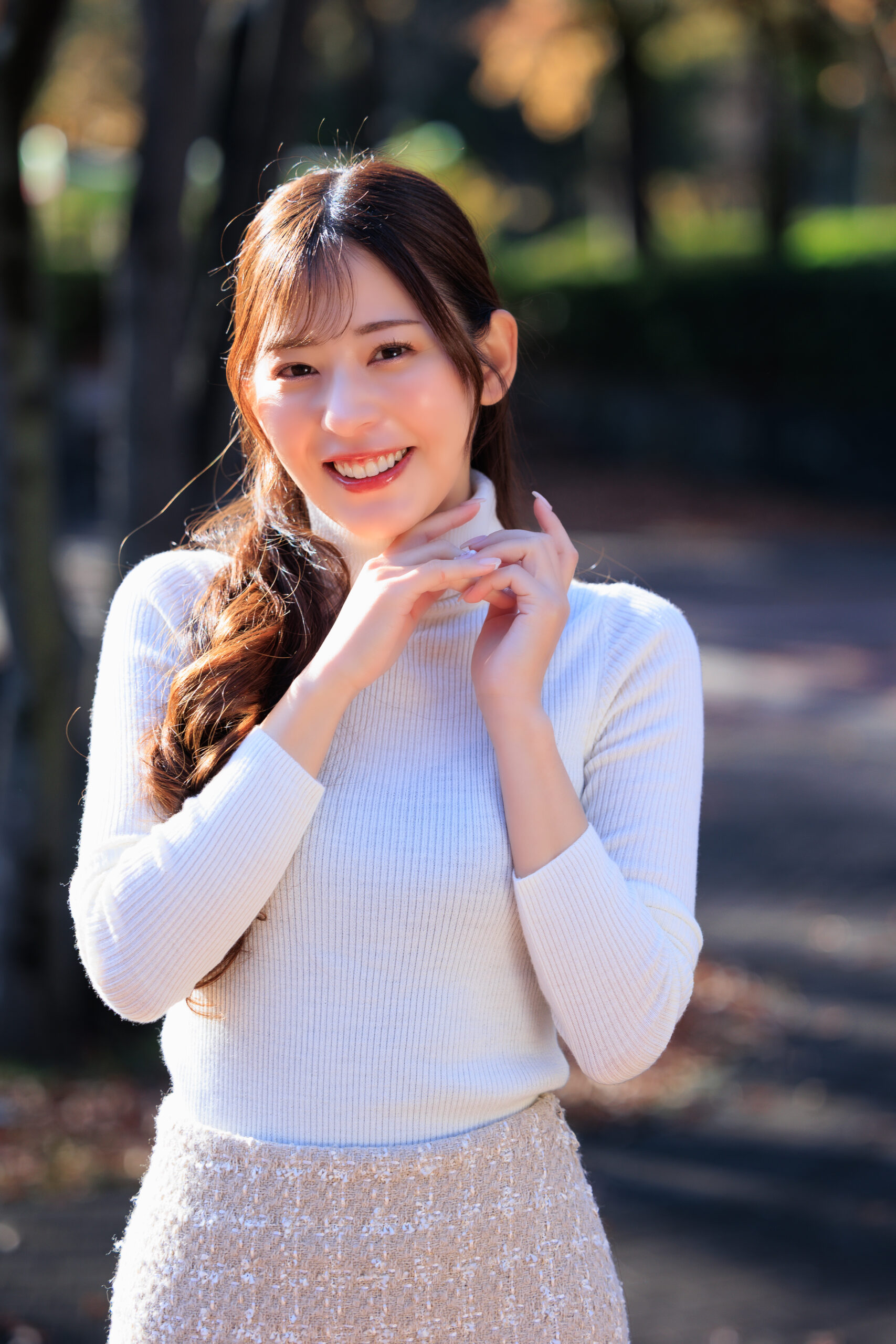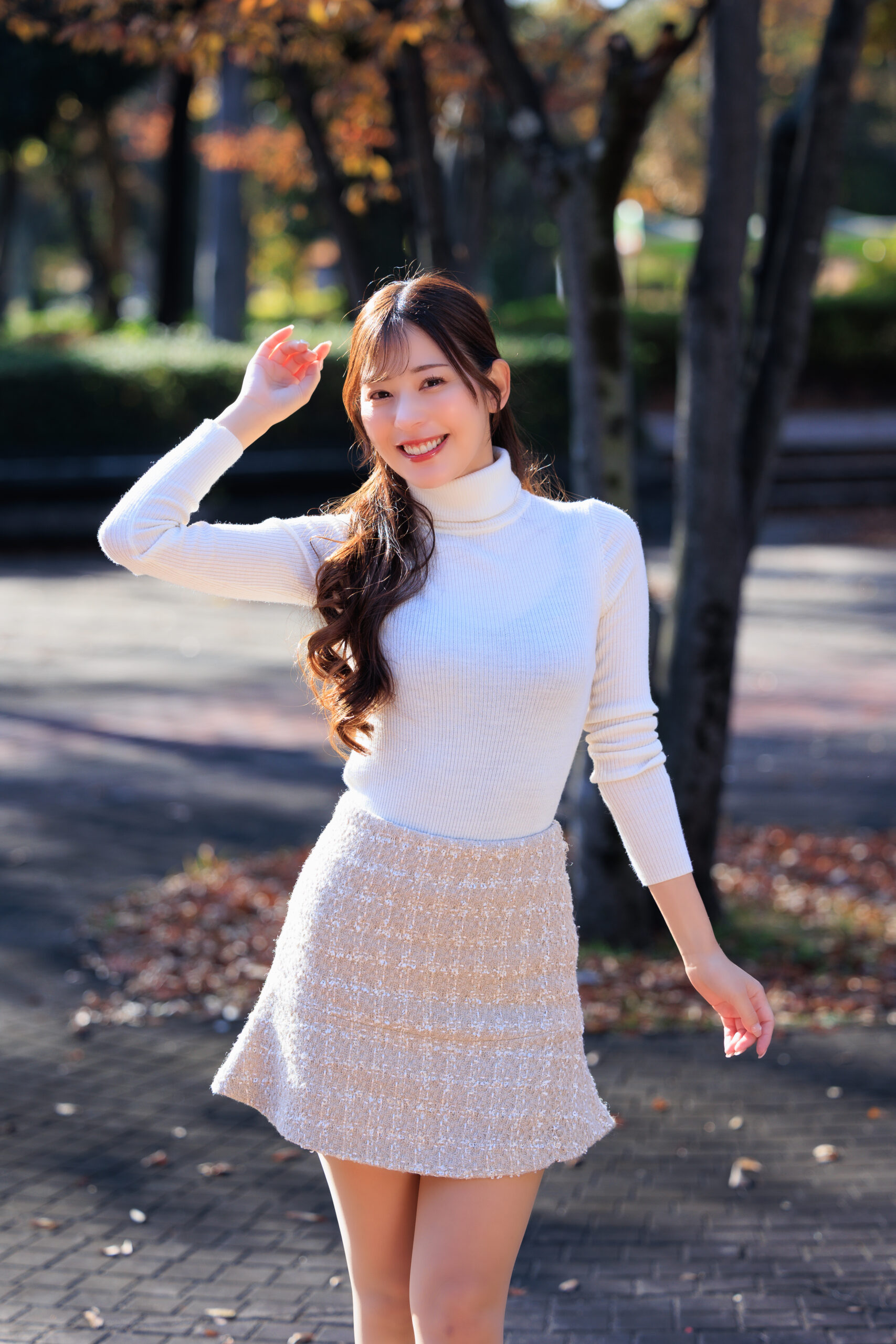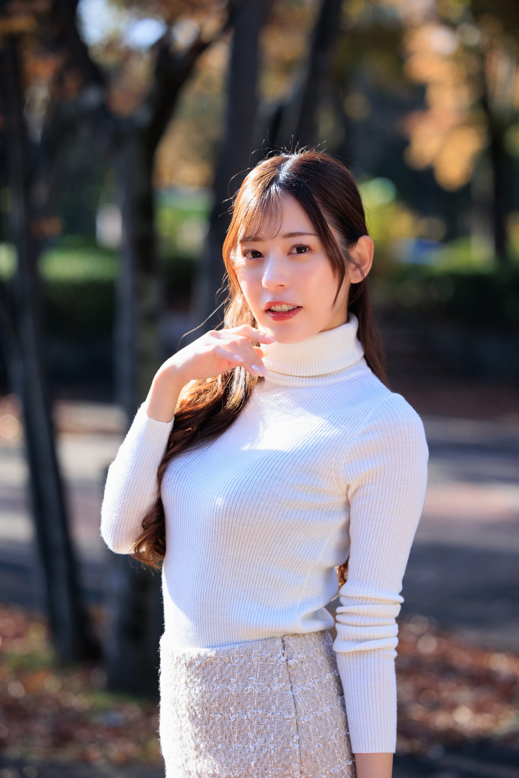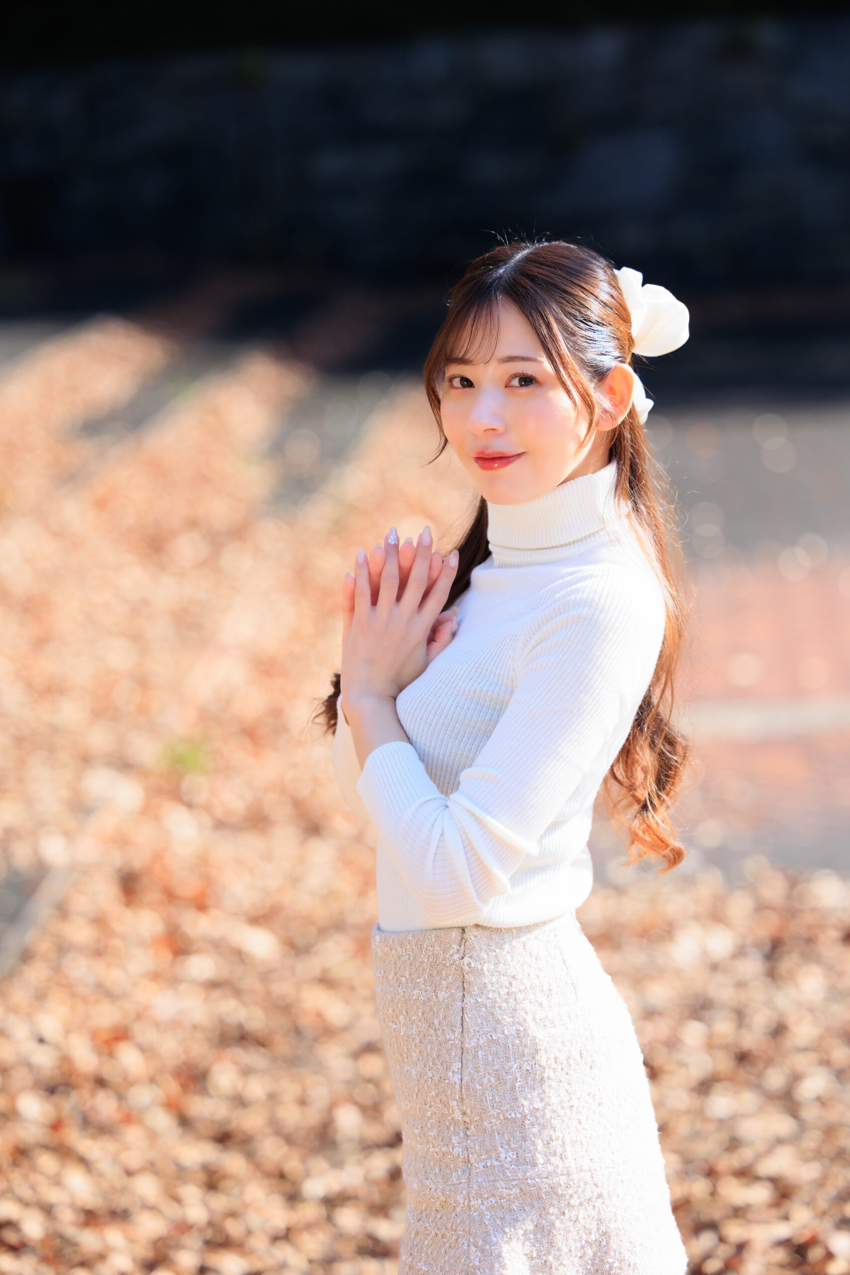 両手で髪にそっと触れる仕草がすごく自然で、ポーズを作っているというより、その場の空気を楽しんでいる感じ。白のニットも相まって、透明感とあたたかさが同時に伝わってきます。