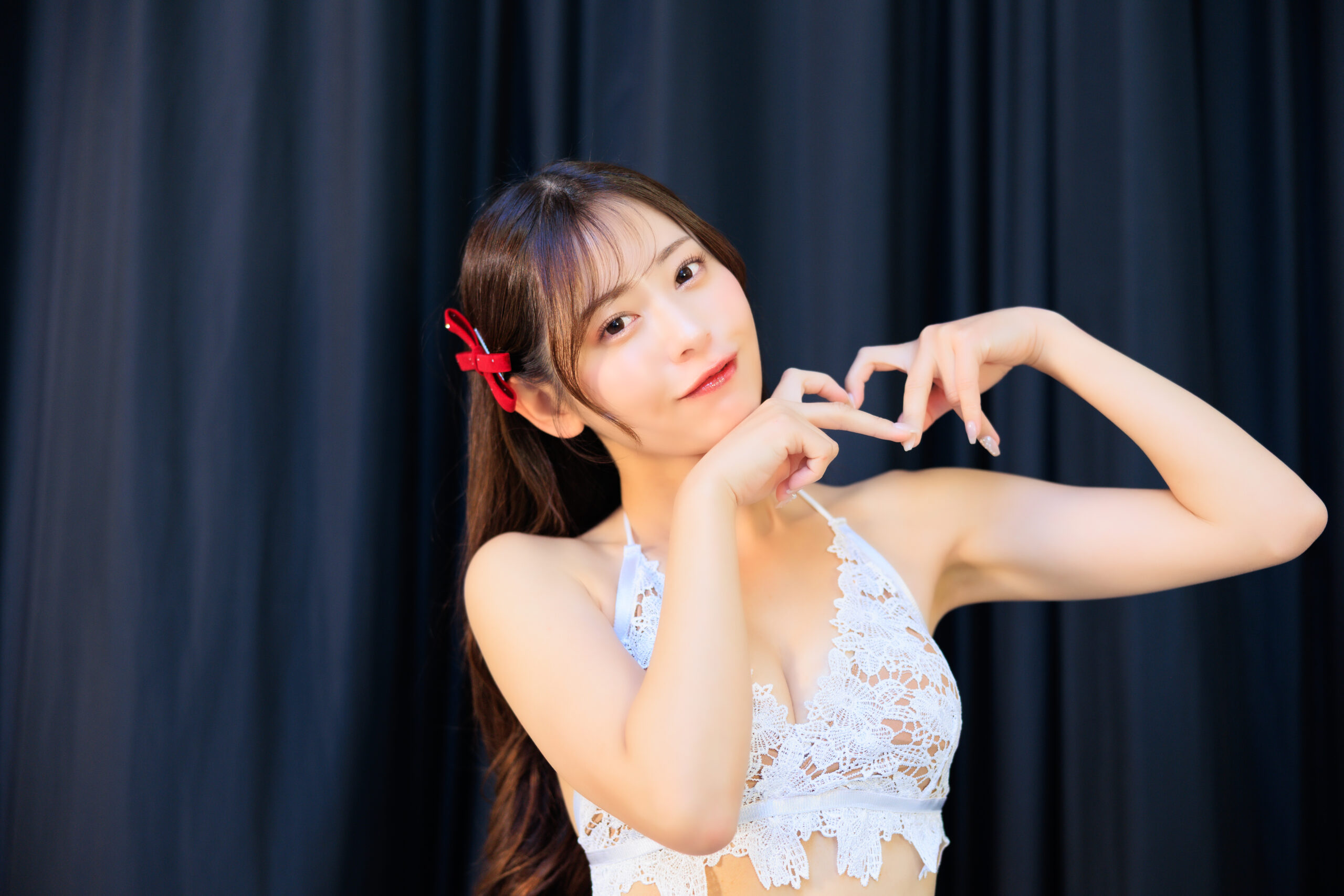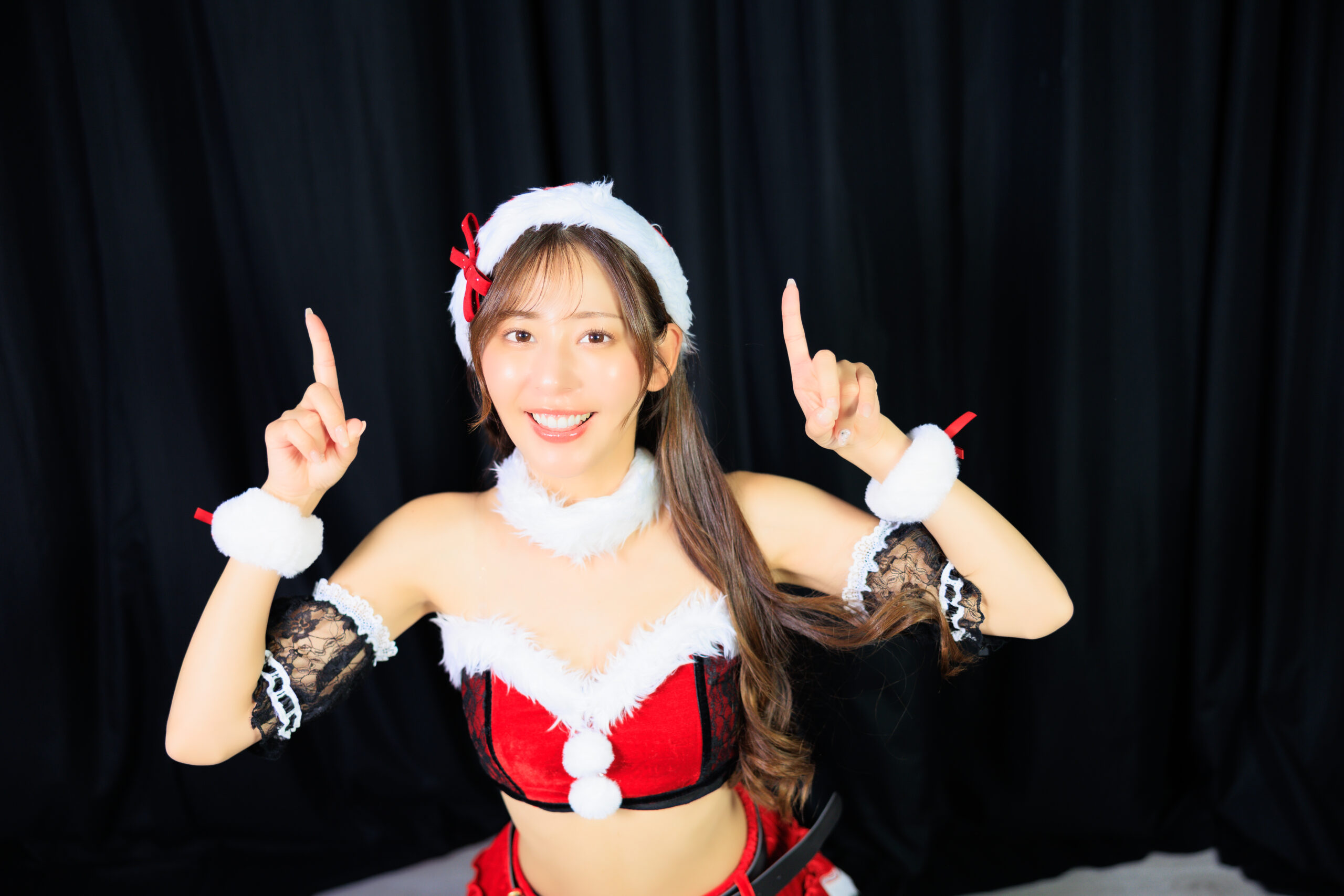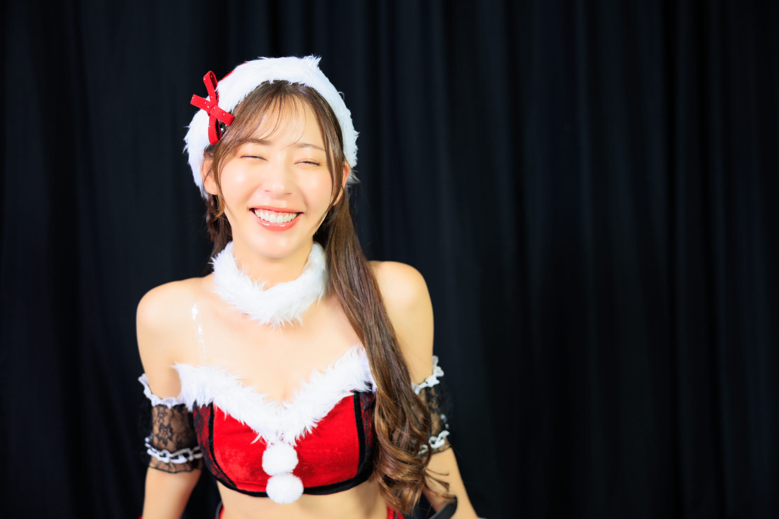 何より印象的なのは、その無邪気で柔らかい笑顔。可愛らしさが前面に出ていながらも、表情や視線には落ち着きがあって、ただの「可愛い」だけで終わらないのがももちゃんらしいところ。黒背景に赤いサンタコスが映え、表情の明るさがより際立っています。