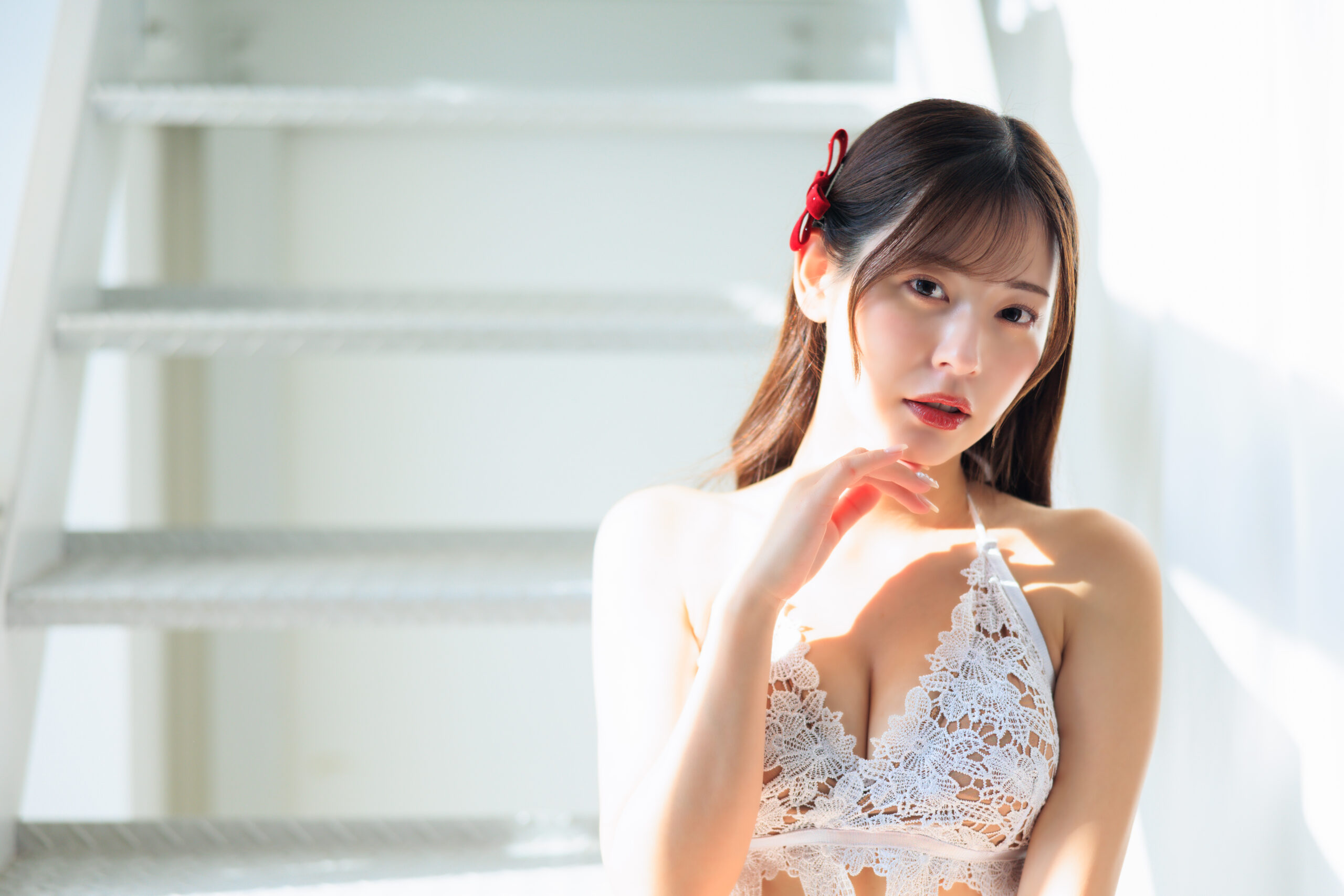白のレース水着の繊細さに、自然光がやさしく回り込み、肌の質感や表情がとても柔らかく写っています。視線を少し外した横顔気味の表情が印象的で、さっきのカットとはまた違う「静かな色気」を感じさせてくれます。