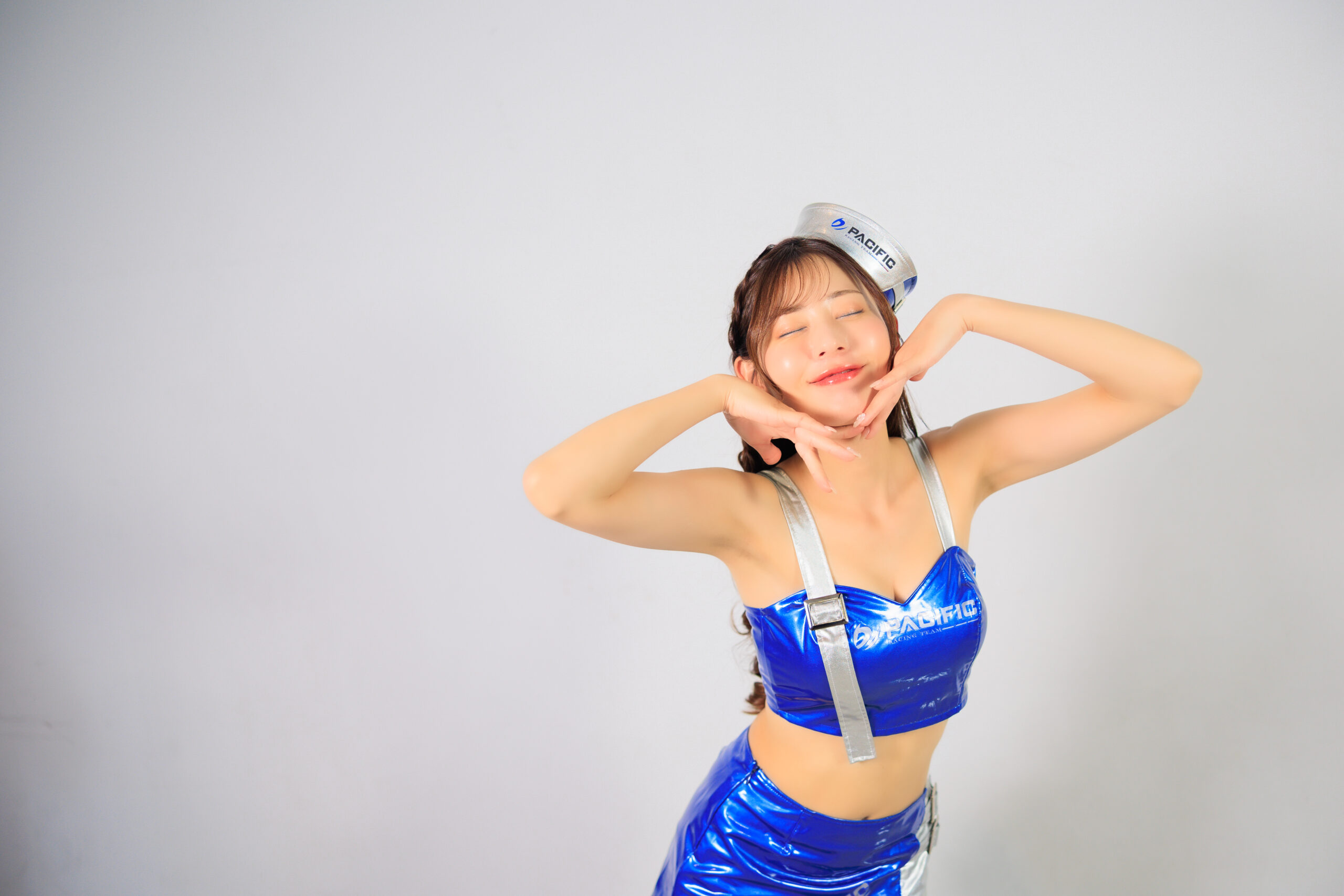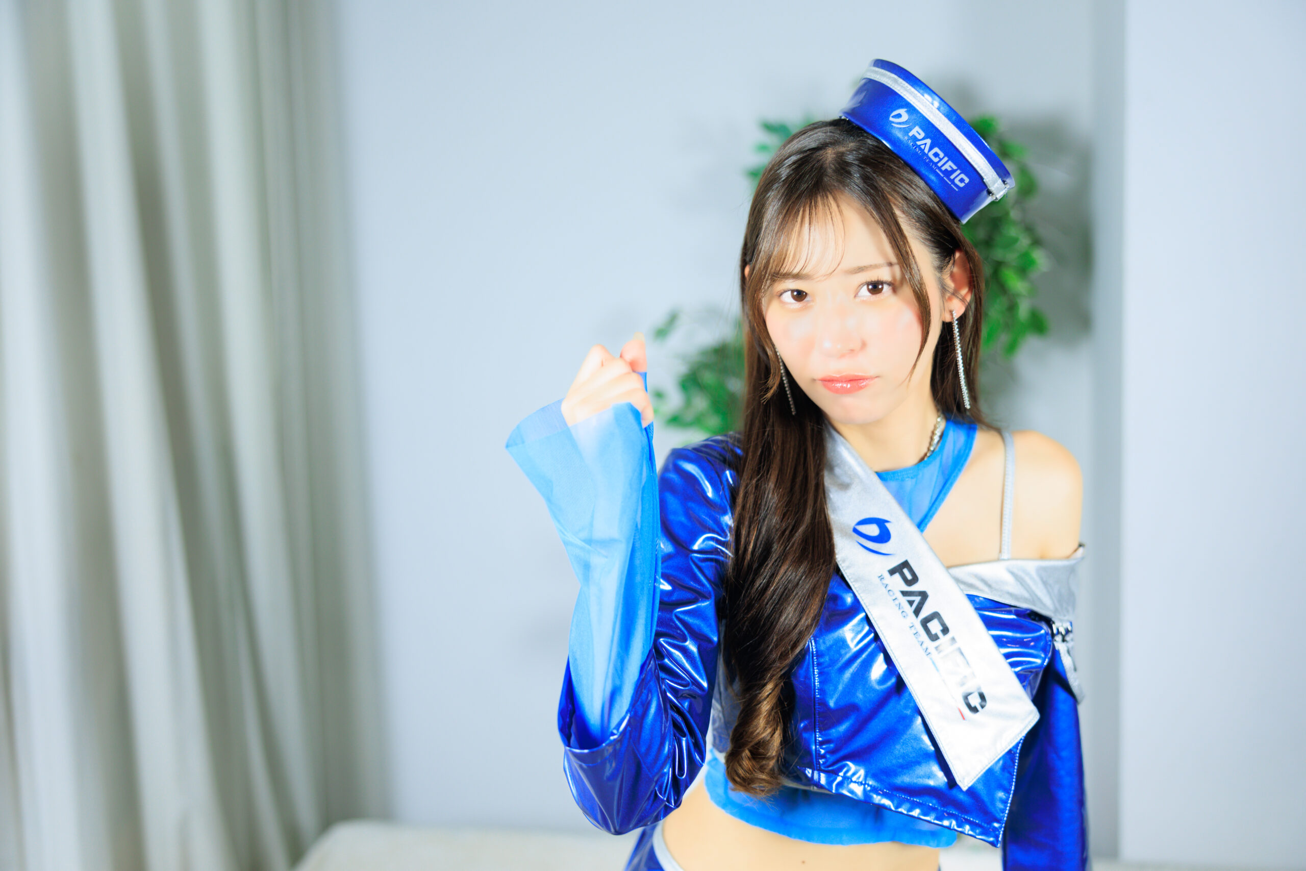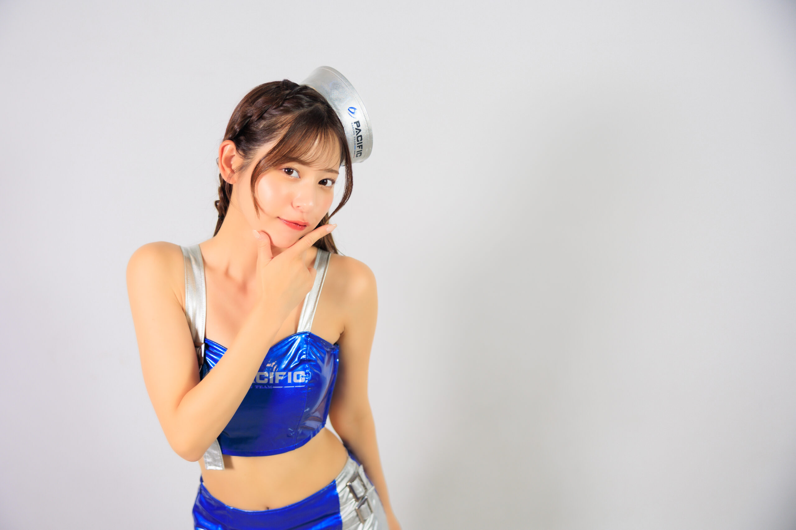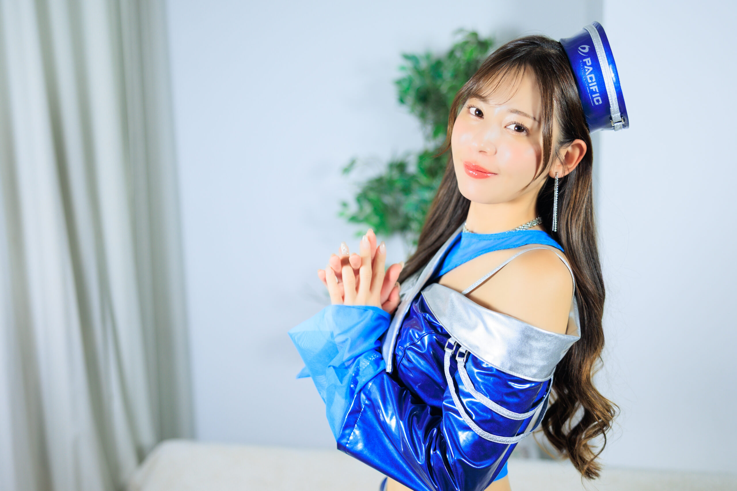 視線は真っ直ぐこちらを捉えつつも、力みすぎない自然さがあって、ももちゃんの“芯の強さ”と“柔らかさ”が同時に伝わってくる瞬間。ブルーのコスチュームが放つシャープな印象に、落ち着いた表情が重なり、Pacific Fairiesとしての完成度の高さを感じさせます。