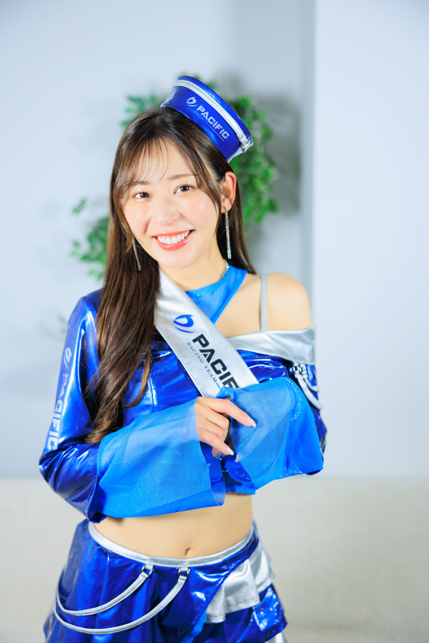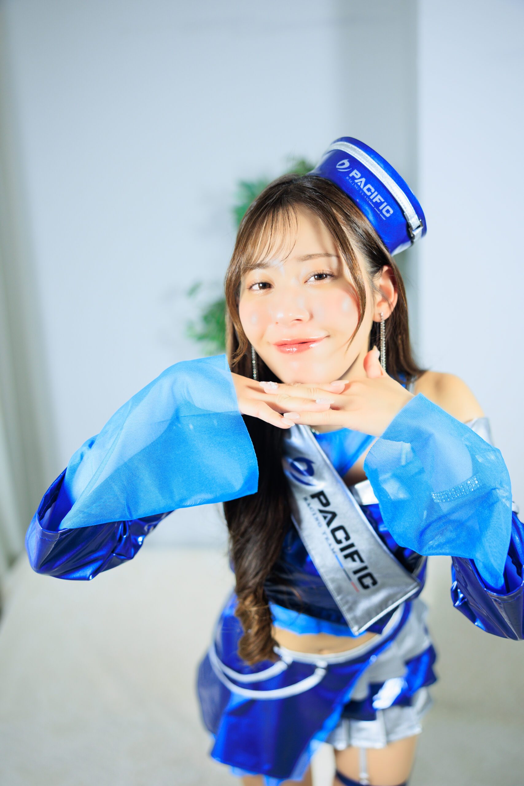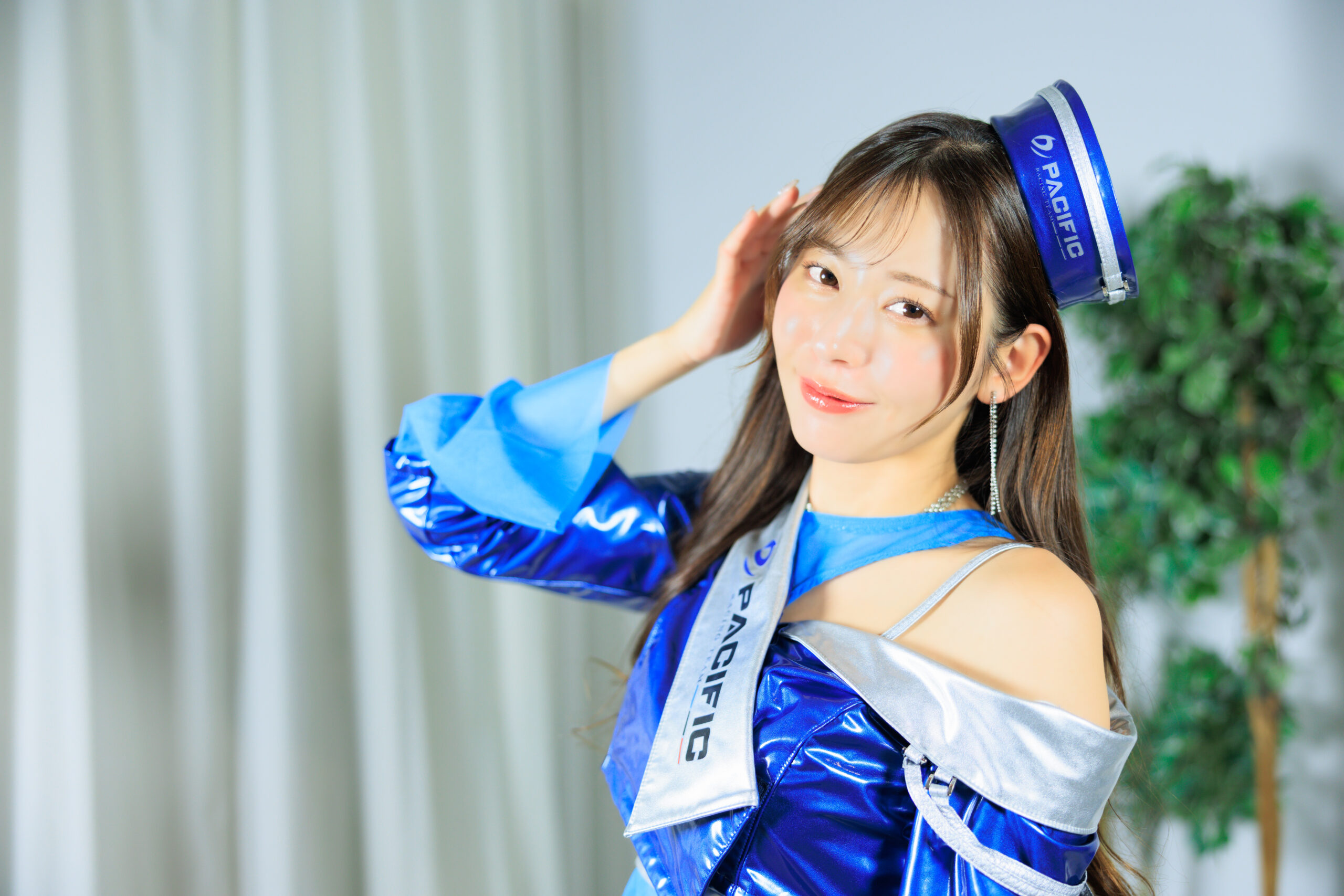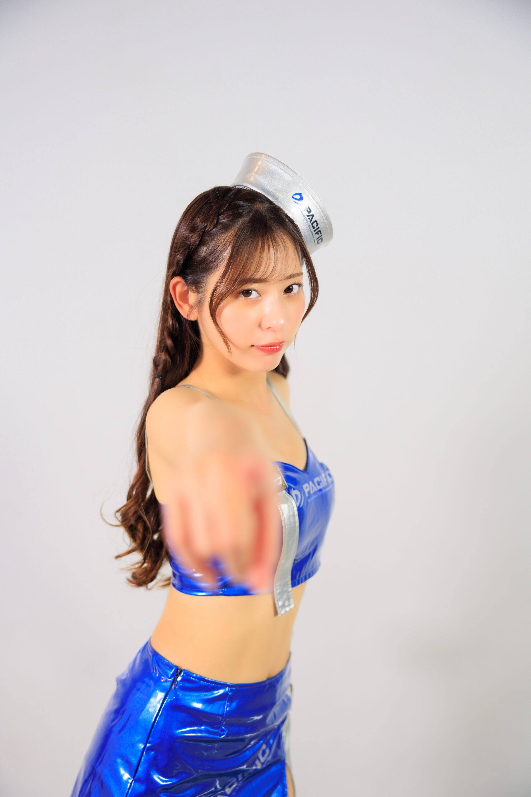 視線は真っ直ぐこちらを捉えつつも、力みすぎない自然さがあって、ももちゃんの“芯の強さ”と“柔らかさ”が同時に伝わってくる瞬間。ブルーのコスチュームが放つシャープな印象に、落ち着いた表情が重なり、Pacific Fairiesとしての完成度の高さを感じさせます。
