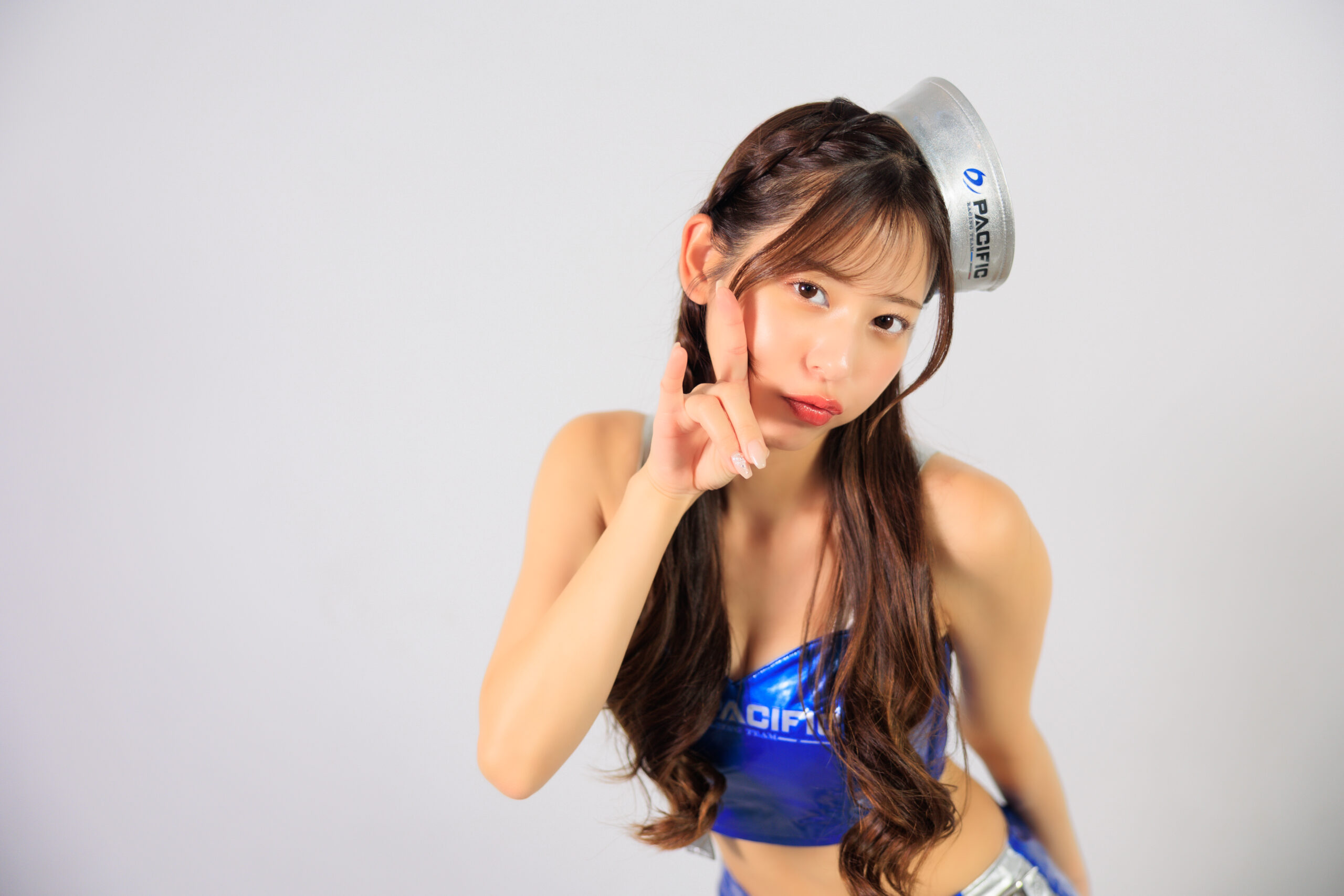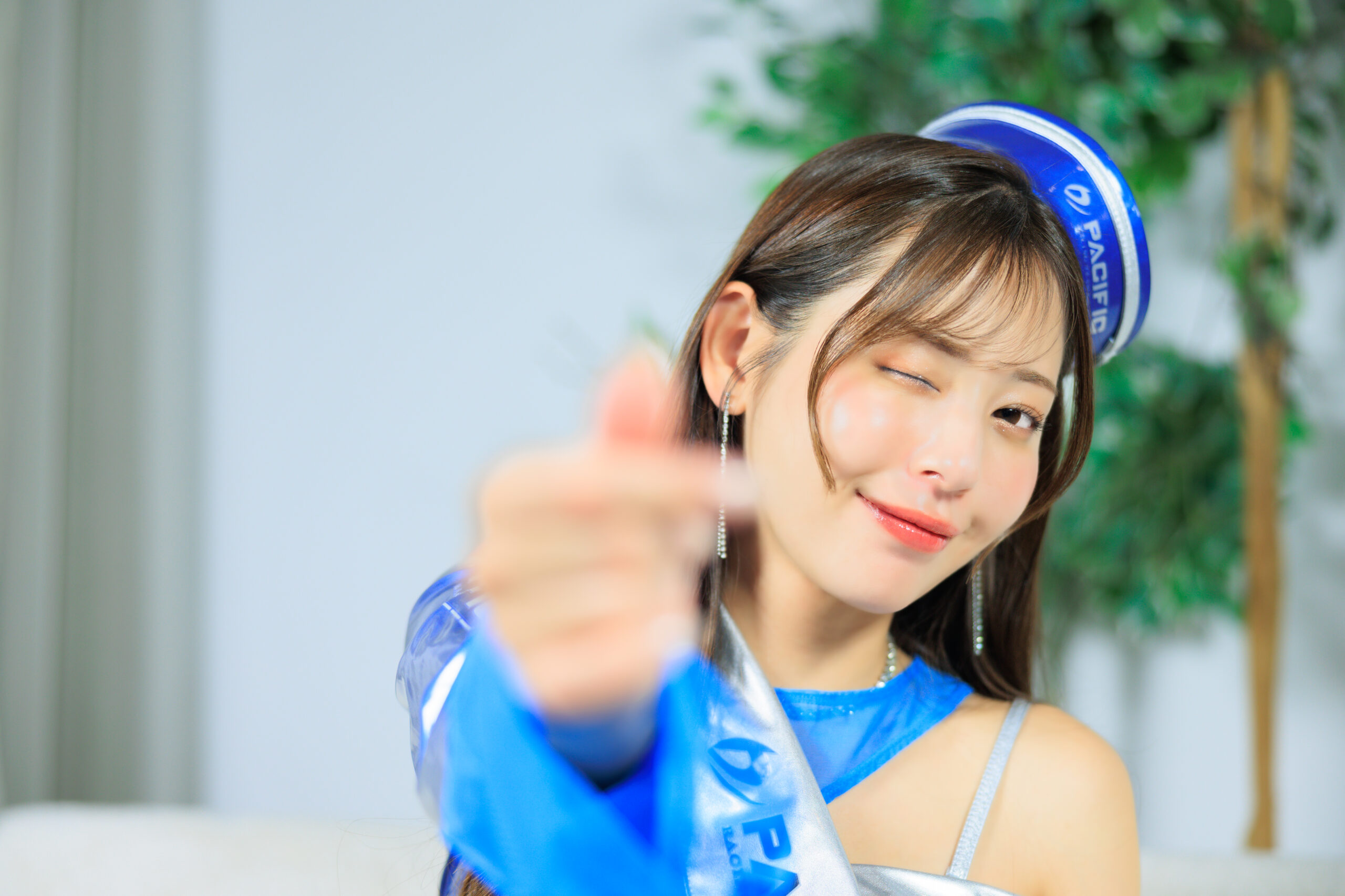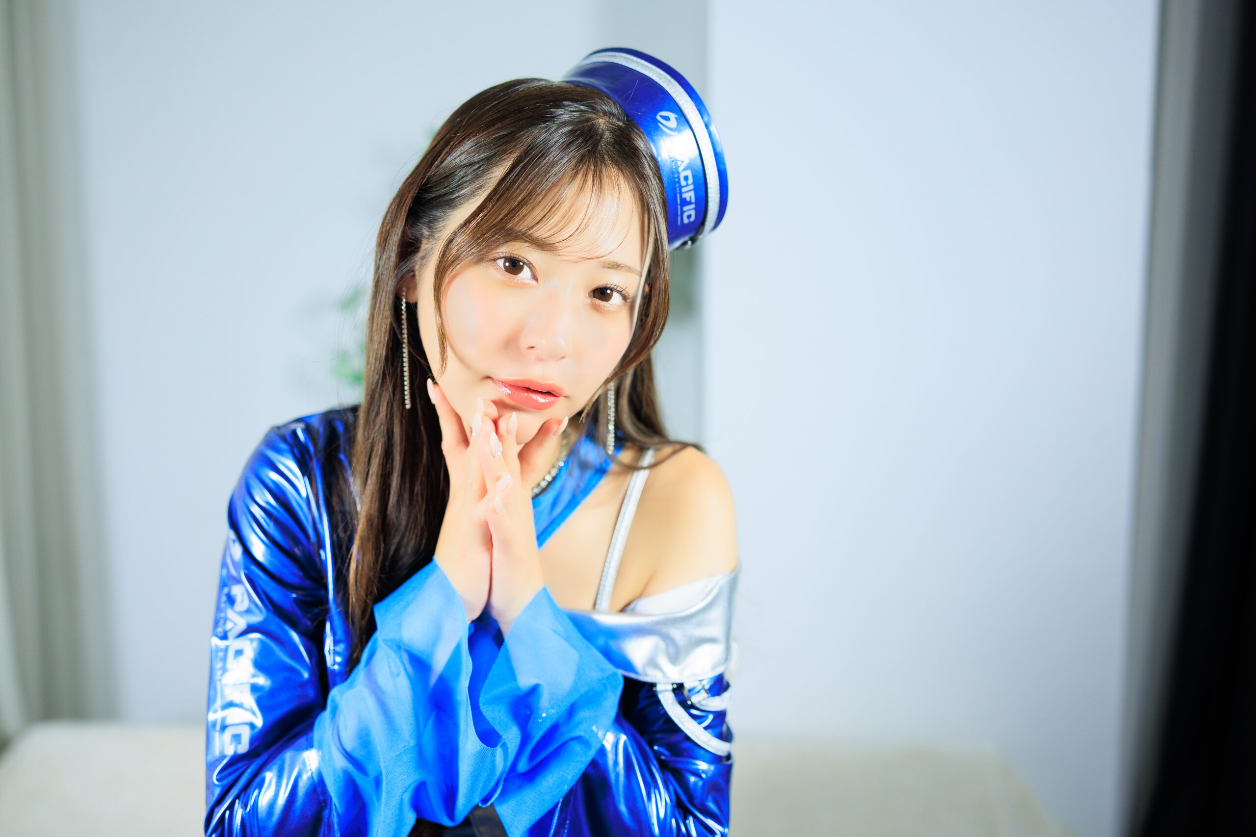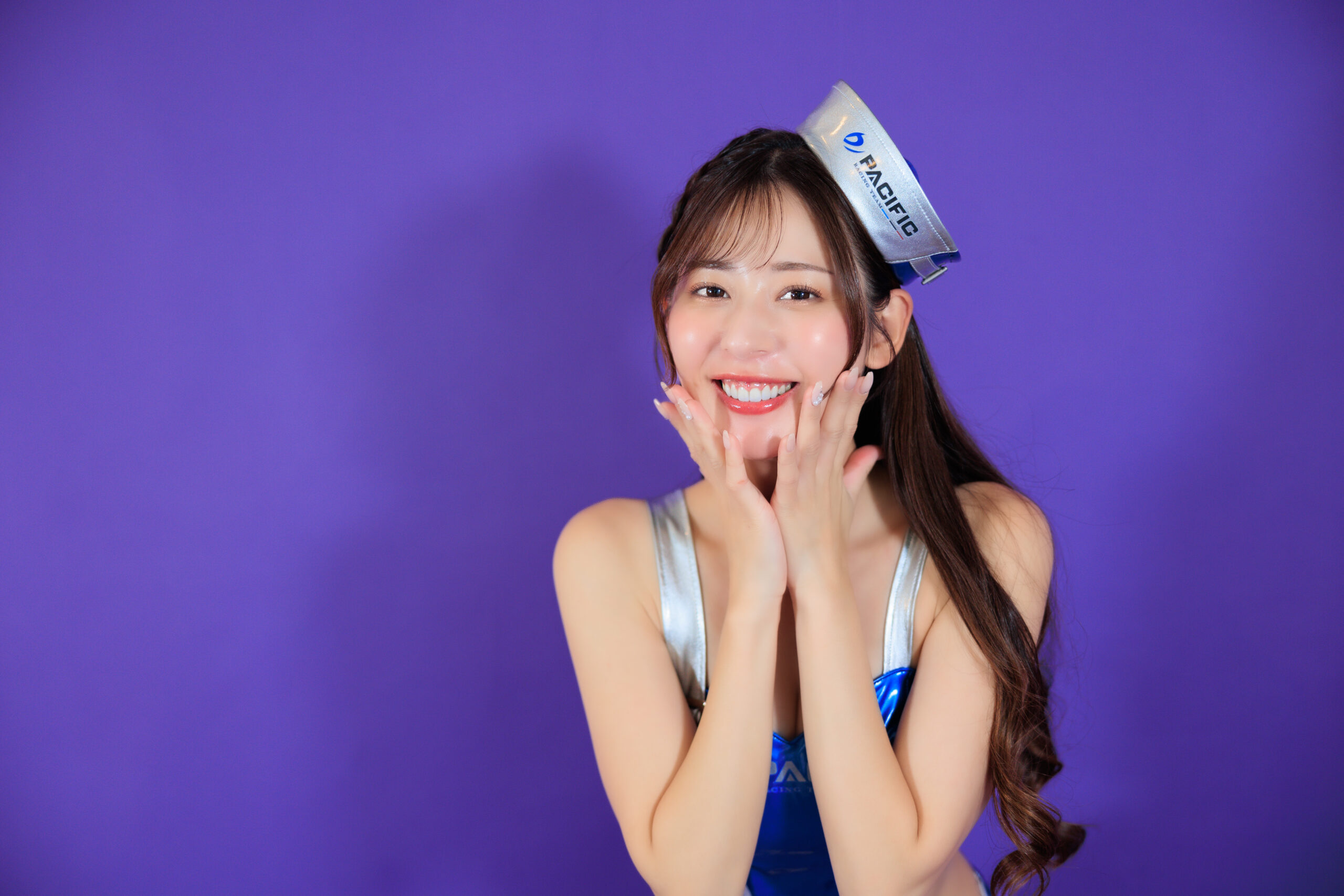 視線は真っ直ぐこちらを捉えつつも、力みすぎない自然さがあって、ももちゃんの“芯の強さ”と“柔らかさ”が同時に伝わってくる瞬間。ブルーのコスチュームが放つシャープな印象に、落ち着いた表情が重なり、Pacific Fairiesとしての完成度の高さを感じさせます。