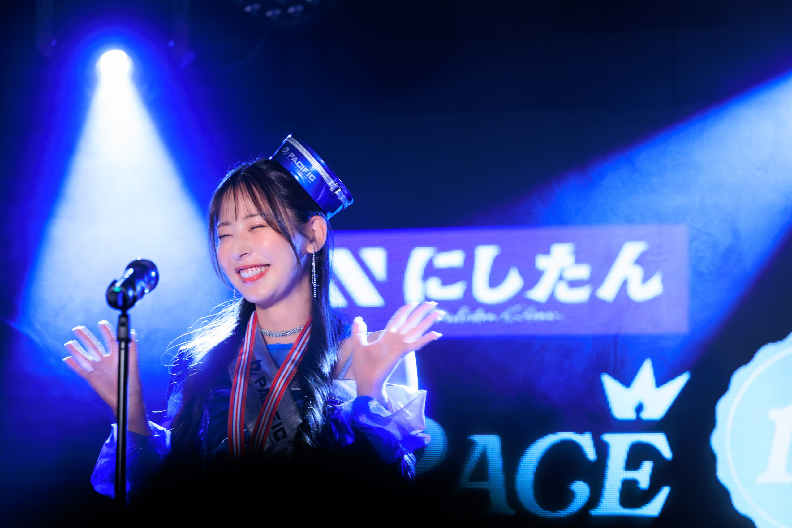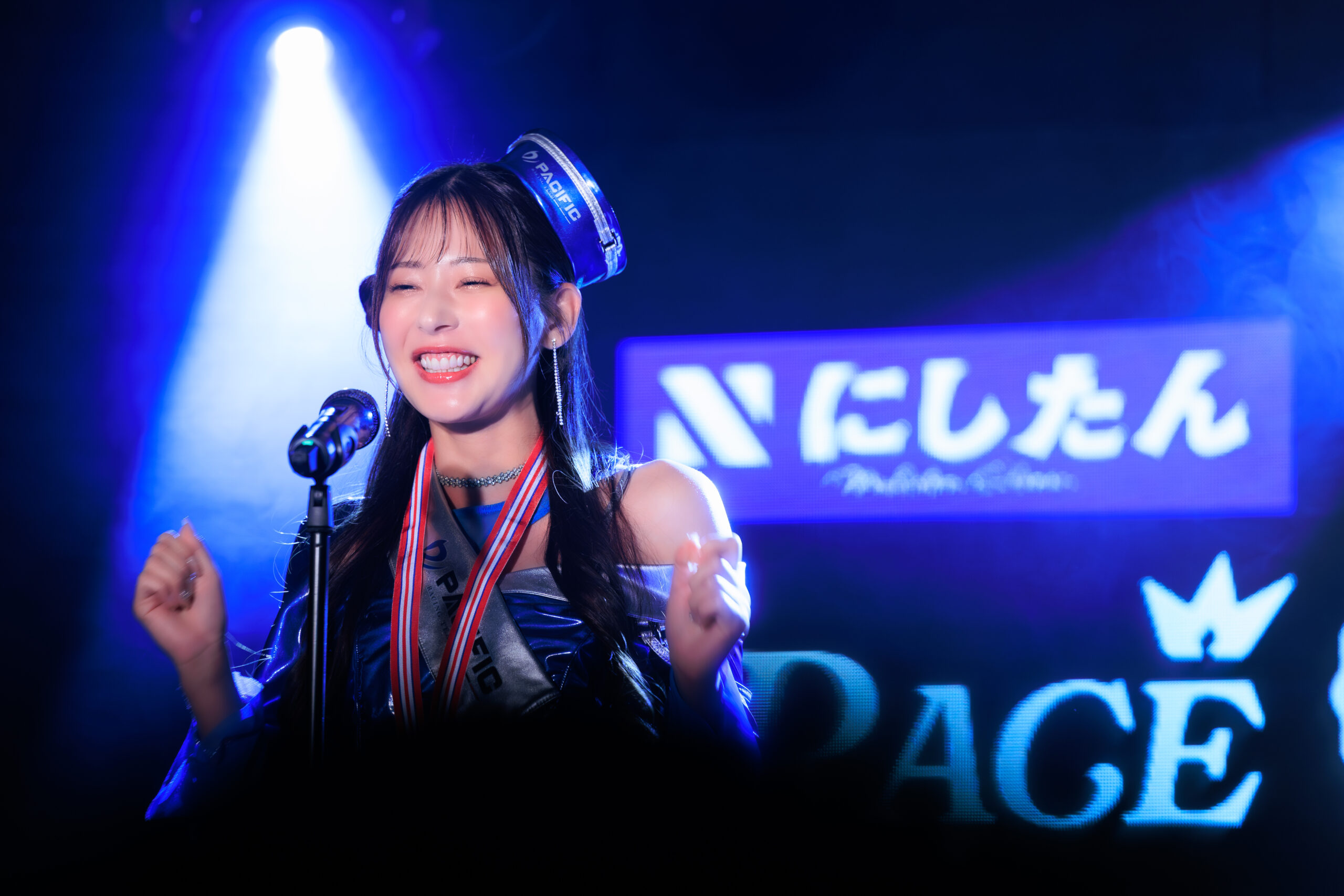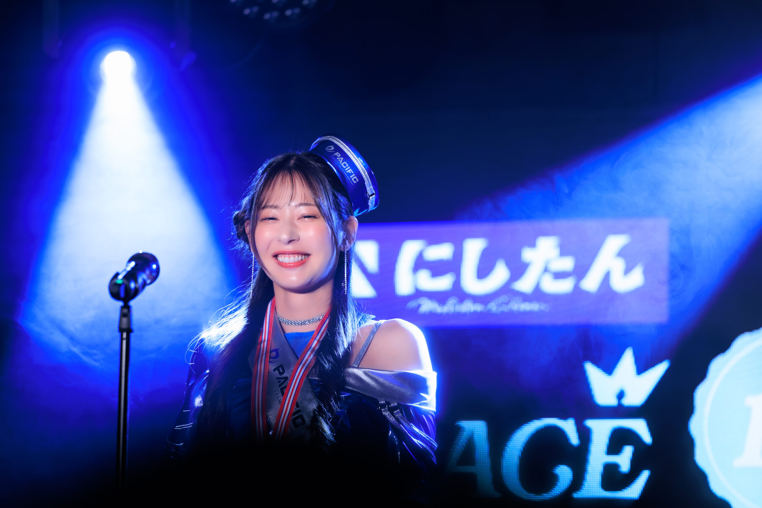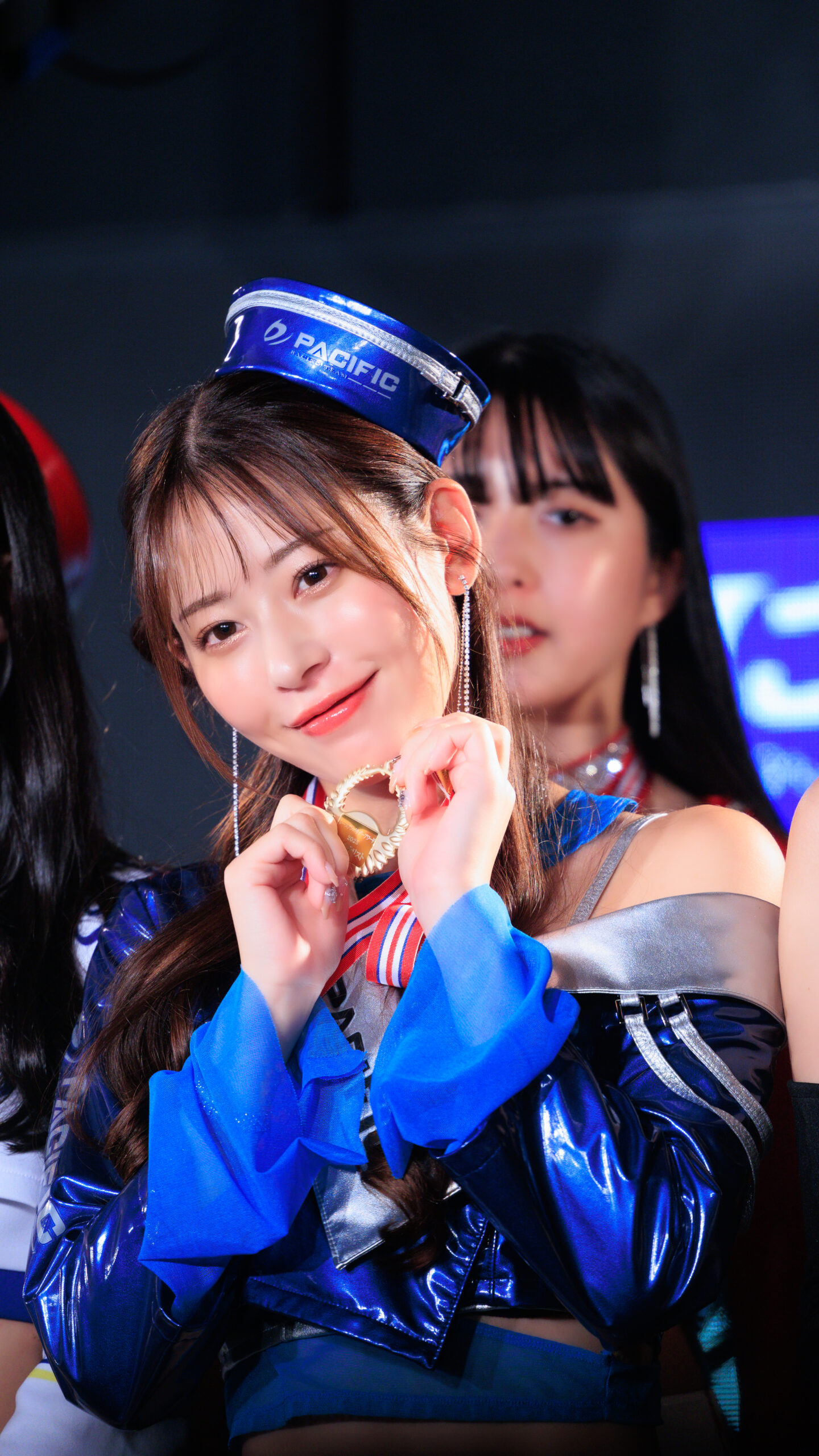 パシフィックブルーのコスチュームに身を包み、ステージライトを受けながら番号を掲げる姿は、まさにファイナリストそのもの。でも決して気負いすぎず、手を振る仕草や優しい笑顔からは、ファンを大切にするももちゃんの人柄がにじみ出ています。